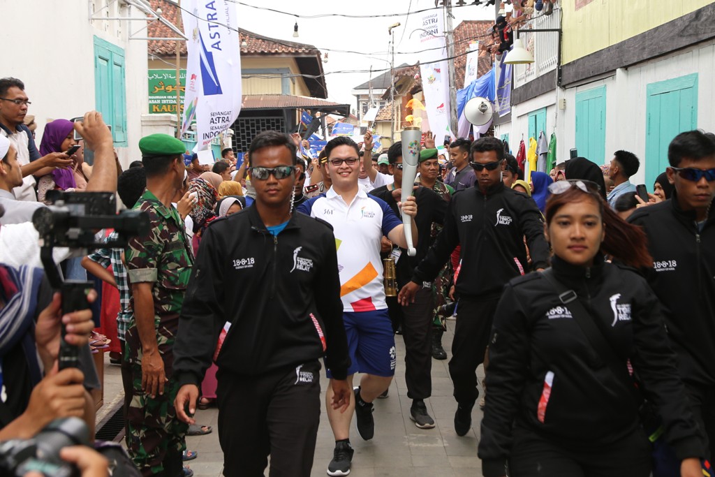 Ketua Koordinator Grup Astra Wilayah Palembang Nico Kwee membawa api obor melewati Kampung Berseri Astra Palembang dalam rangkaian pawai obor Asian Games 2018 di Palembang, Sumatera Selatan, Sabtu (4/8). Dengan potensi wisata yang begitu besar, PT Astra International Tbk membina Kampung Berseri Astra (KBA) di Kelurahan 13 Ulu sejak Agustus 2017. Secara berkala, Astra fokus mengembangkan empat bidang, yaitu bidang kesehatan, pendidikan, lingkungan, dan kewirausahaan. AKTUAL/Astra
