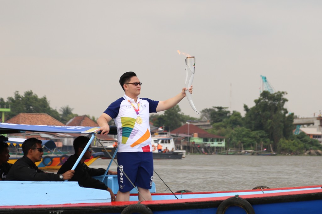 Ketua Koordinator Grup Astra Wilayah Palembang Nico Kwee membawa obor menaiki perahu di Sungai Musi usai melewati Kampung Berseri Astra Palembang pada pawai obor Asian Games 2018 di Palembang, Sumatera Selatan, Sabtu (4/8). Dengan potensi wisata yang begitu besar, PT Astra International Tbk membina Kampung Berseri Astra (KBA) di Kelurahan 13 Ulu sejak Agustus 2017. Secara berkala, Astra fokus mengembangkan empat bidang, yaitu bidang kesehatan, pendidikan, lingkungan, dan kewirausahaan. AKTUAL/Astra