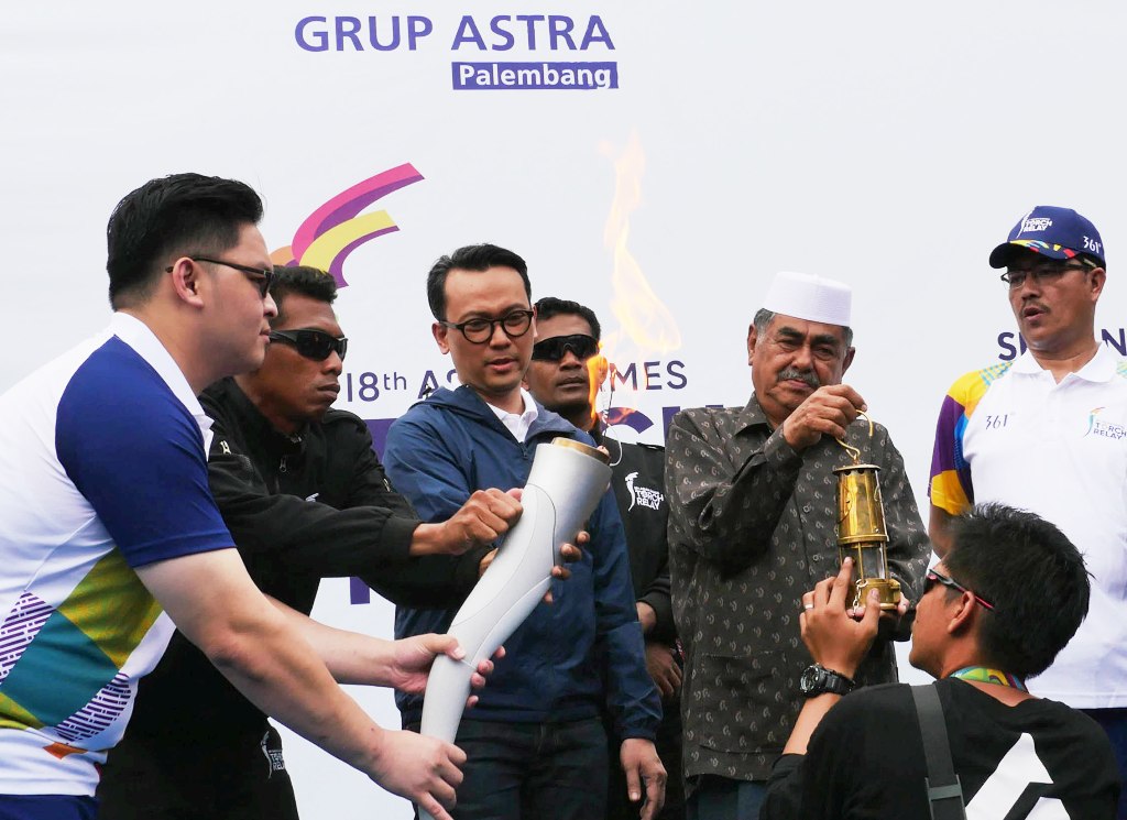 Head of Corporate Communications PT Astra International Tbk Boy Kelana Soebroto (ketiga kiri) didampingi Kepala Dinas Pemuda dan Olahraga Kota Palembang Ahmad Zazuli (kanan) dan Tokoh Masyarakat Kampung Berseri Astra Palembang Habib Ahmad Alkaff (kedua kanan) menyulut api obor yang akan dibawa lari oleh Ketua Koordinator Grup Astra Wilayah Palembang Nico Kwee (kiri) pada pawai obor Asian Games 2018 di Kampung Berseri Astra Palembang, Sumatera Selatan, Sabtu (4/8). Dengan potensi wisata yang begitu besar, PT Astra International Tbk membina Kampung Berseri Astra (KBA) di Kelurahan 13 Ulu sejak Agustus 2017. Secara berkala, Astra fokus mengembangkan empat bidang, yaitu bidang kesehatan, pendidikan, lingkungan, dan kewirausahaan. AKTUAL/Astra