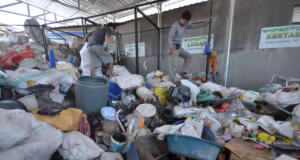 Petugas Bank Sampah Pusat Kota Makassar menata barang bekas layak daur ulang , Sulawesi Selatan, Jumat (4/3). PT Telkom Indonesia Devisi Regional Area VII Makassar, mencanangkan program kampung Usaha Kecil Menengah (UKM) Digital Lingkungan Hidup di Bank Sampah Pusat tersebut dengan penyediaan layanan teknologi informasi berupa Broadband Learning Centre (BCL) dan fasilitas akses internet berbasis WiFi (Wireless Fidelity) guna memudahkan para pemilik bank sampah dalam menjalankan proses bisnisnya sekligus meningkatkan pendapatan. ANTARA FOTO/Dewi Fajriani/nz/16