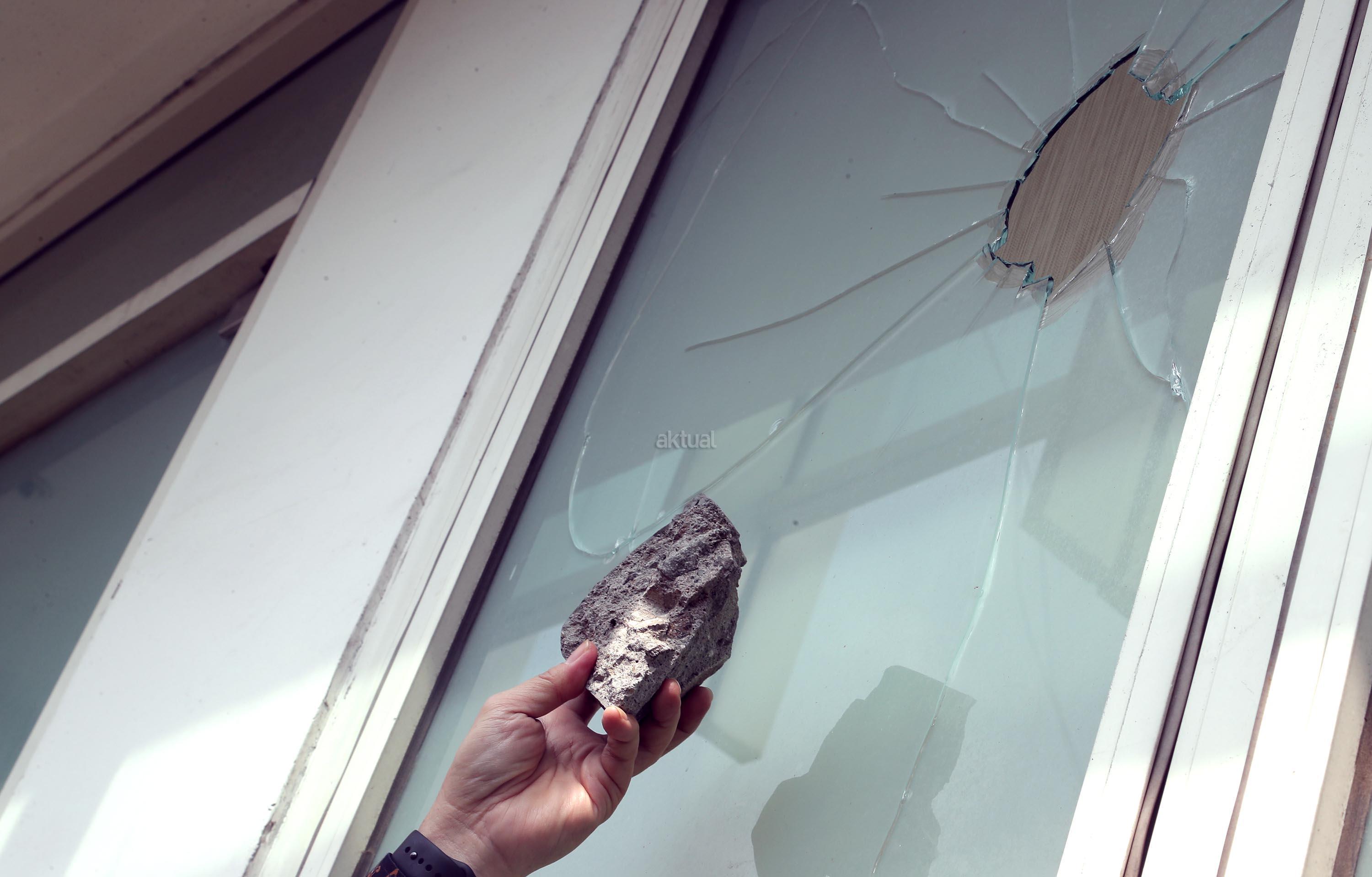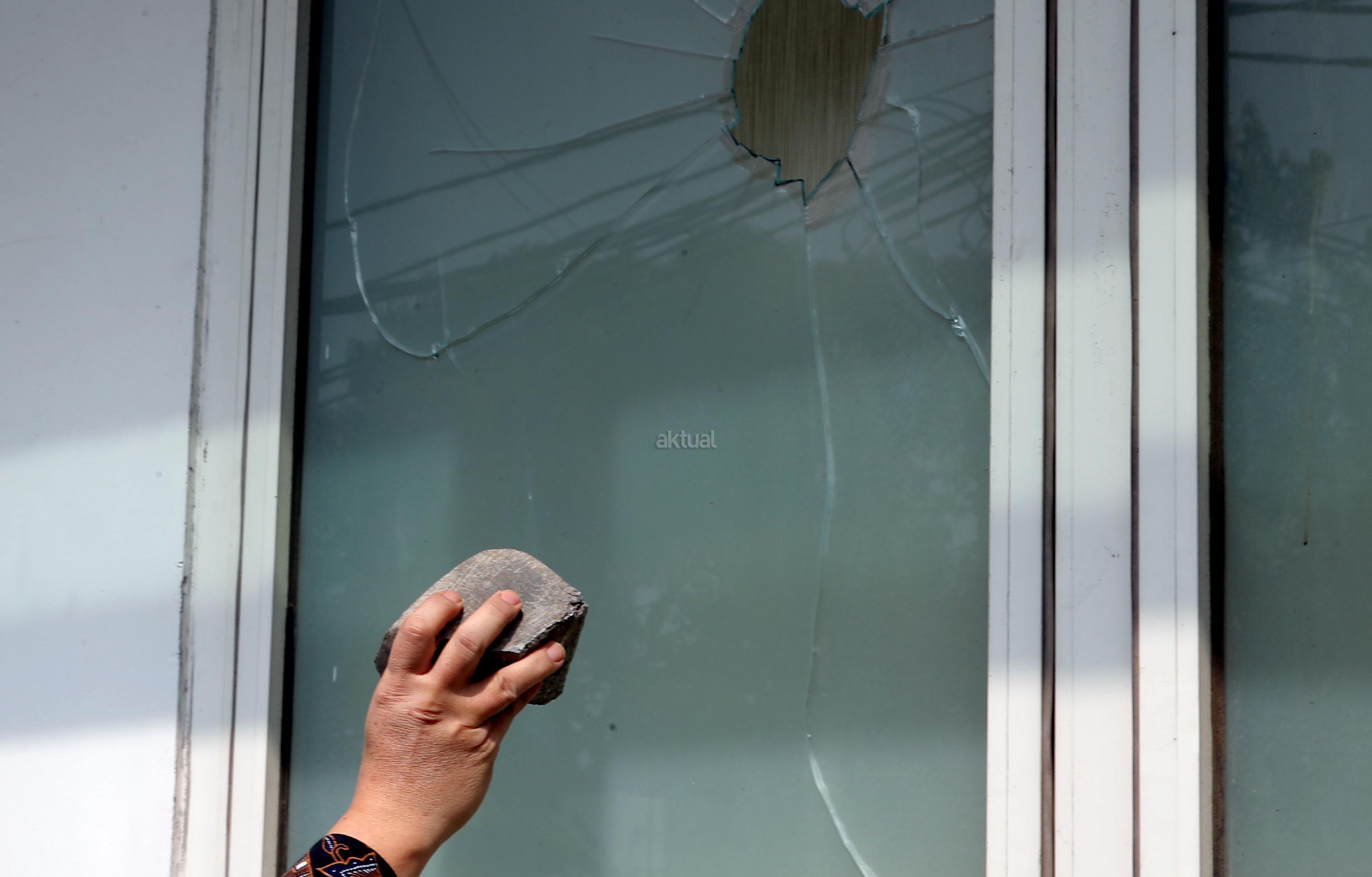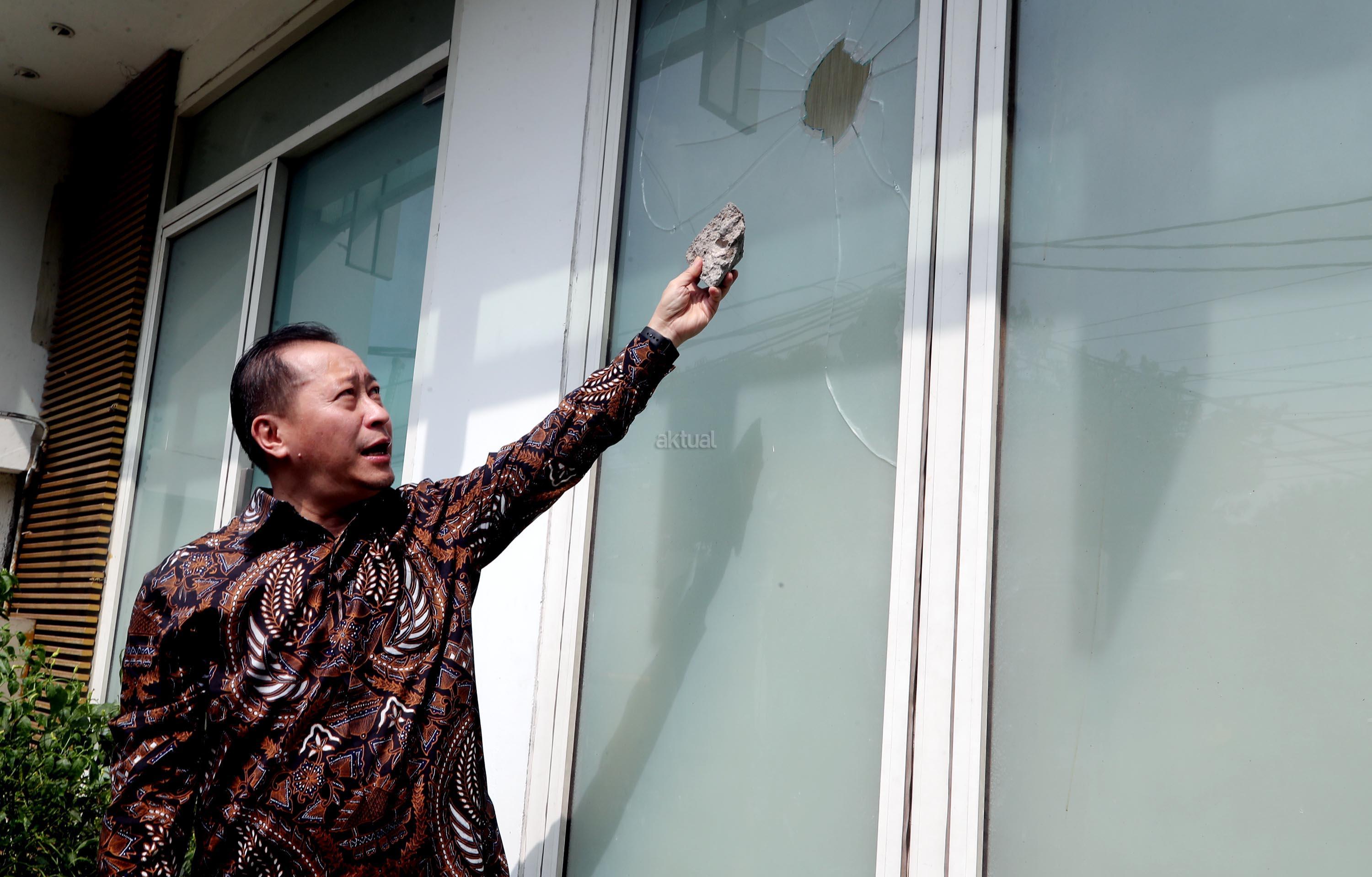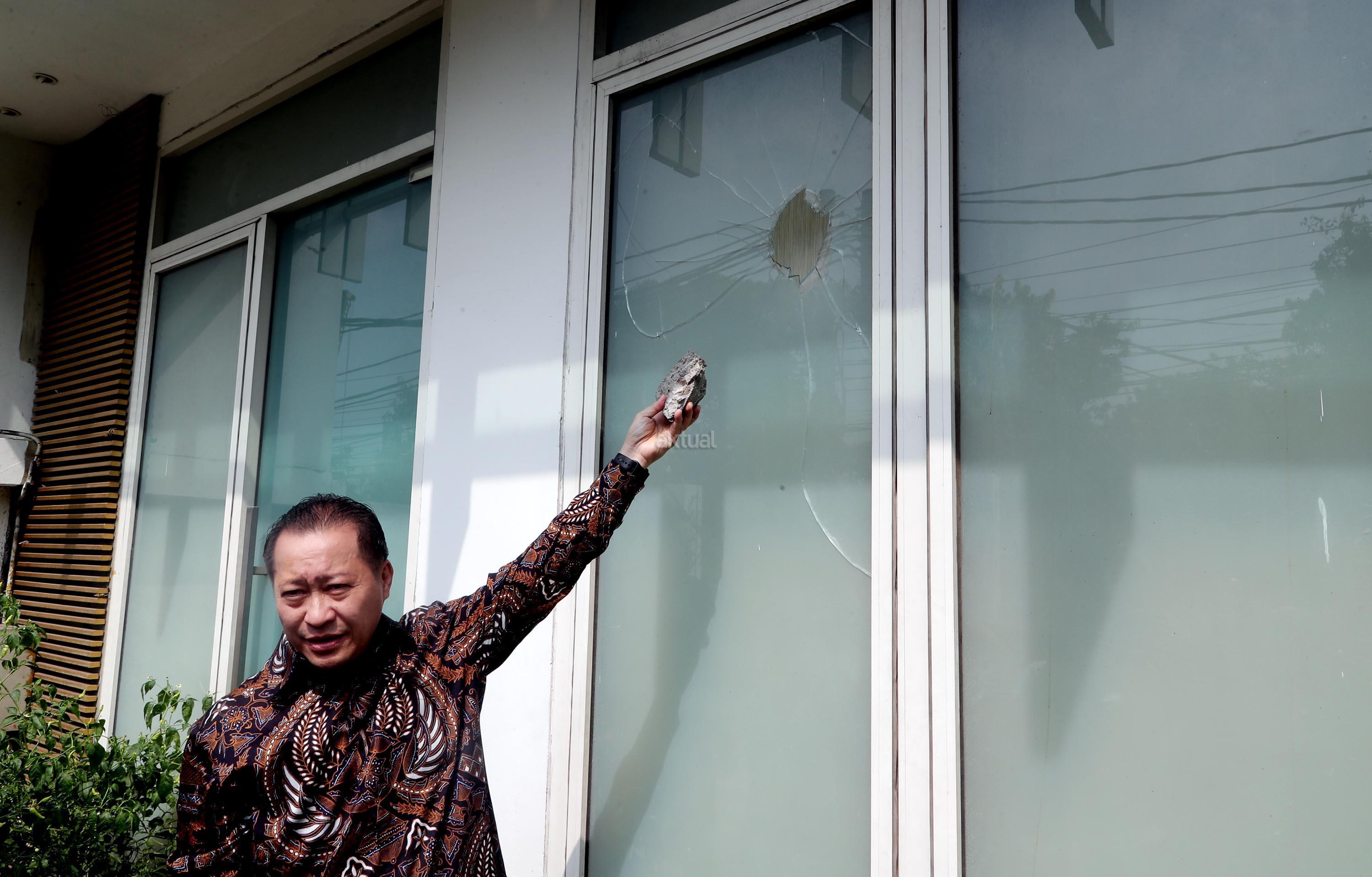 Wakil Ketua Umum DPP PPP Humphrey Djemat menunjukkan barang bukti batu dan kaca yang rusak akibat penyerangan oleh orang tak dikenal di Kantor DPP PPP kubu Djan Faridz, jalan Diponegoro, Jakarta, Minggu (16/7/2017). Wakil Ketua DPP PPP Humphrey Djemat mengatakan penyerangan kantor DPP PPP tersebut dilakukan oleh 80-an orang pada Minggu (16/7) dini hari yang mengakibatkan beberapa kaca pecah serta sebagian penjaga keamanan mengalami luka-luka. AKTUAL/Munzir