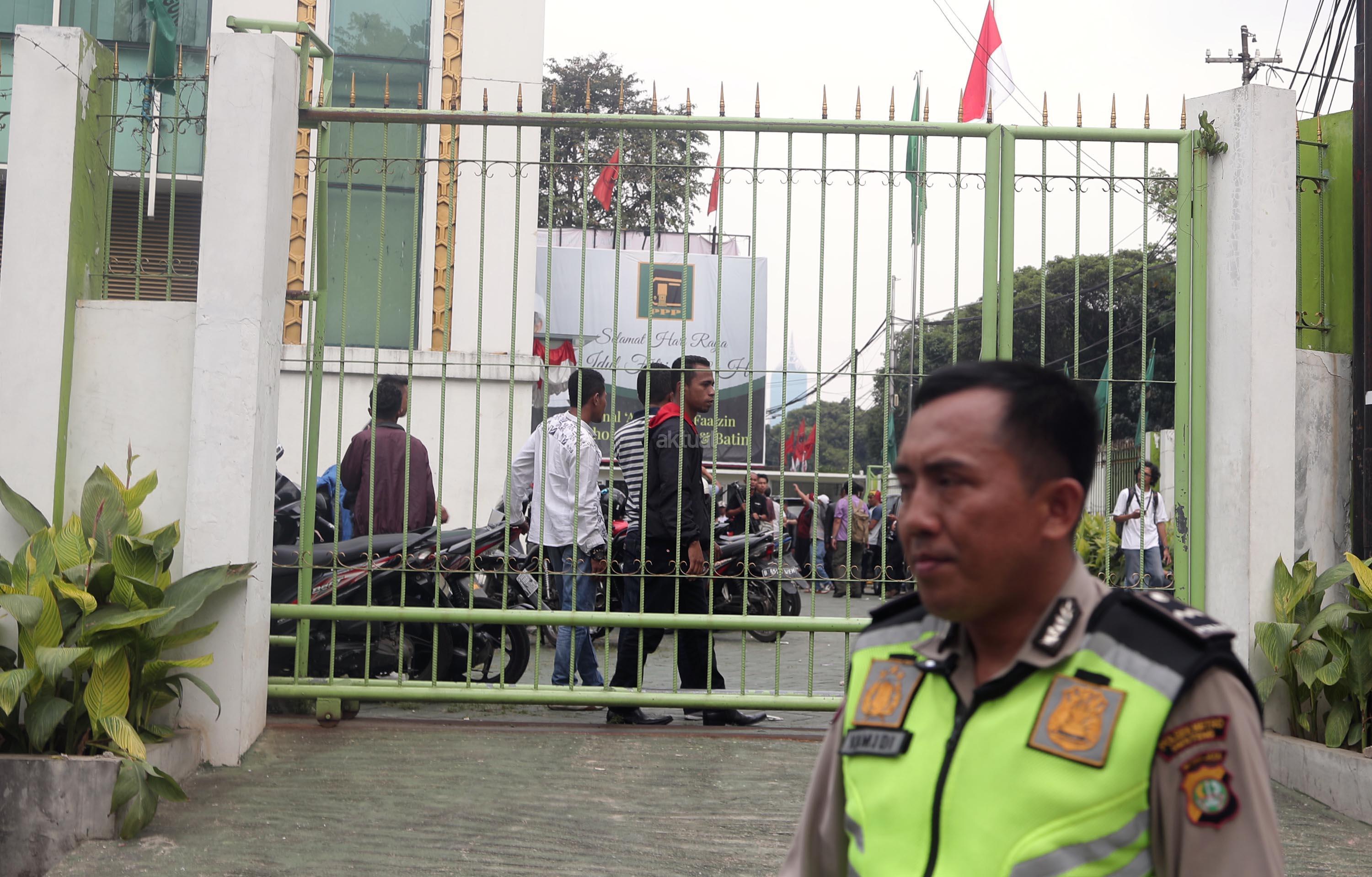 Petugas kepolisian berjaga pascapenyerangan oleh orang tak dikenal di Kantor DPP PPP kubu Djan Faridz, jalan Diponegoro, Jakarta, Minggu (16/7/2017). Wakil Ketua DPP PPP Humphrey Djemat mengatakan penyerangan kantor DPP PPP tersebut dilakukan oleh 80-an orang pada Minggu (16/7) dini hari yang mengakibatkan beberapa kaca pecah serta sebagian penjaga keamanan mengalami luka-luka. AKTUAL/Munzir