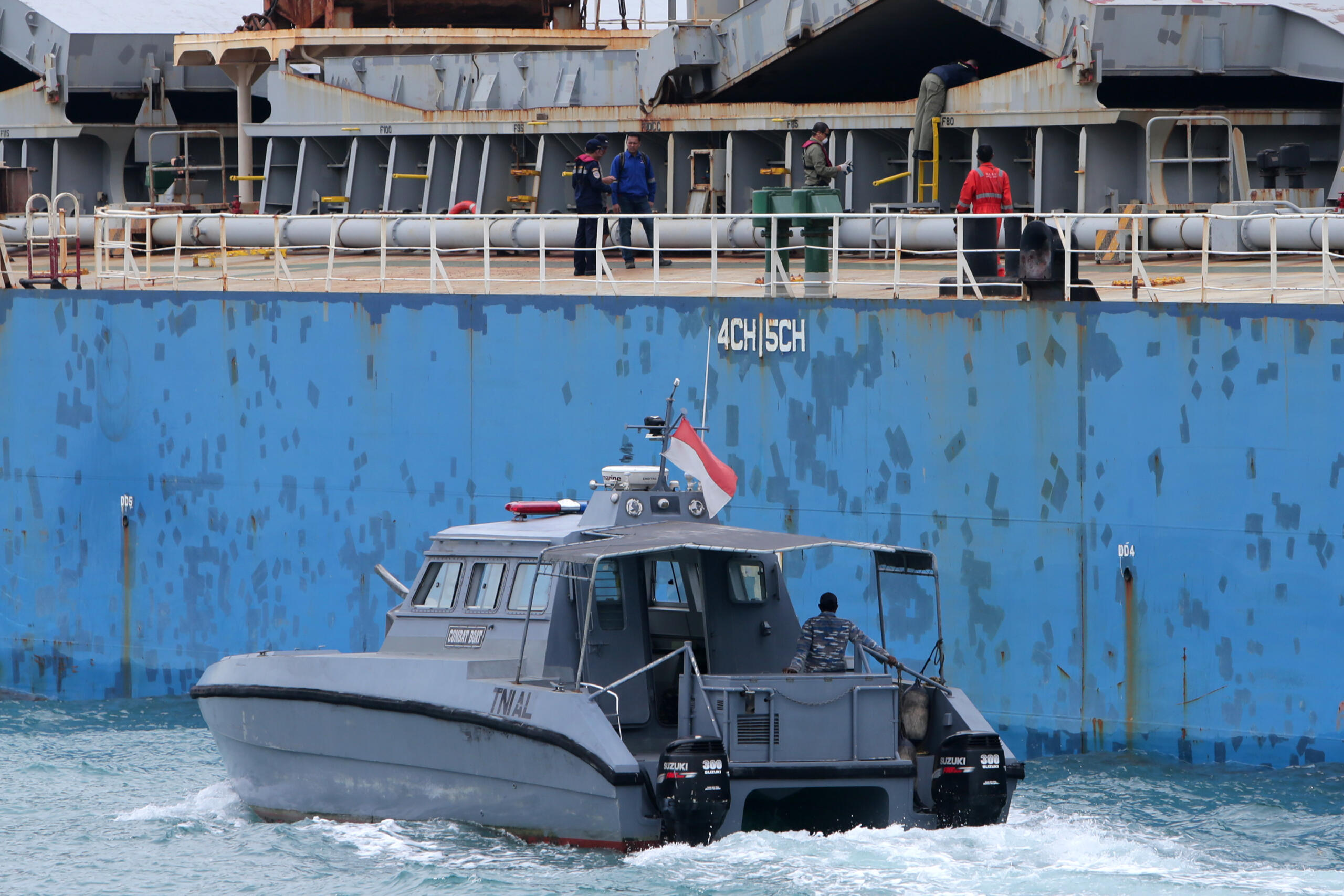 Petugas gabungan dari Badan Pengawas Tenaga Nuklir (Bapeten), Kesatuan Penjaga Laut dan Pantai (KPLP), Badan Keamanan Laut (Bakamla), Bea Cukai, Polair dan TNI AL memeriksa muatan kapal KM Ocean Carrier berbendera Hongkong di Perairan Pulau Sambu, Batam, Kepulauan Riau, Selasa (9/2). Petugas memeriksa muatan kapal setelah beredar info bahwa kapal yang berlayar dari Iran menuju Tiongkok tersebut diduga membawa uranium. Awalnya kapal dengan muatan pasir besi sebanyak 55.000 ton sesuai dengan manivest kapal tersebut kandas di Perairan Pulau Sabu, Batam. ANTARA FOTO/M N Kanwa/pd/16.