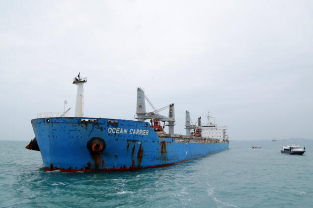 Kapal KM Ocean Carrier berbendera Hongkong yang diduga membawa uranium dijaga oleh petugas gabungan Kesatuan Penjaga Laut dan Pantai (KPLP), Badan Keamanan Laut (Bakamla), Polair dan TNI AL di Perairan Pulau Sambu, Batam, Kepulauan Riau, Selasa (9/2). Petugas memeriksa muatan kapal setelah beredar info bahwa kapal yang berlayar dari Iran menuju Tiongkok tersebut diduga membawa uranium. Awalnya kapal dengan muatan pasir besi sebanyak 55.000 ton sesuai dengan manivest kapal tersebut kandas di Perairan Pulau Sabu, Batam. ANTARA FOTO/M N Kanwa/pd/16.