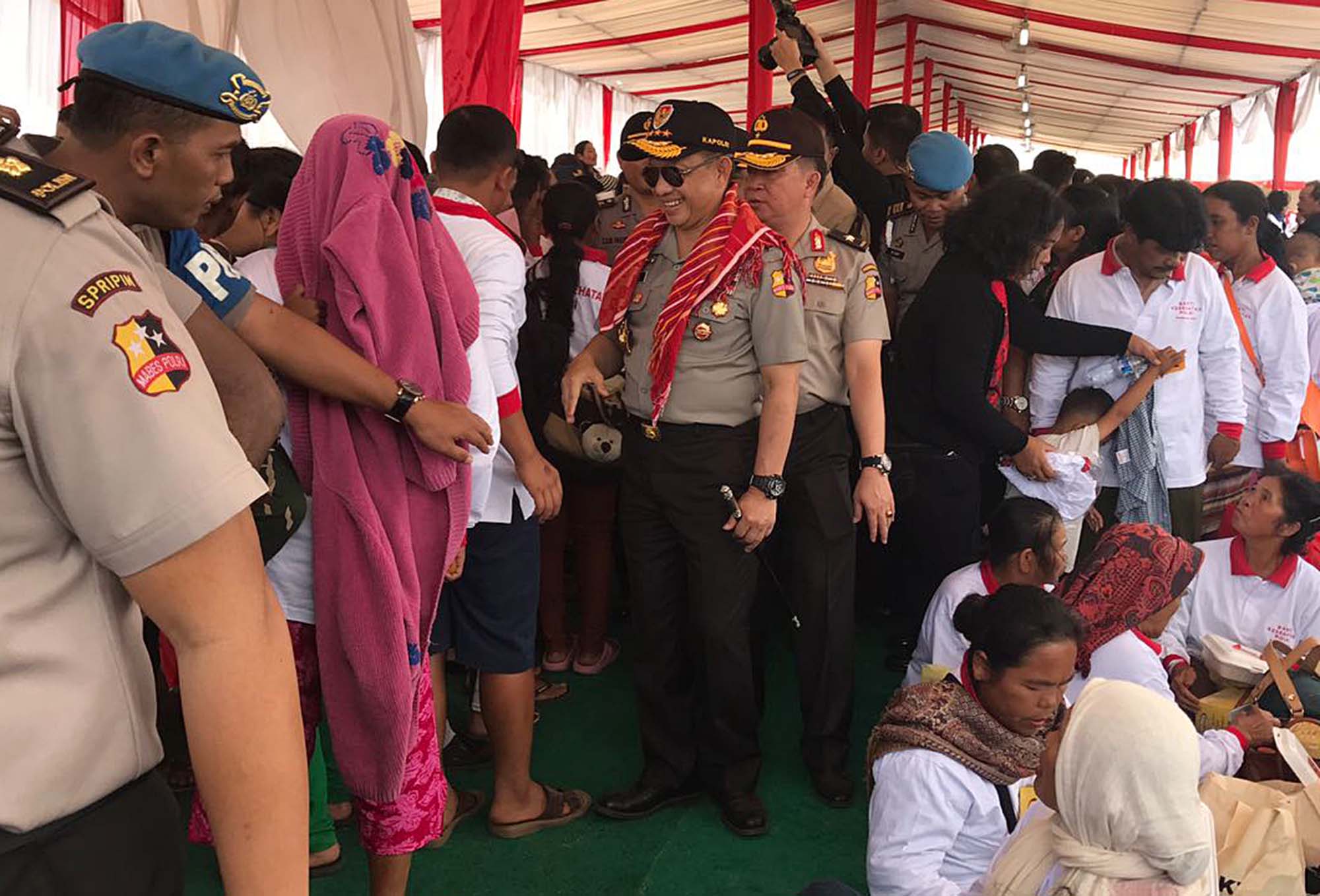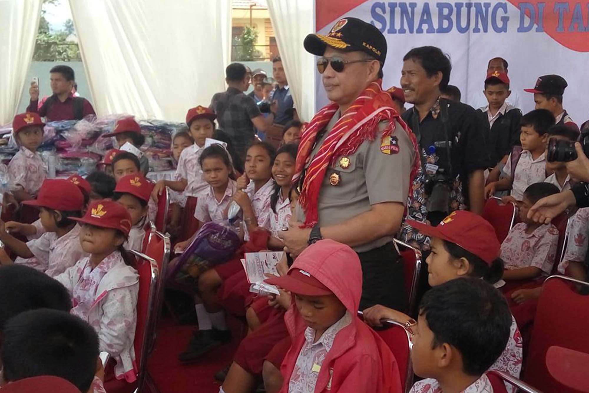 Kapolri Jenderal Tito Karnavian menyapa warga saat berkunjung dan memberi bantuan kepada warga Sinabung Kabupaten Karo, Sumatera Utara, Kamis (24/8/2017). Kapolri menginstruksikan seluruh jajaran kepolisian untuk melakukan pendekatan kepada masyarakat agar situasi kamtibmas kondusif dan tertib. Dalam kesempatan itu, Selain itu Kapolri memuji masyarakat Kabupaten Karo yang memiliki ciri peradaban tinggi dikarenakan peradaban bahasa selalu diawali dengan salam. Adapun bantuan dari Kapolri kepada pengungsi erupsi Gunung Sinabung yakni beras 1,9 ton, gula pasir 3,5 ton, mi instan 2.250 kotak, selimut hingga handuk. AKTUAL/Humas Polri