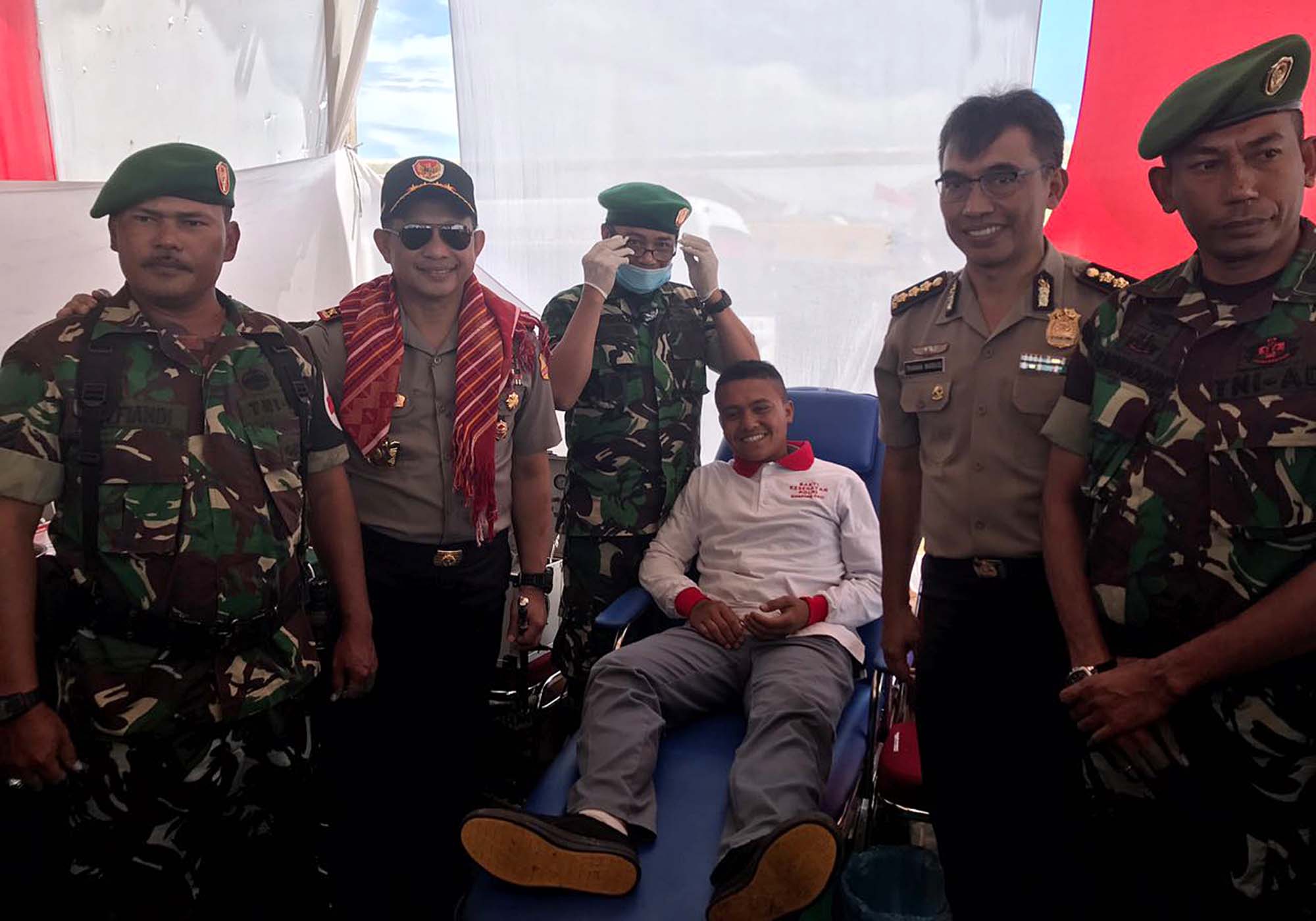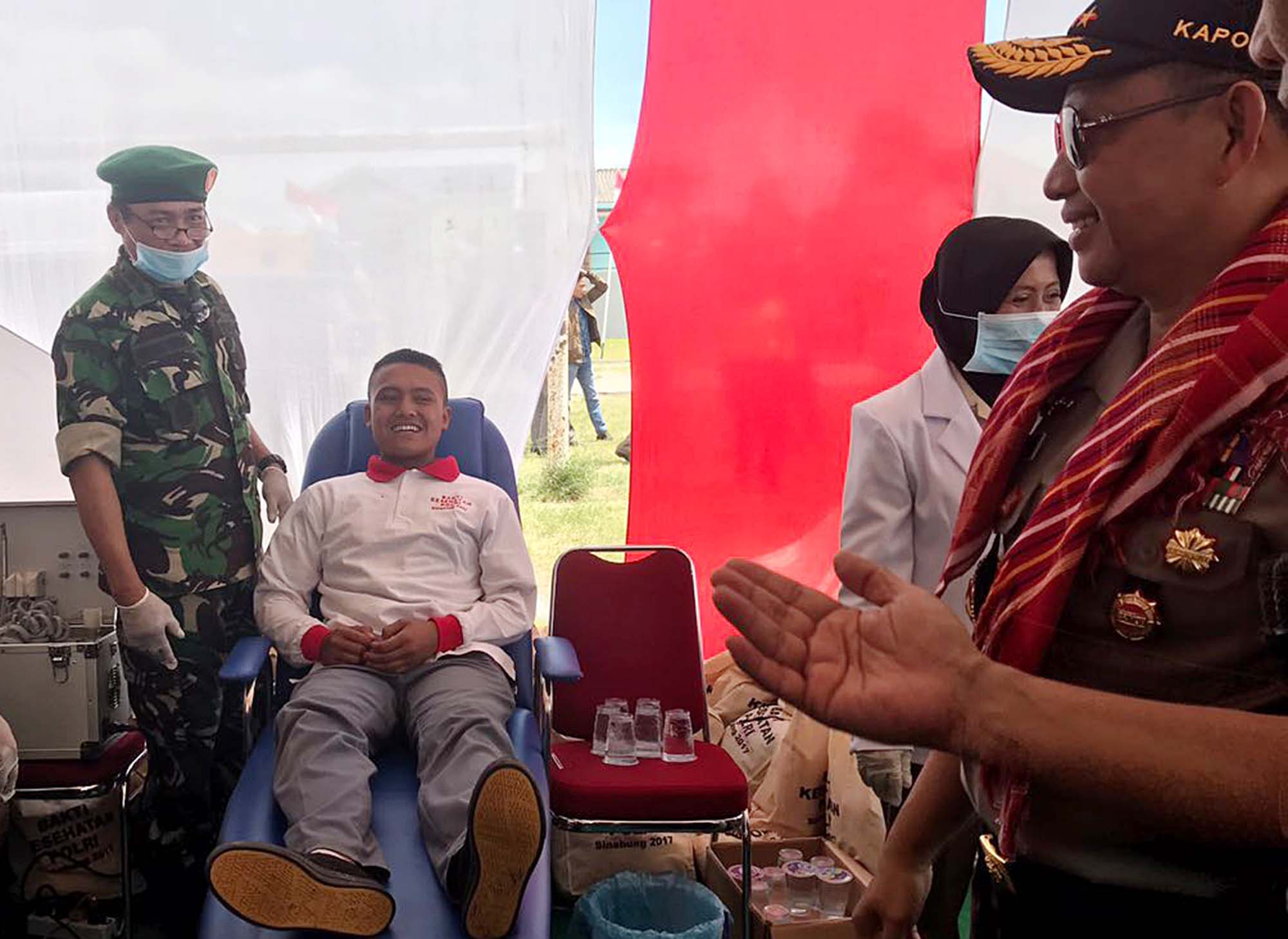 Kapolri Jenderal Tito Karnavian (kanan) menyapa warga yang sedang berobat saat berkunjung dan memberi bantuan kepada warga Sinabung Kabupaten Karo, Sumatera Utara, Kamis (24/8/2017). Kapolri menginstruksikan seluruh jajaran kepolisian untuk melakukan pendekatan kepada masyarakat agar situasi kamtibmas kondusif dan tertib. Dalam kesempatan itu, Selain itu Kapolri memuji masyarakat Kabupaten Karo yang memiliki ciri peradaban tinggi dikarenakan peradaban bahasa selalu diawali dengan salam. Adapun bantuan dari Kapolri kepada pengungsi erupsi Gunung Sinabung yakni beras 1,9 ton, gula pasir 3,5 ton, mi instan 2.250 kotak, selimut hingga handuk. AKTUAL/Humas Polri