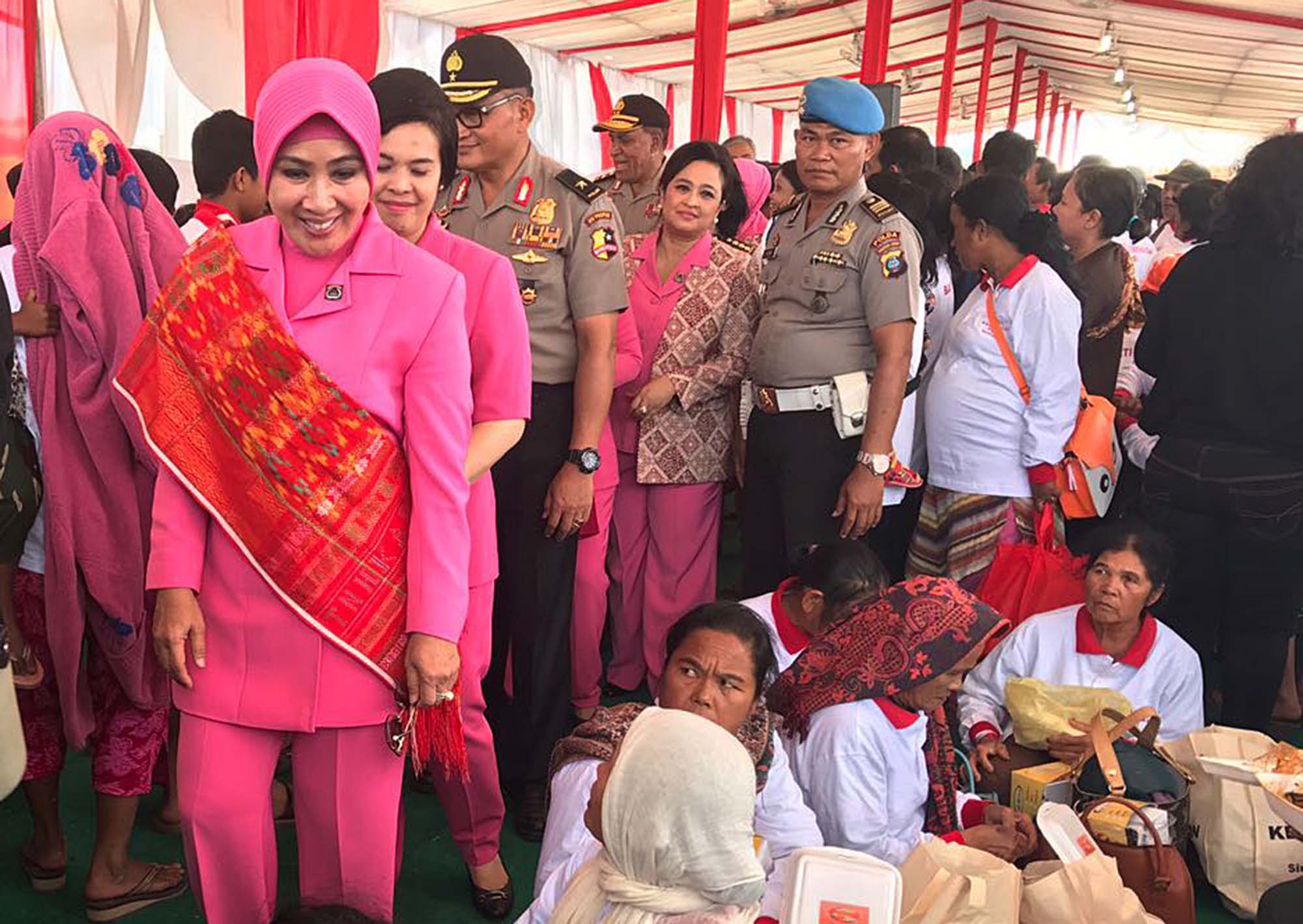 Istri Kapolri Jenderal Tito Karnavian, Tri Suswati menyapa warga saat berkunjung dan memberi bantuan kepada warga Sinabung Kabupaten Karo, Sumatera Utara, Kamis (24/8/2017). Kapolri menginstruksikan seluruh jajaran kepolisian untuk melakukan pendekatan kepada masyarakat agar situasi kamtibmas kondusif dan tertib. Dalam kesempatan itu, Selain itu Kapolri memuji masyarakat Kabupaten Karo yang memiliki ciri peradaban tinggi dikarenakan peradaban bahasa selalu diawali dengan salam. Adapun bantuan dari Kapolri kepada pengungsi erupsi Gunung Sinabung yakni beras 1,9 ton, gula pasir 3,5 ton, mi instan 2.250 kotak, selimut hingga handuk. AKTUAL/Humas Polri