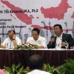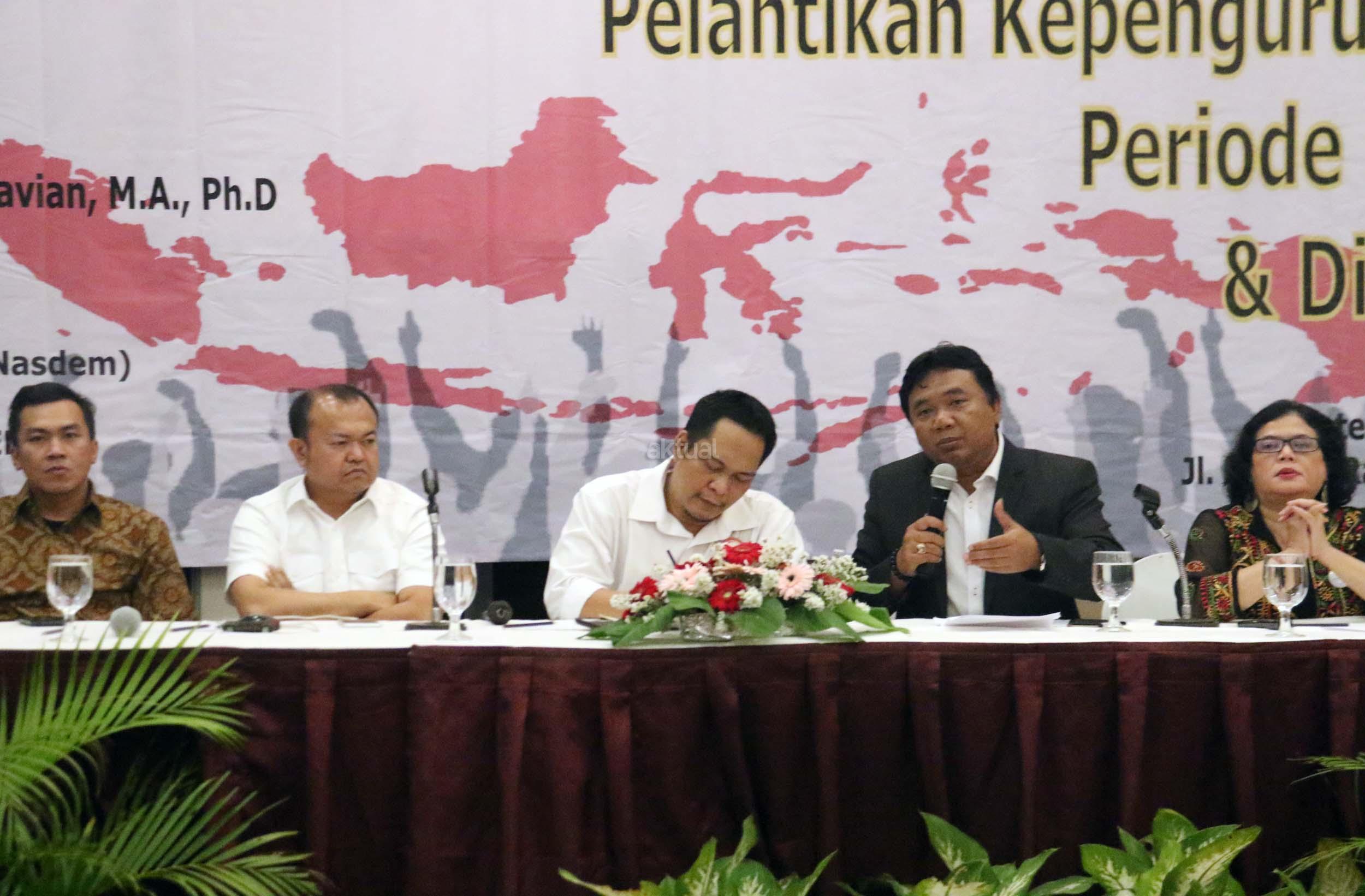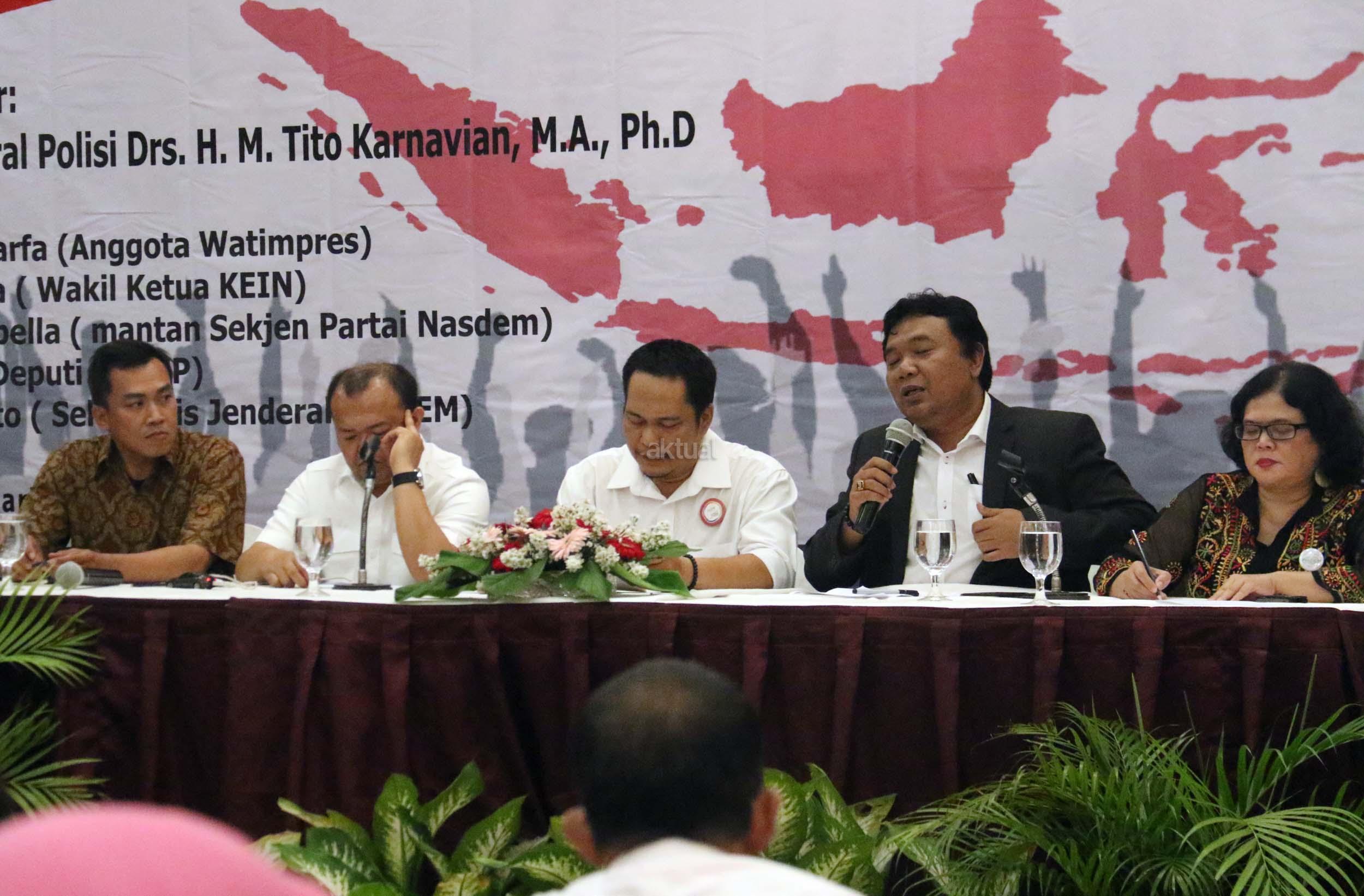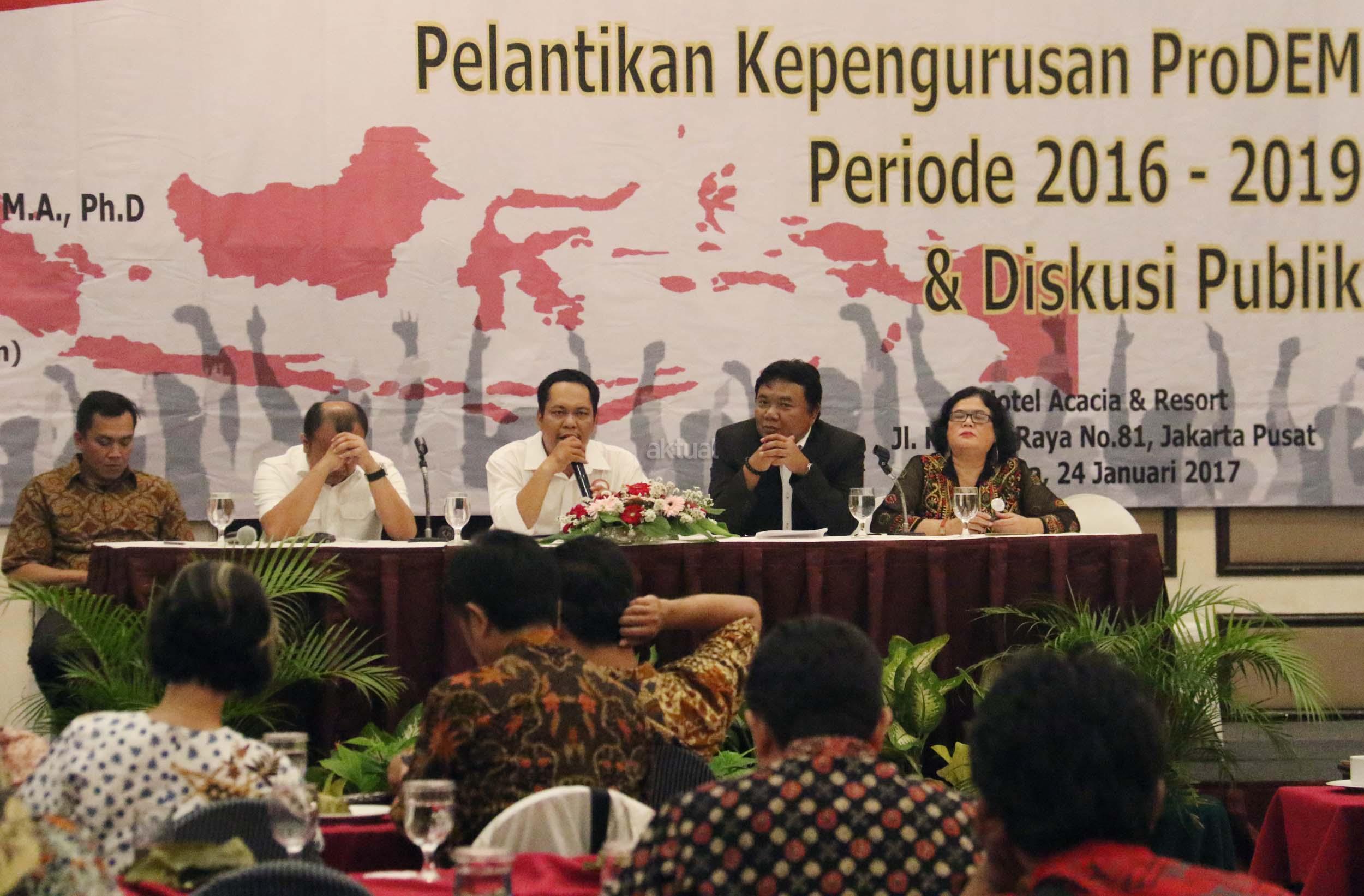 Kiri-kanan ;Sekjen Prodem Satyo Purwanto, Mantan Sekjen Partai Nasdem Patrice Rio Capella, Moderator Nuryaman Berry Hariyanto, Deputi IV KSP Eko Sulistyo, Majelis PBHI Nasional Sunjati saat diskusi Aktivis Pro Demokrasi (Prodem) di Jakarta, Selasa (24/1/2017). Diskusi yang diselenggarakan aktivis Pro Demkoraksi (Prodem) mengambil tema “Demokrasi Dan Kesejahteraan ” selain diskusi Prodem juga melakukan pelantikan pengurus ProDEM periode 2016-2019.