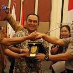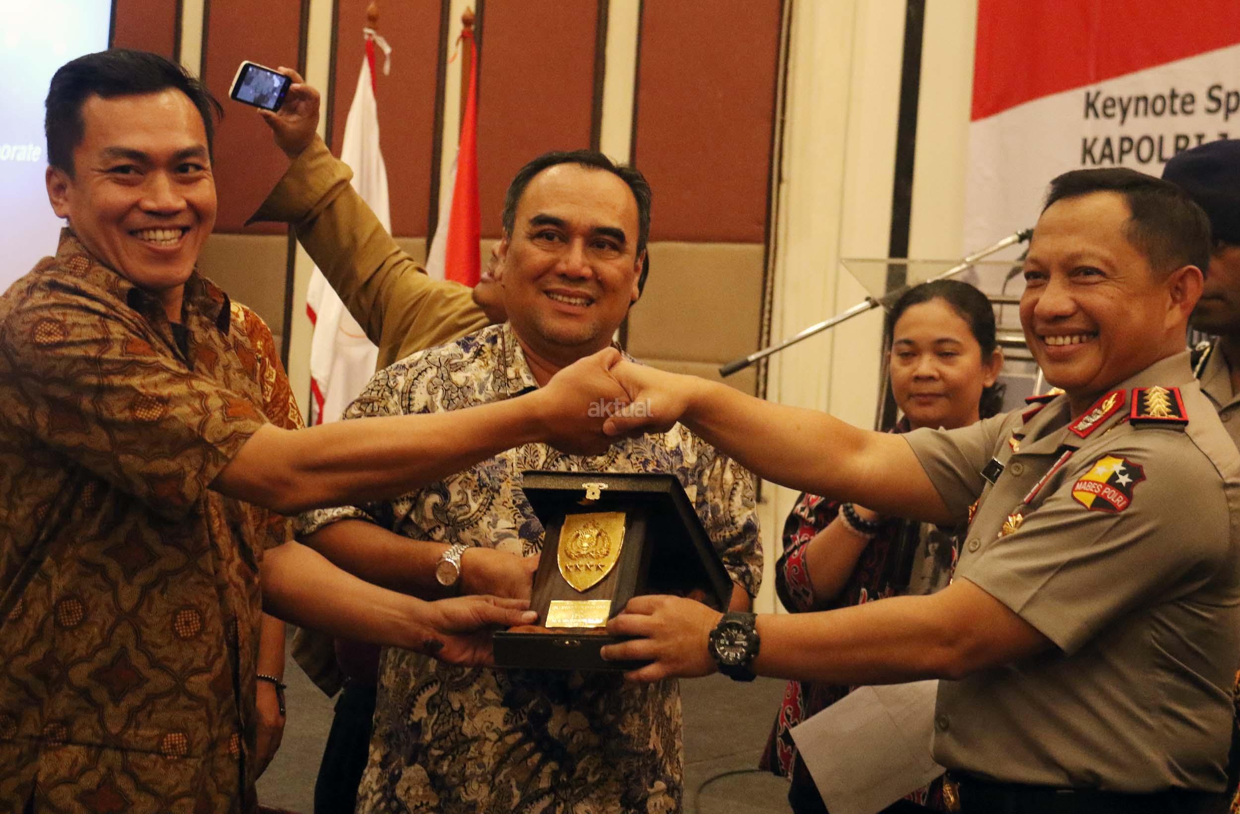 Kapolri Jenderal Pol Tito Karnavian (kanan) memberikan cinderamata kepada Sekjen Prodem Satyo Purwanto (kiri) dan didampingi Ketua Majelis Prodem Bambang Joedopramono (tengah) usai menjadi Keynote Speaker di acara Pelantikan Pengurus Prodem periode 2016-2019 di Jakarta, Selasa (24/1/2017). Selain pelantikan Prodem juga melakukan diskusi yang mengambil tema “Demokrasi Dan Kesejahteraan.