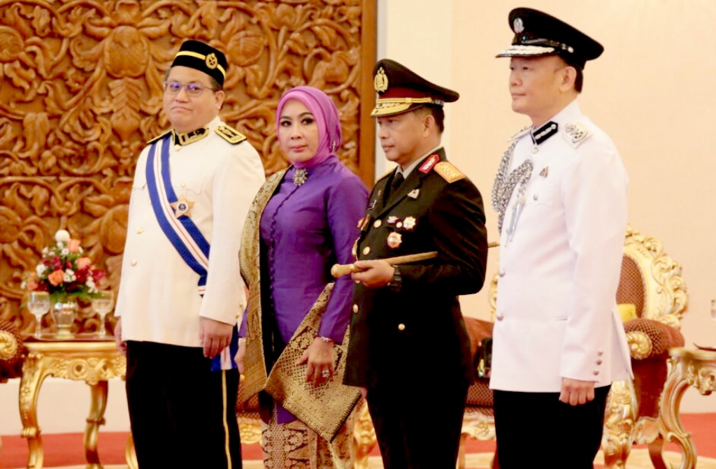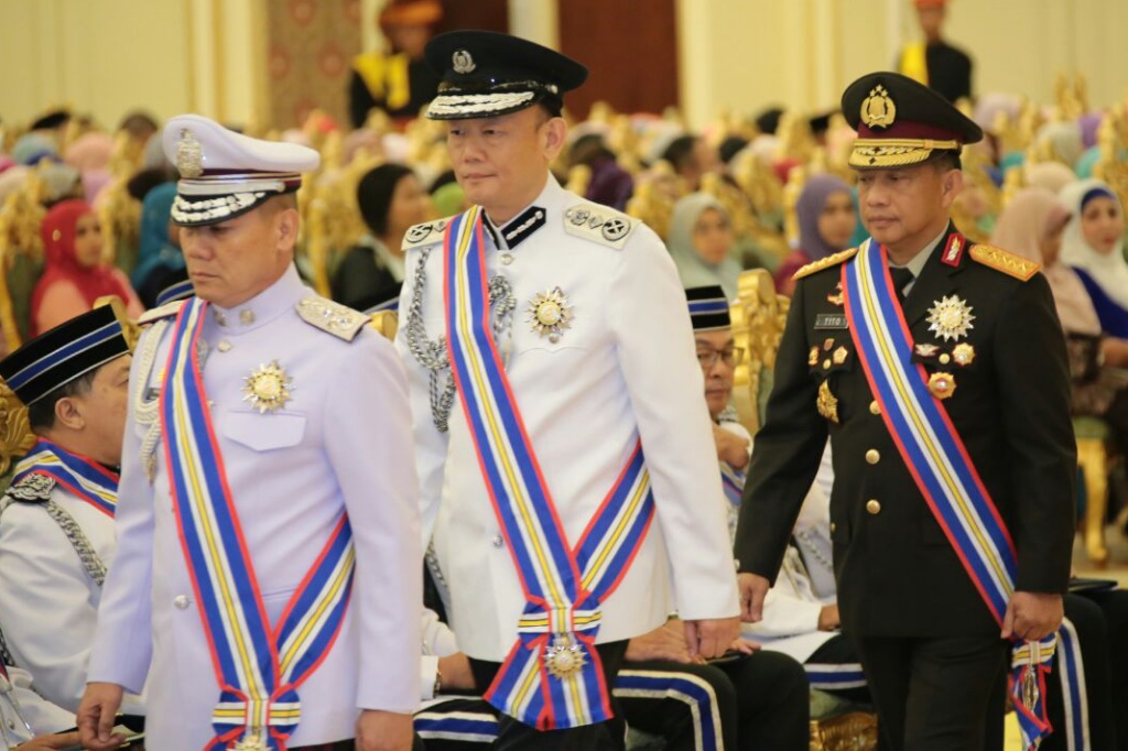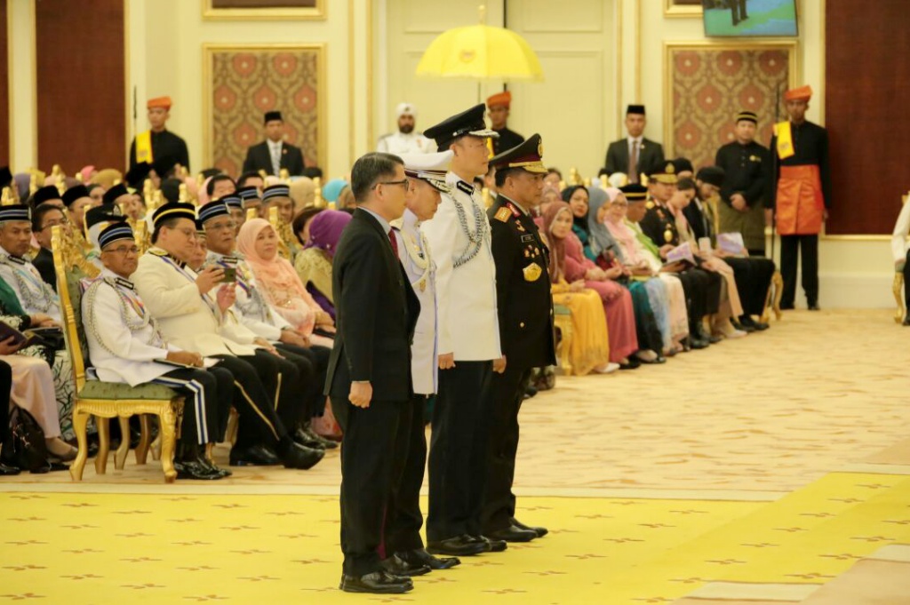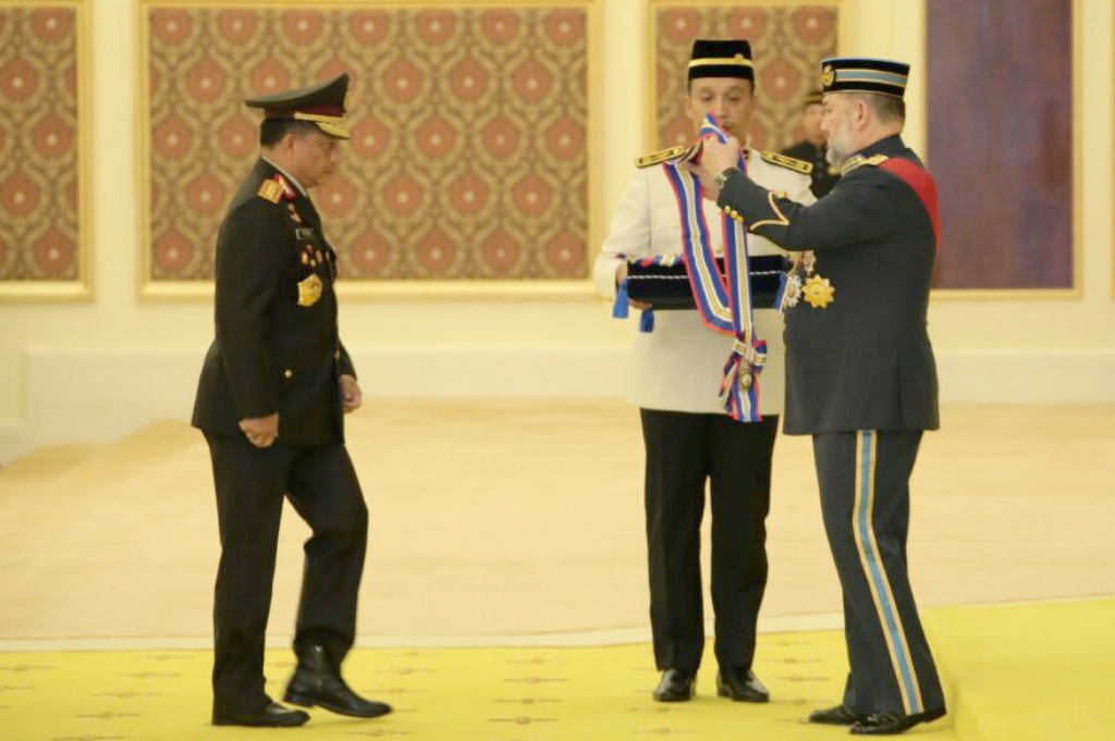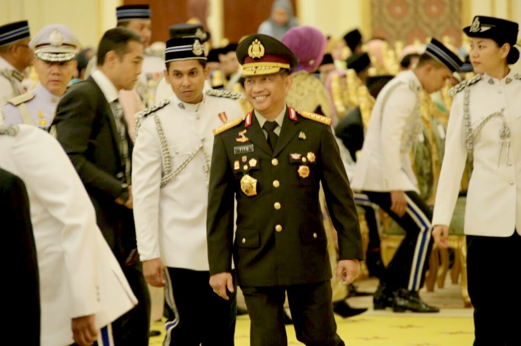 Kapolri Jendral Pol Tito Karnavian menerima penganugerahan First Class Police Force Bravery Award, dengan nama Panglima Gagah Pasukan Polis (PGPP) dari Raja Malaysia, Kebawah Duli Yang Maha Mulia Seri Paduka Baginda Yang Di-Pertuan Agong XV Sultan Muhammad V di Istana Negara Malaysia, Kuala Lumpur, Minggu (10/12/2017). PGPP diberikan kepada Perwira Tinggi Kepolisian atas pengabdian yang luar biasa terhadap kepolisian dan negara. Kapolri menerima penghargaan ini atas penanggulangan kejahatan antar negara, khususnya penanggulangan terorisme. AKTUAL/Humas Polri