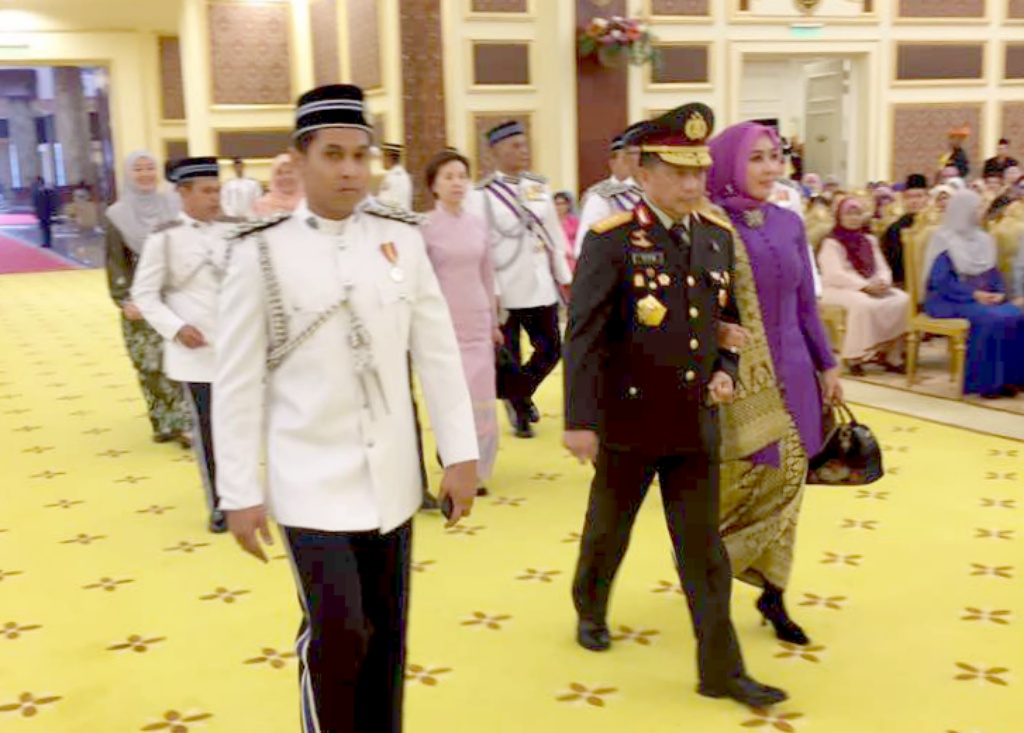 Kapolri Jendral Pol Tito Karnavian didampingi Istri saat akan menerima penganugerahan First Class Police Force Bravery Award, dengan nama Panglima Gagah Pasukan Polis (PGPP) dari Raja Malaysia, Kebawah Duli Yang Maha Mulia Seri Paduka Baginda Yang Di-Pertuan Agong XV Sultan Muhammad V di Istana Negara Malaysia, Kuala Lumpur, Minggu (10/12/2017). Penganugerahan ini merupakan bentuk pengakuan atas komitmen dan kontribusi Kapolri terhadap keamanan Indonesian-Malaysia maupun keamanan kawasan dan dukungan terhadap Polis Diraja Malaysia. AKTUAL/Humas Polri