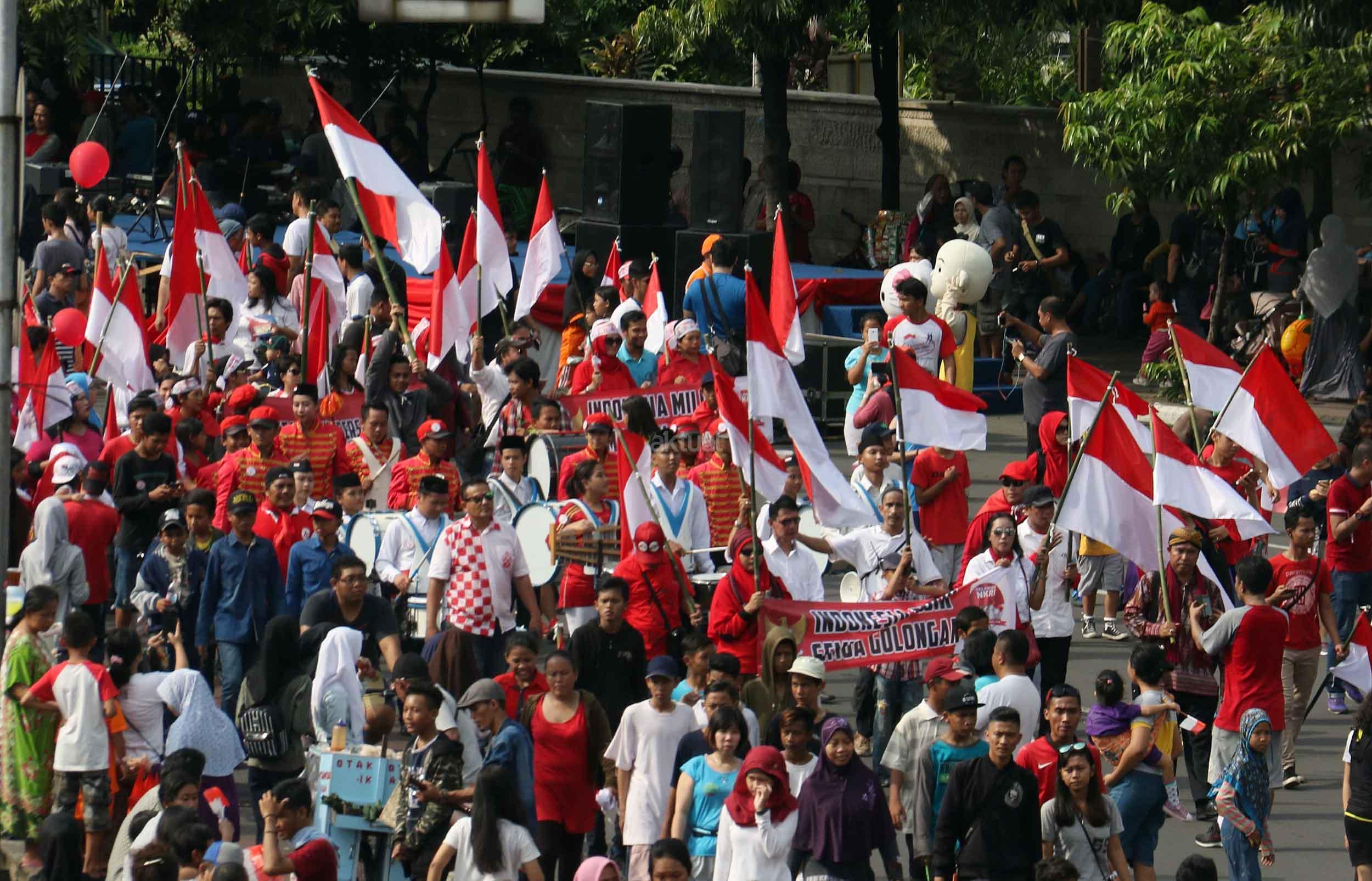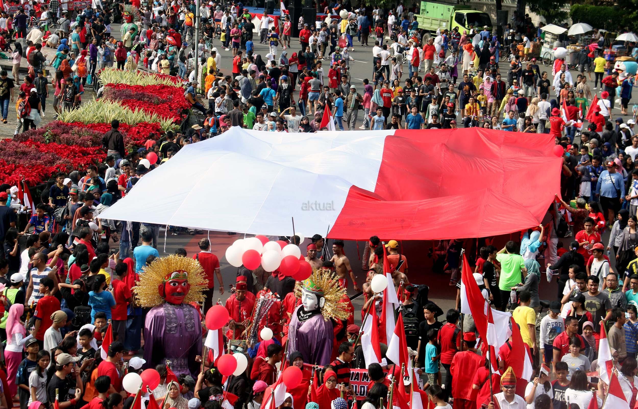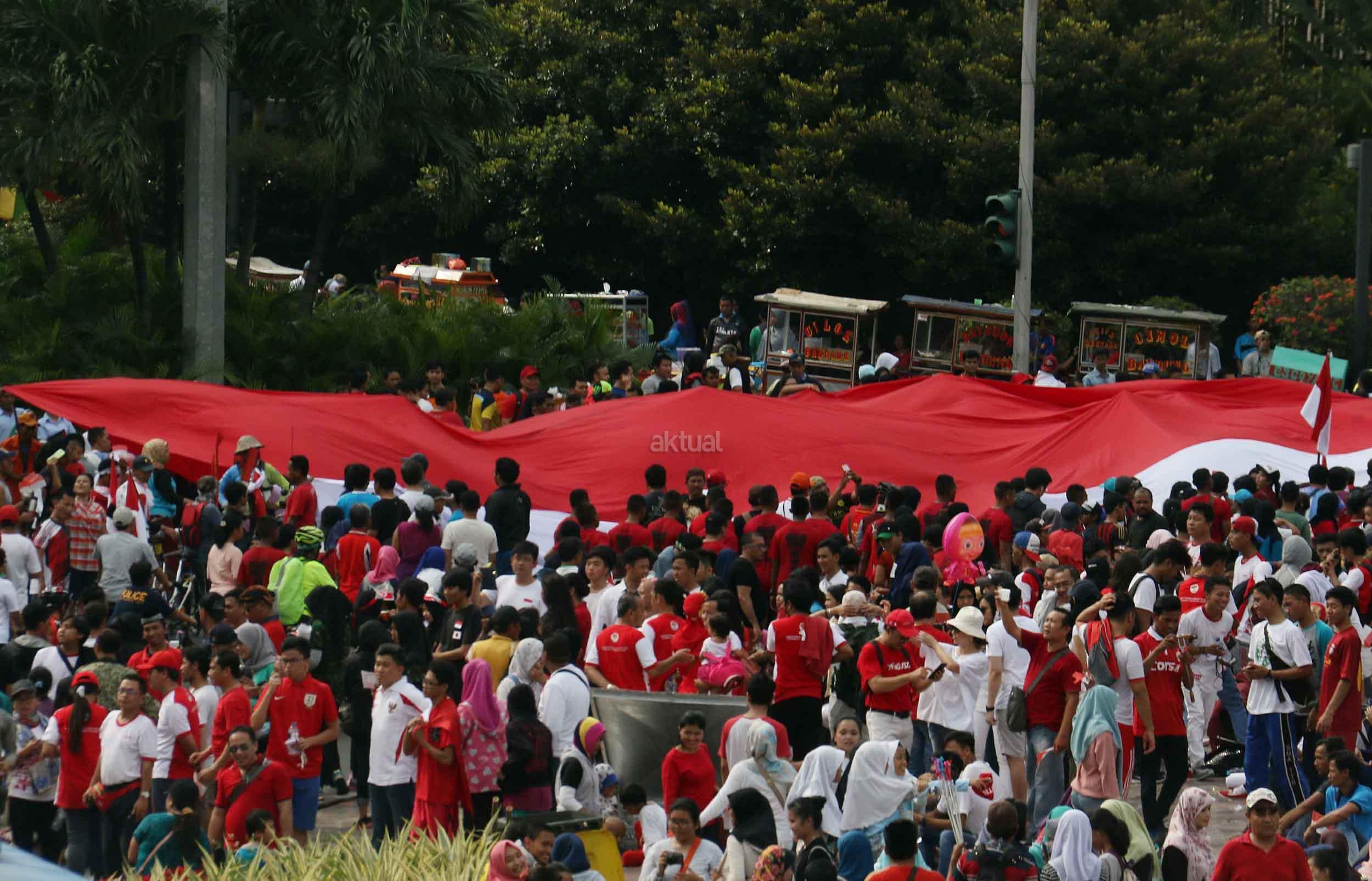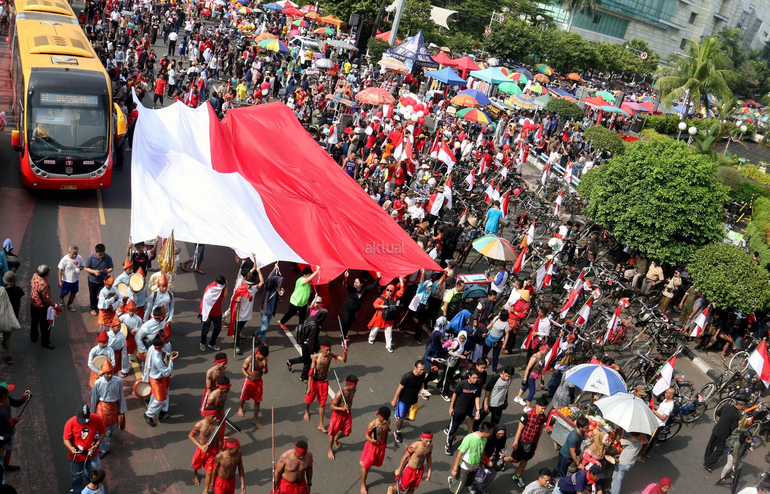 Peserta membentangkan bendera merah putih raksasa pada Karnaval Cinta Budaya NKRI di kawasan Bunderan HI, Jakarta, Minggu (20/11/2016). Karnaval ini bertujuan merawat dan menyiram perdamaian, toleransi, harmoni dan persaudaraan kebangsaan. AKTUAL/Munzir