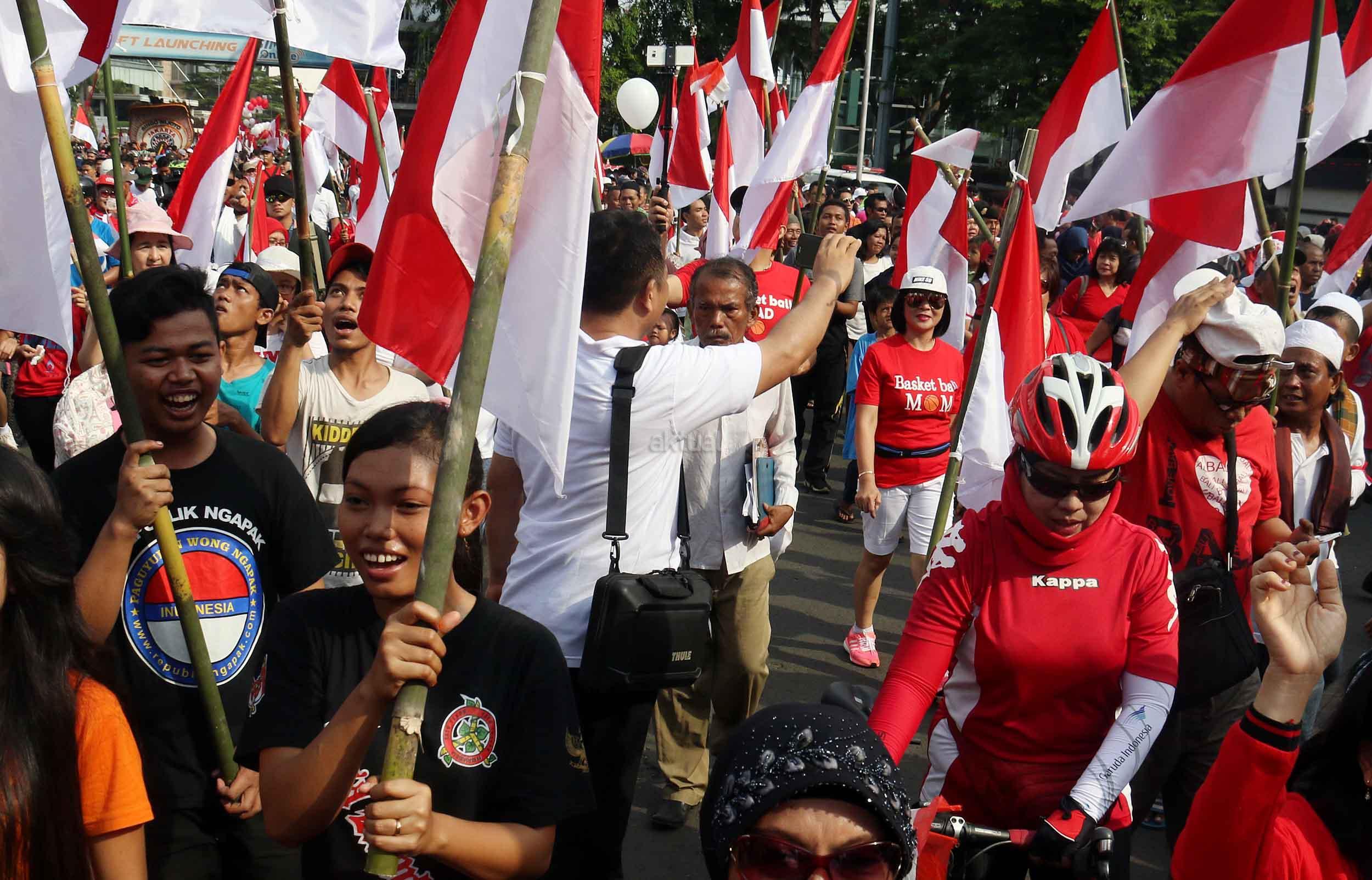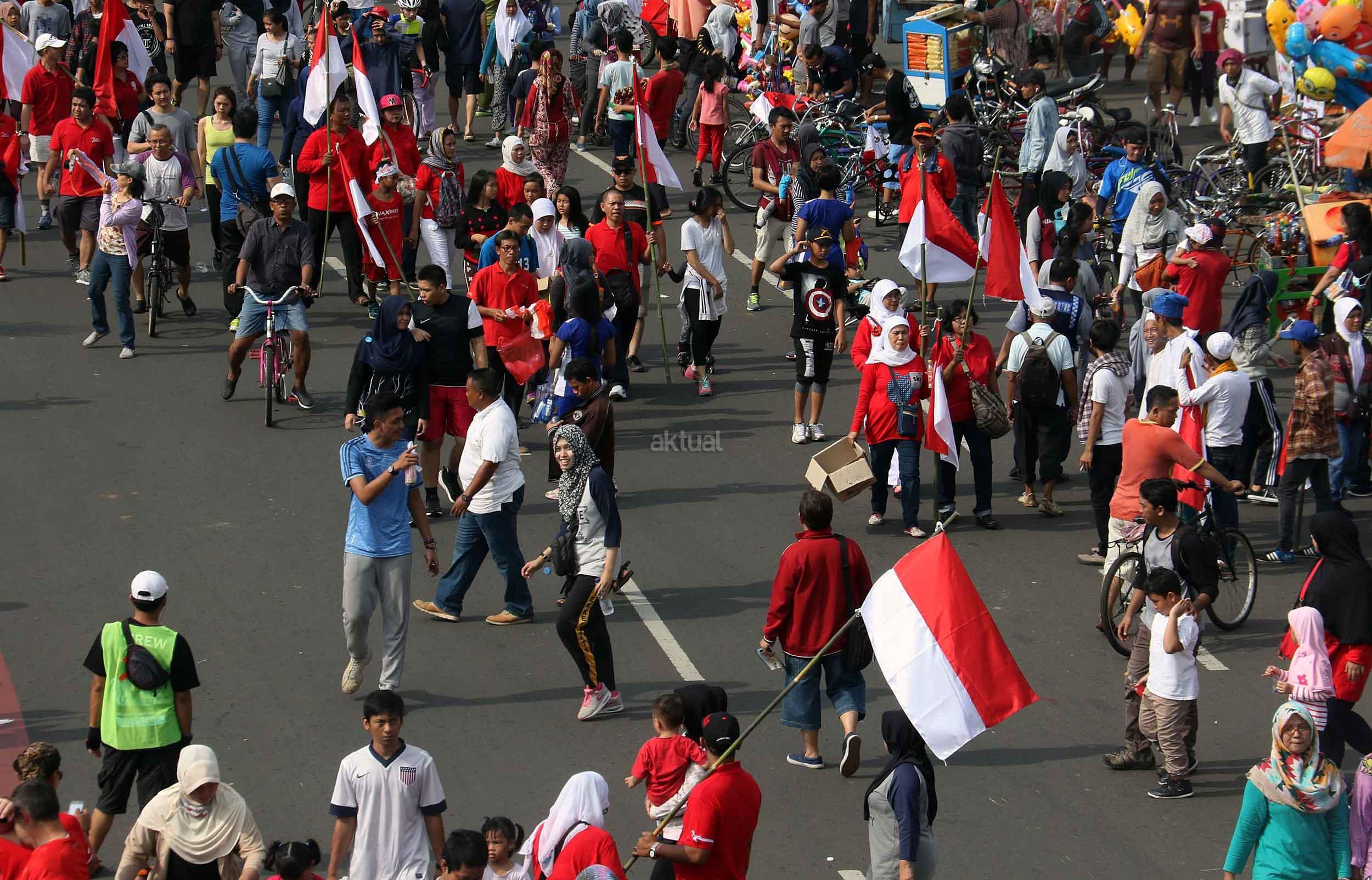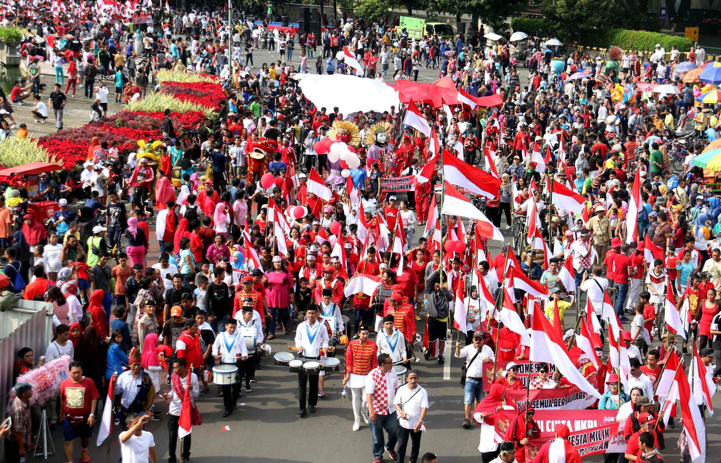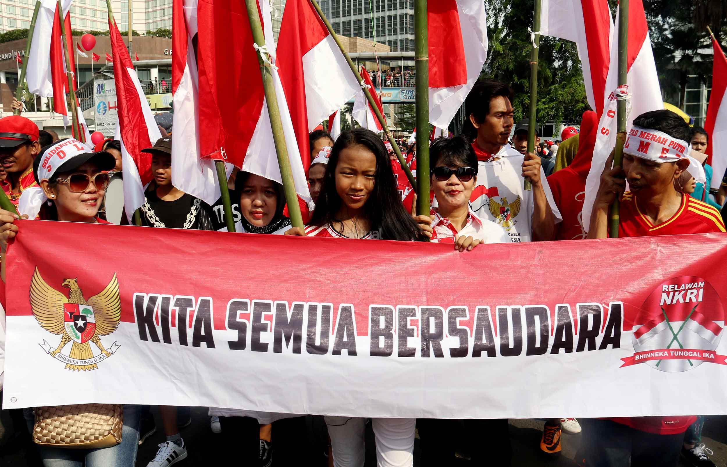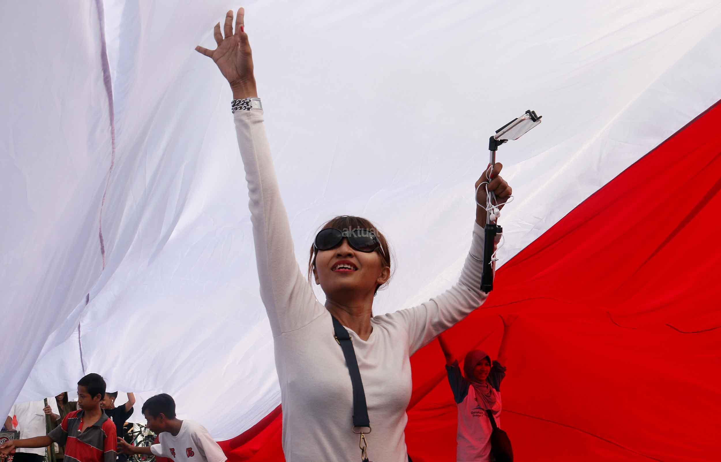 Peserta membentangkan bendera merah putih raksasa pada Karnaval Cinta Budaya NKRI di kawasan Bunderan HI, Jakarta, Minggu (20/11/2016). Karnaval ini bertujuan merawat dan menyiram perdamaian, toleransi, harmoni dan persaudaraan kebangsaan. AKTUAL/Munzir