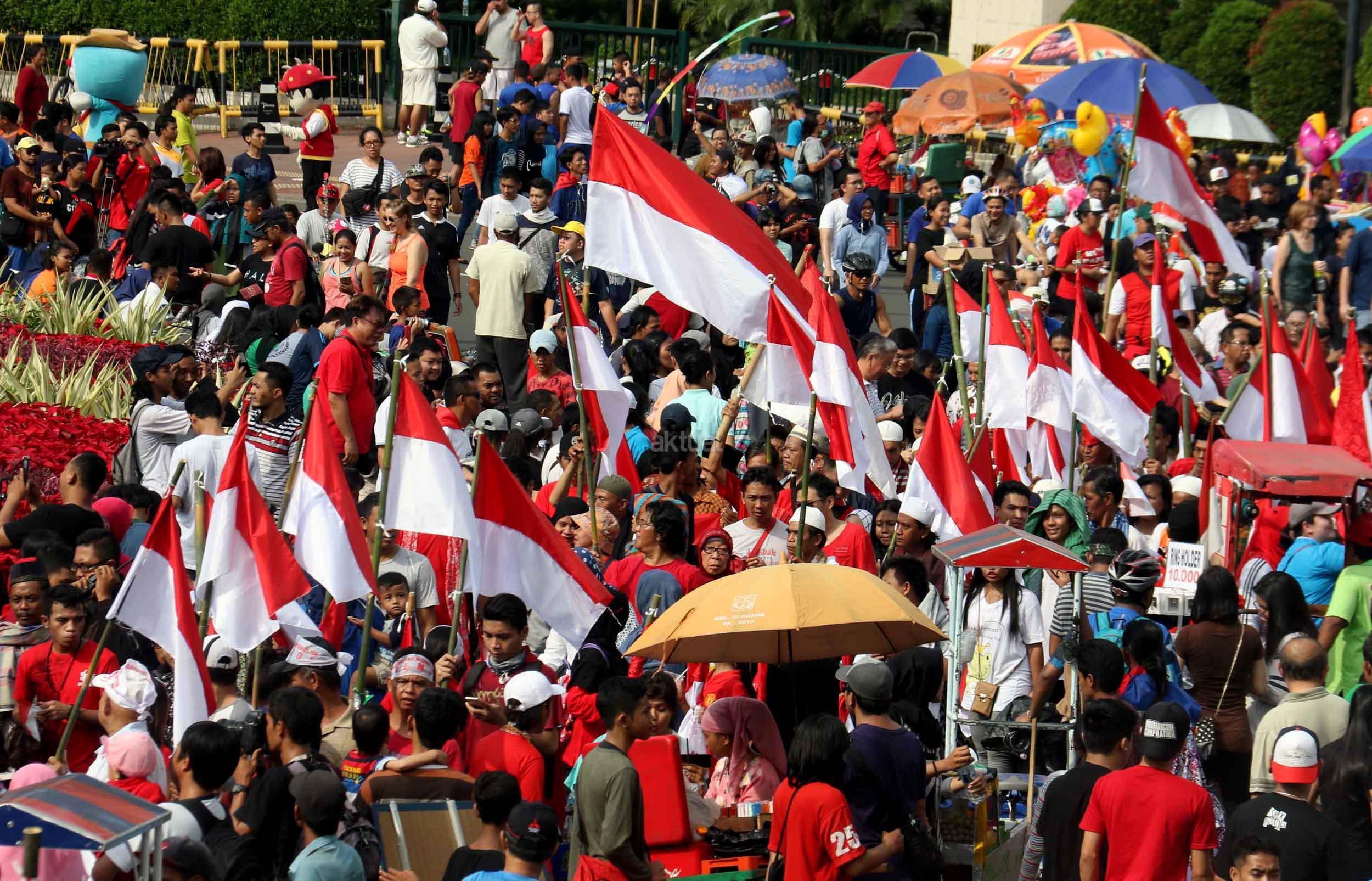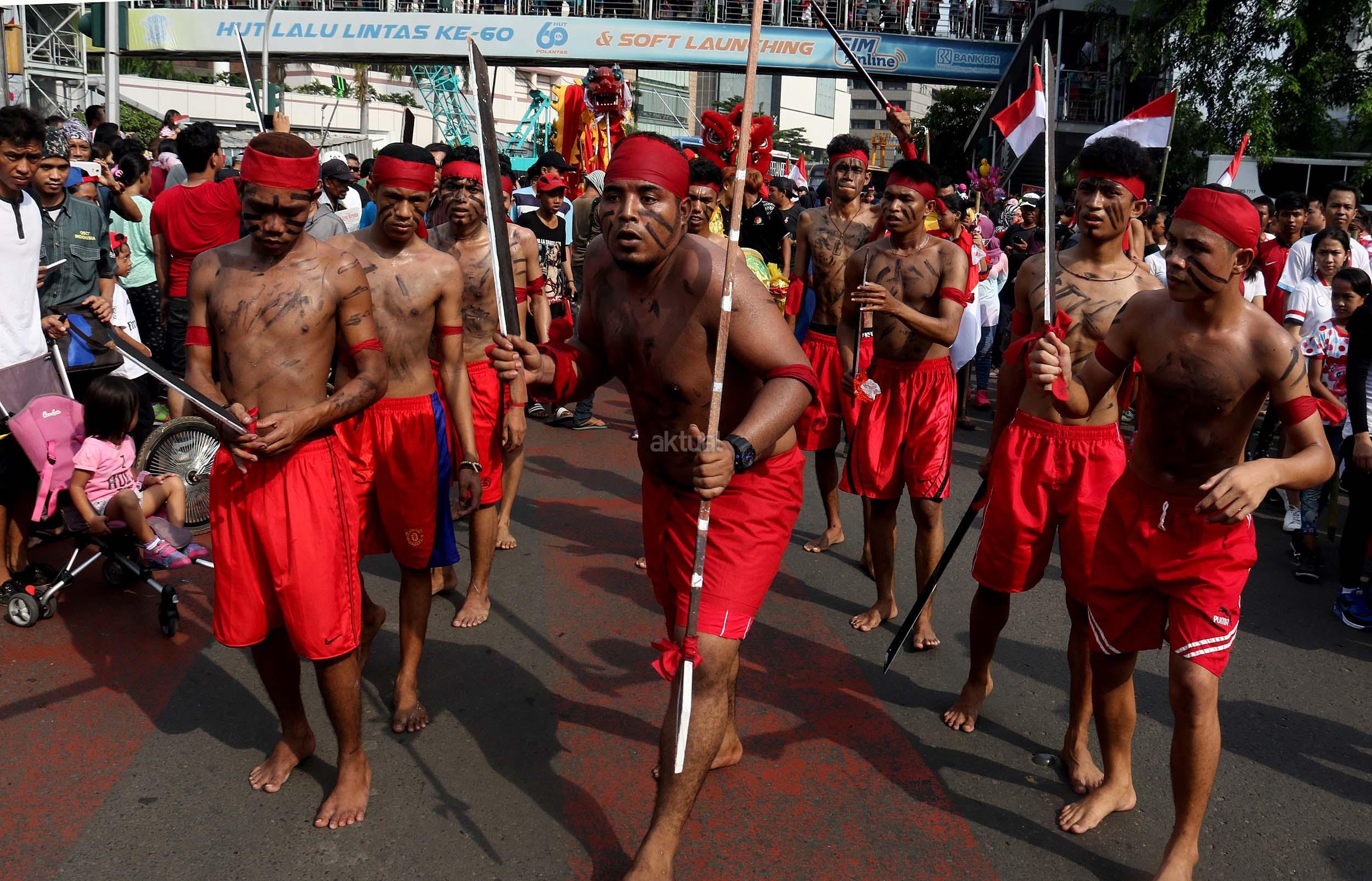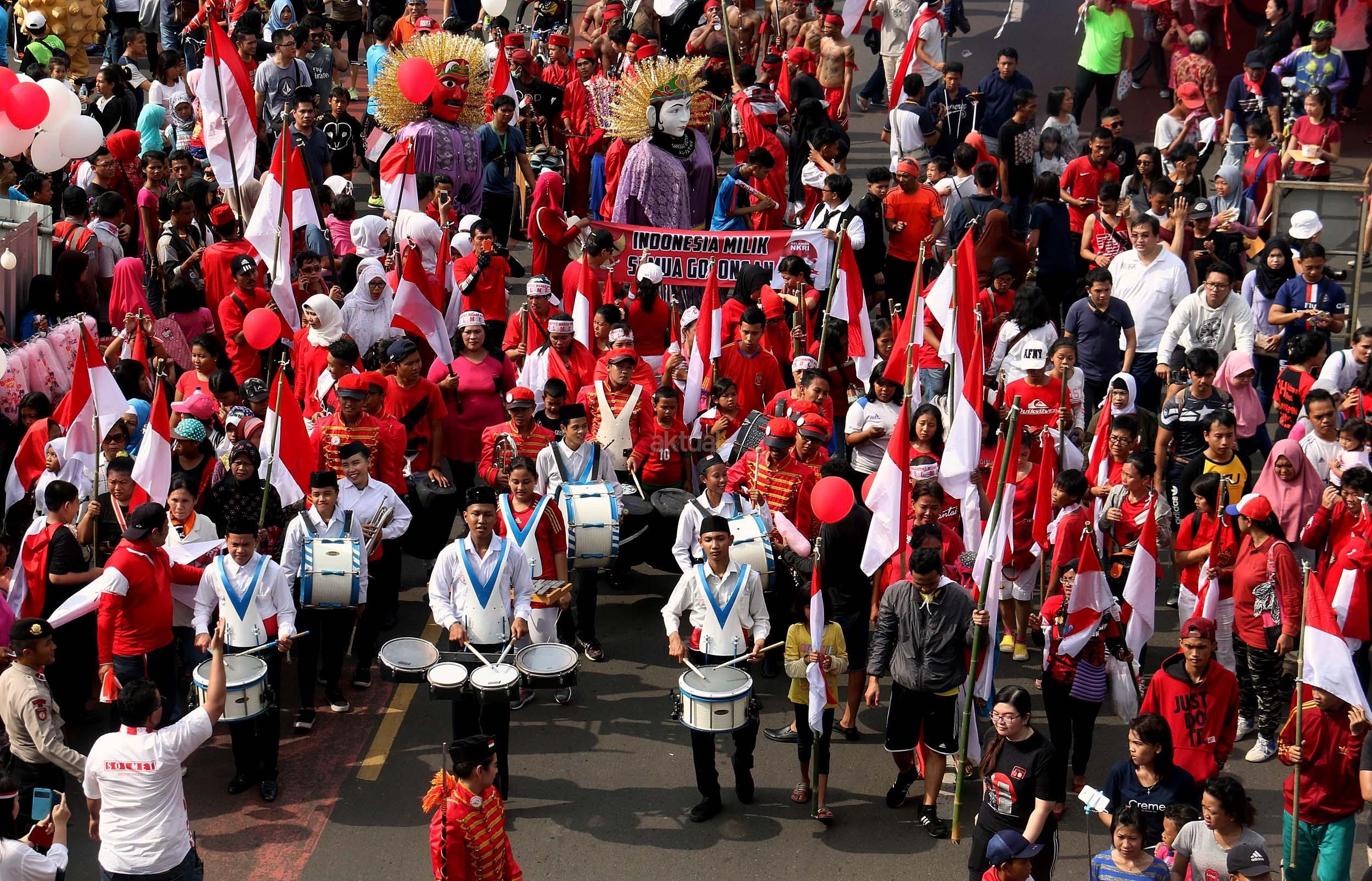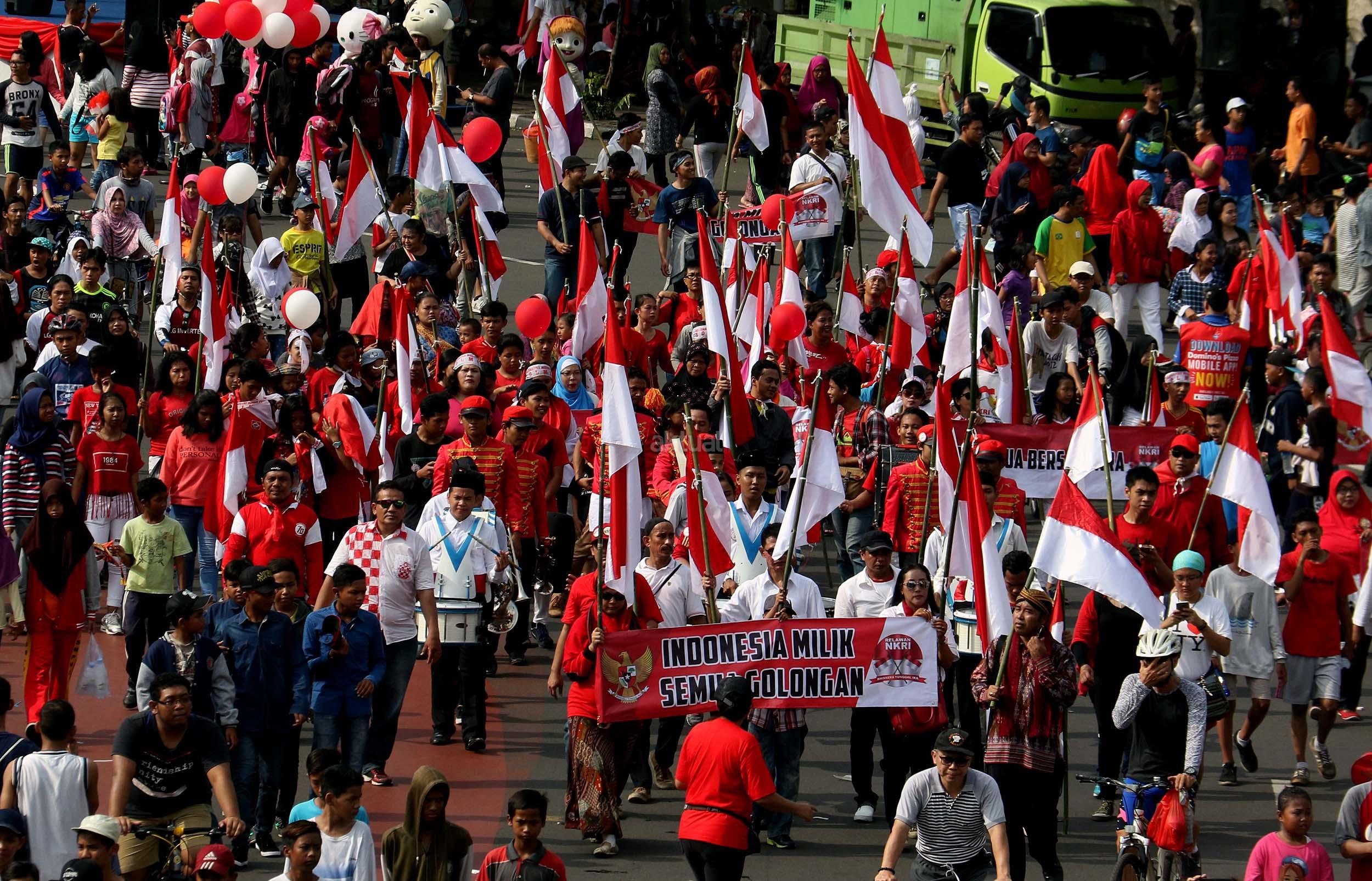 Peserta membentangkan bendera merah putih raksasa pada Karnaval Cinta Budaya NKRI di kawasan Bunderan HI, Jakarta, Minggu (20/11/2016). Karnaval ini bertujuan merawat dan menyiram perdamaian, toleransi, harmoni dan persaudaraan kebangsaan. AKTUAL/Munzir