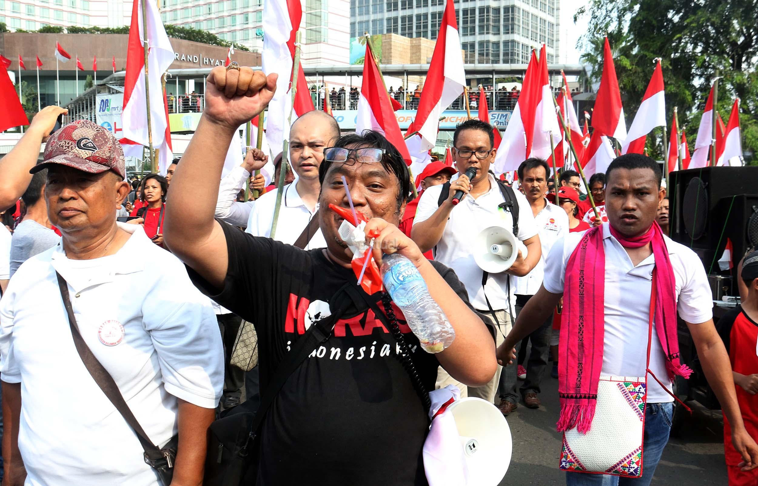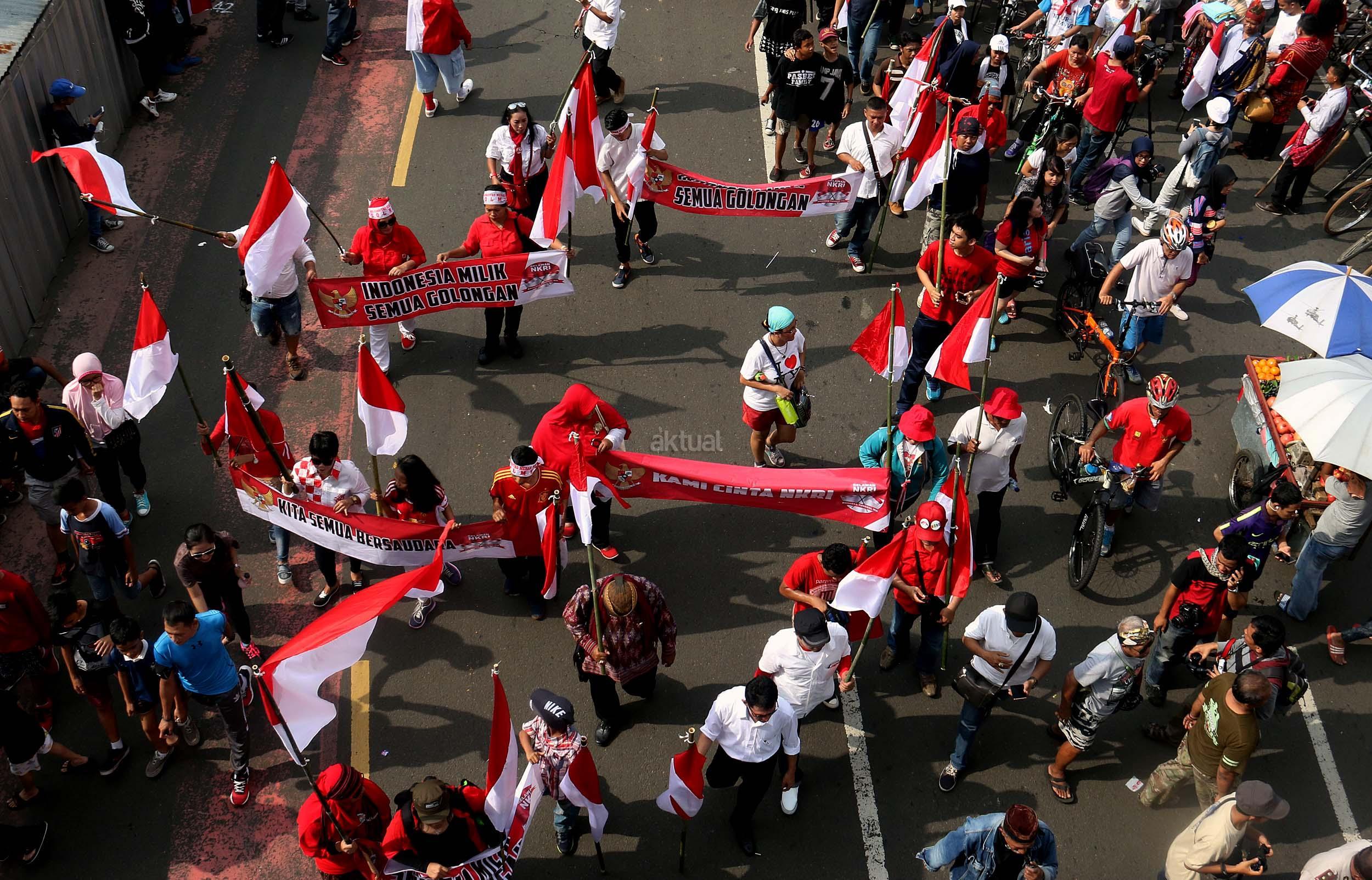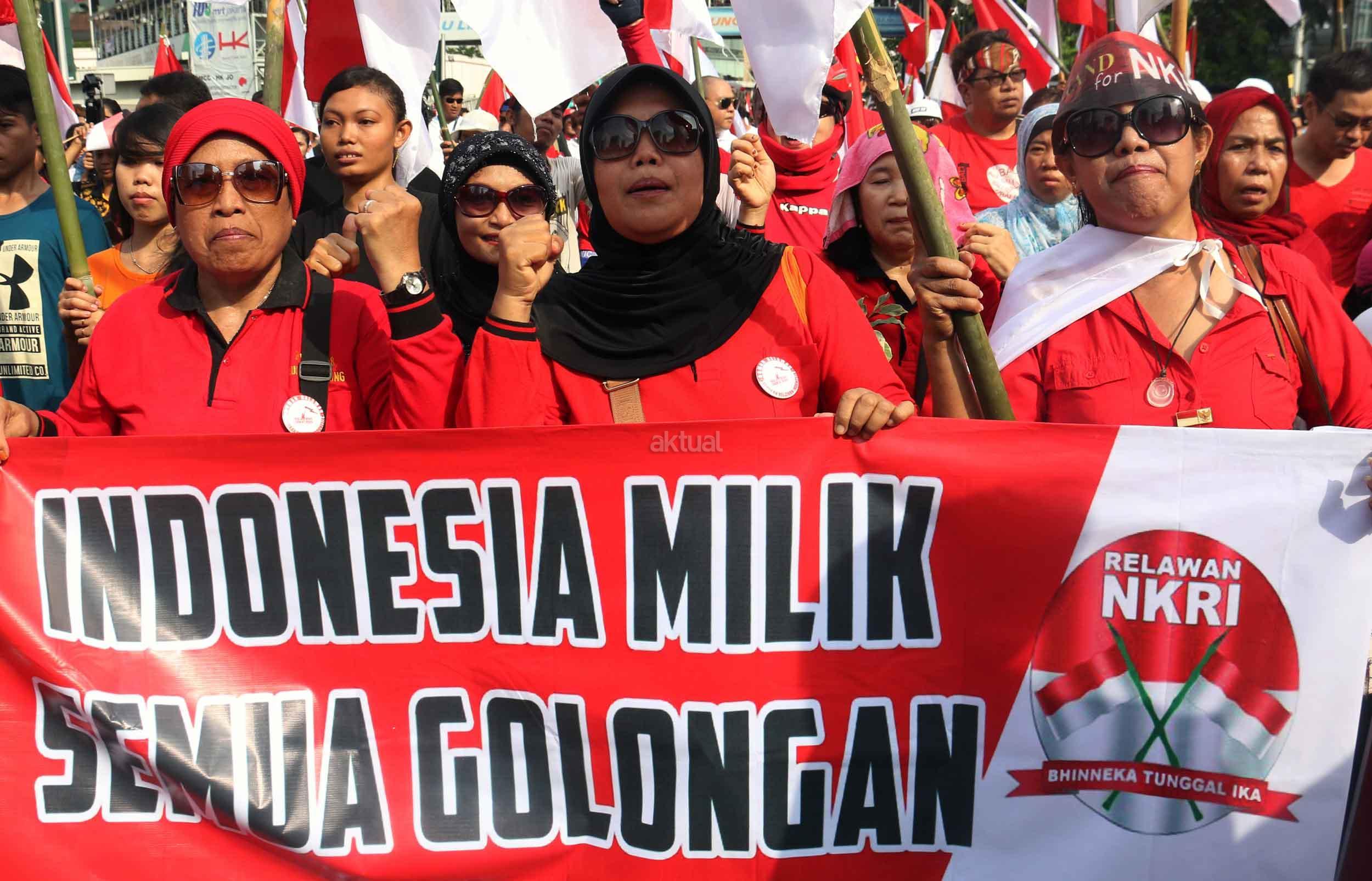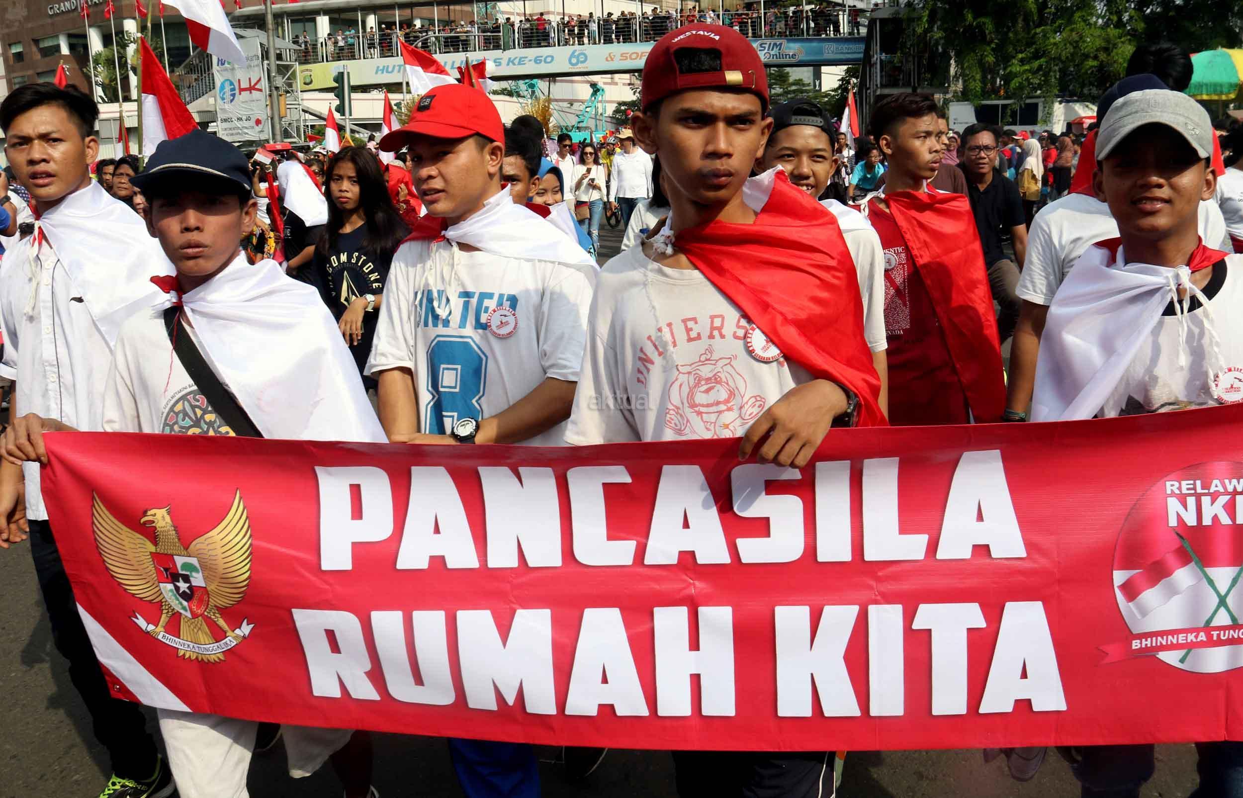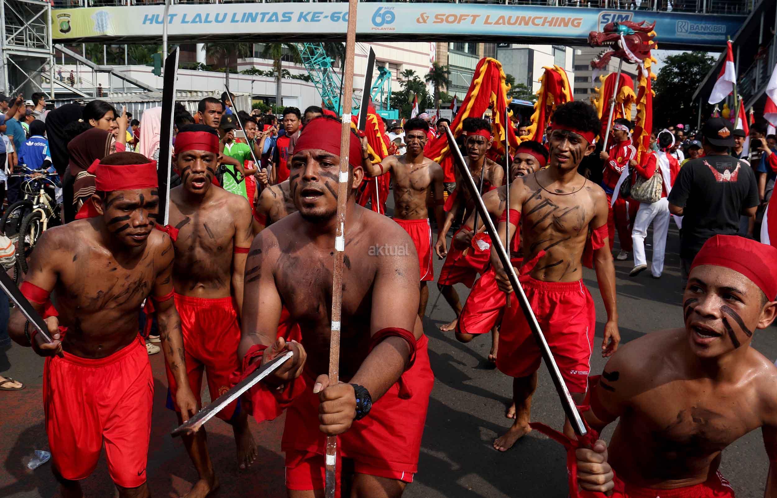 Peserta membentangkan bendera merah putih raksasa pada Karnaval Cinta Budaya NKRI di kawasan Bunderan HI, Jakarta, Minggu (20/11/2016). Karnaval ini bertujuan merawat dan menyiram perdamaian, toleransi, harmoni dan persaudaraan kebangsaan. AKTUAL/Munzir