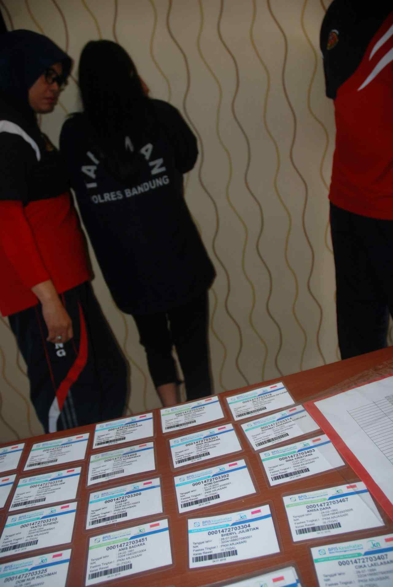 Kartu BPJS palsu tampak depan (kanan) dan tampak belakang (kiri) diperlihatkan saat menggelar ekspos kasus penipuan dan pemalsuan kartu BPJS di kantor Polres Bandung, Soreang, Kabupaten Bandung, Jawa Barat, Jumat (29/7). Polres Bandung Soreang berhasil menangkap satu pelaku berinisial "DD" dan mengamankan 27 kartu BPJS palsu dengan modus operandi sebagai anggota Lembaga Pemberdayaan Masyarakat (LPM). Pelaku dikenai pasal 378 dan 263 KUH Pidana dengan ancaman hukuman maksimal 7 tahun penjara. ANTARA FOTO/Fahrul Jayadiputra/pd/16