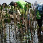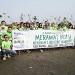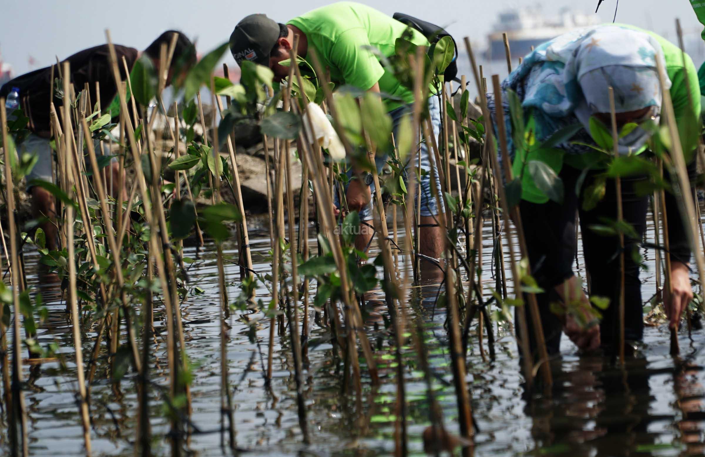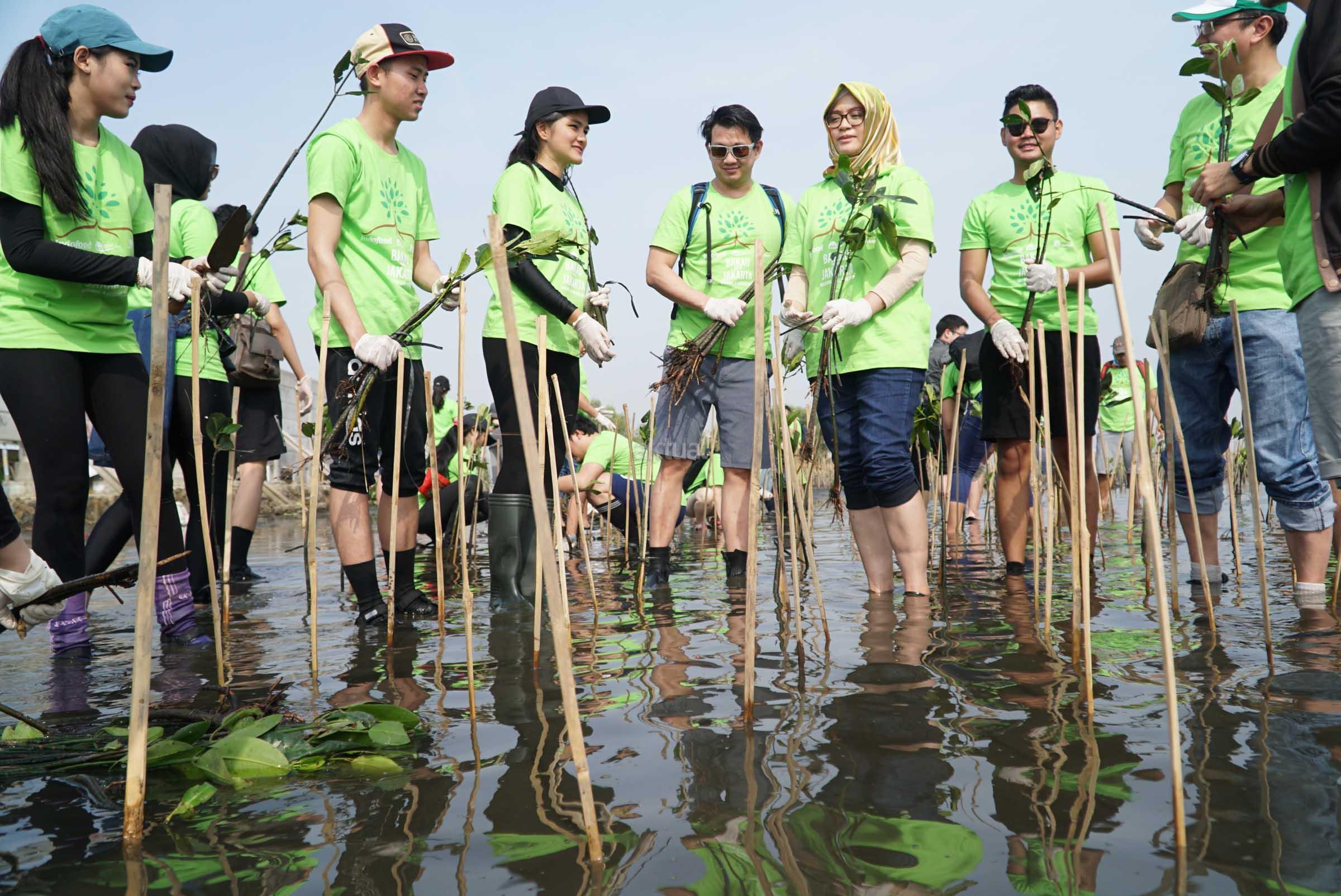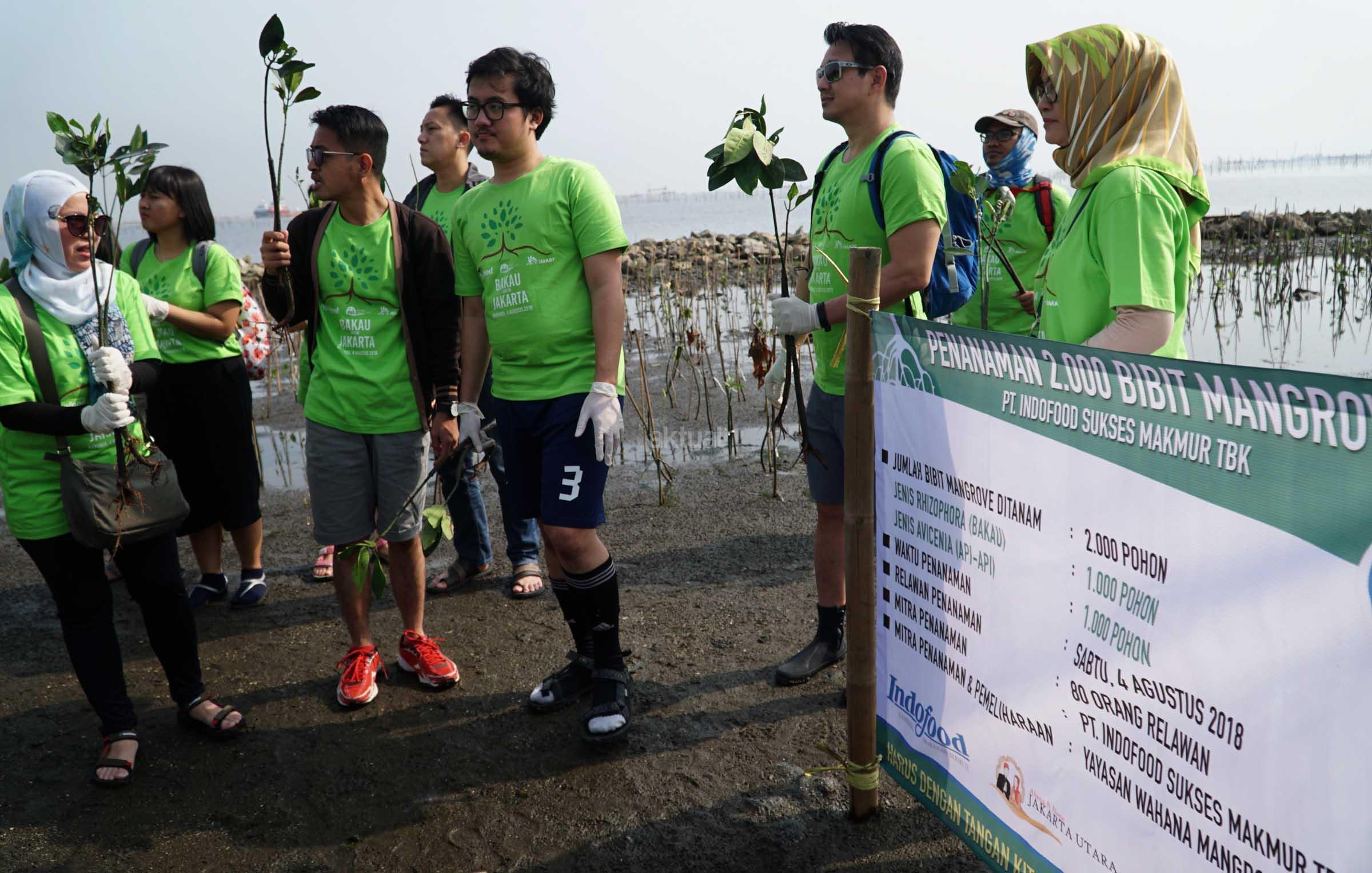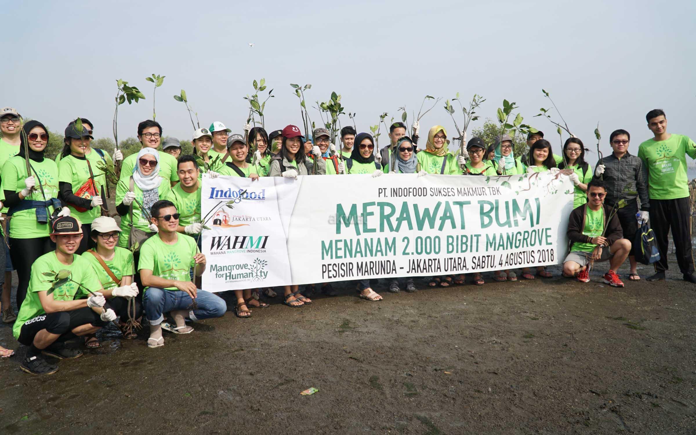 Karyawan/ti PT Indofood Sukses Makmur Tbk melakukan aksi tanam pohon bakau di Pesisir Merunda, Jakarta Utara, Sabtu (4/8).Dalam rangka menyambut hari Mangrove se-dunia, PT Indofood Sukses Makmur Tbk menggelar aksi penanaman 2000 batang pohon mangrove di pesisir Merunda, Jakarta Utara.Acara bertajuk “Bakau untuk Jakarta ” yang digagas Indofood bekerjasama dengan Yayasan Restorasi Mangrove Indonesia (IMARF) ini juga melibatkan karyawan Indofood untuk peduli lingkungan dan berkontribusi secara nyata dengan membeli, menanam serta meningkatkan pemahaman pentingnya tanaman bakau untuk kelangsungan ekosistem sepanjang pesisir pantai. AKTUAL/Eko S Hilman