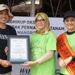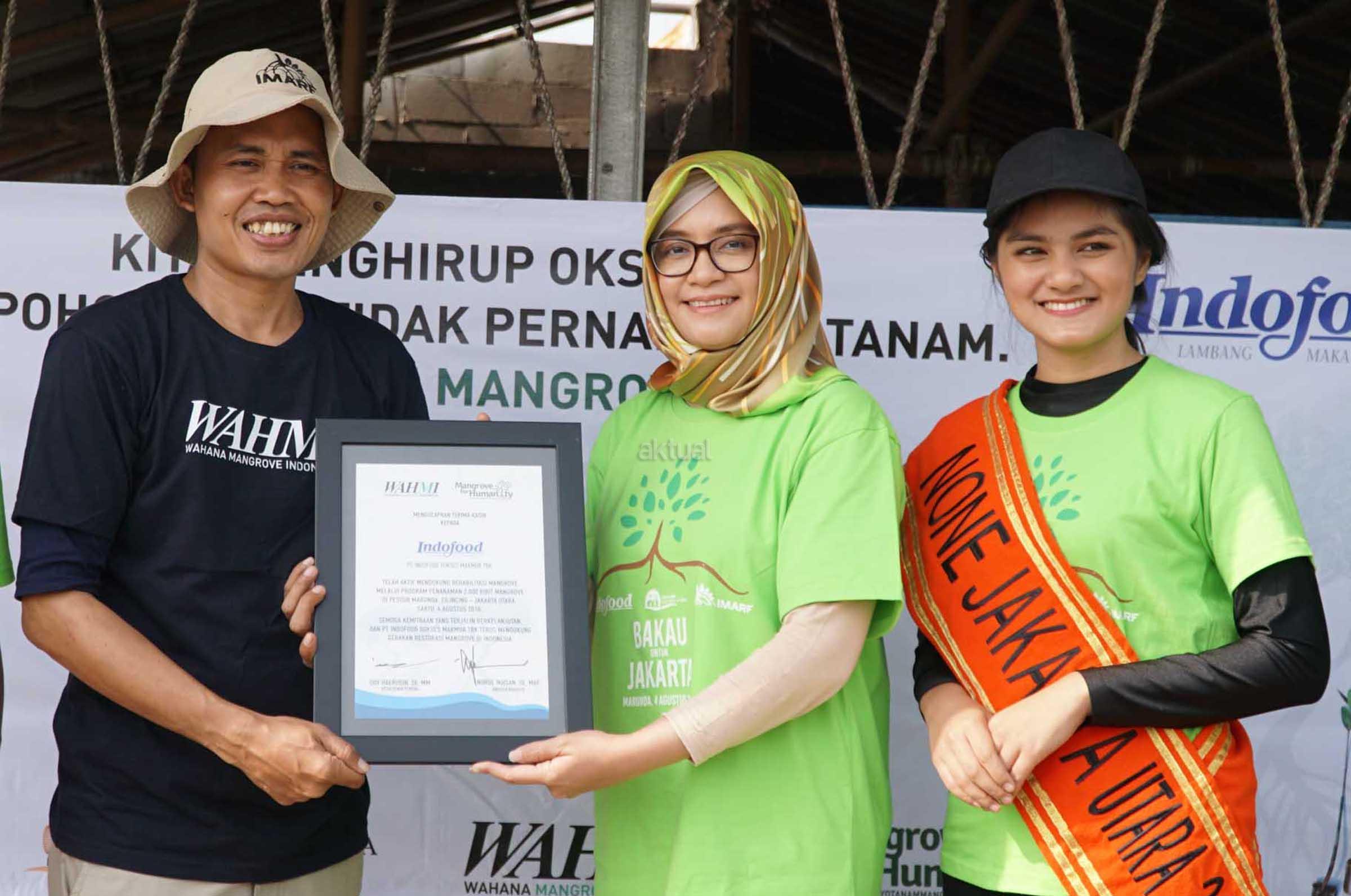 Head of Corporate Public Relations Department PT Indofood Sukses Makmur Tbk Nurulita Novi Arlaida (kedua dari kanan) bersama None Jakarta Utara 2018 Puja Oktaviana (kanan) dan Direktur Eksekutif Yayasan Restorasi Mangrove Indonesia (Indonesia Mangrove Restoration Foundation- IMARF), Nurul Ikhsan (kiri) saat tukar menukar piagam penghargaan dan cinderamata disela kegiatan aksi tanam pohon bakau di Pesisir Merunda, Jakarta Utara, Sabtu (4/8).Dalam rangka menyambut hari Mangrove se-dunia, PT Indofood Sukses Makmur Tbk menggelar aksi penanaman 2000 batang pohon mangrove di pesisir Merunda, Jakarta Utara.Acara bertajuk “Bakau untuk Jakarta ” yang digagas Indofood bekerjasama dengan Yayasan Restorasi Mangrove Indonesia (IMARF) ini juga melibatkan karyawan Indofood untuk peduli lingkungan dan berkontribusi secara nyata dengan membeli, menanam serta meningkatkan pemahaman pentingnya tanaman bakau untuk kelangsungan ekosistem sepanjang pesisir pantai. AKTUAL/Eko S Hilman
