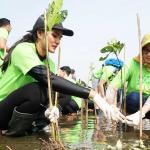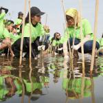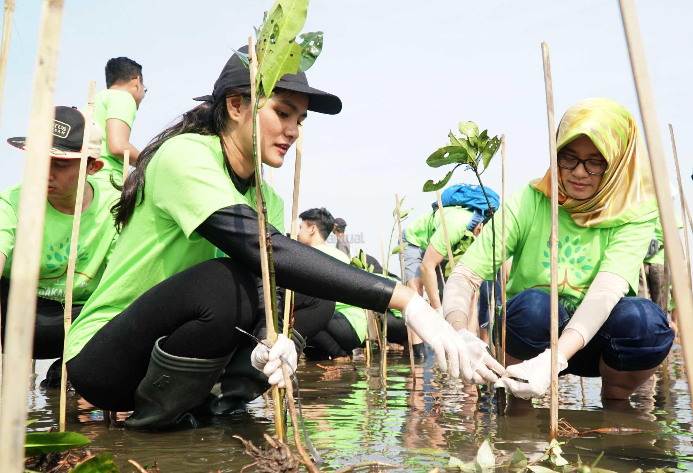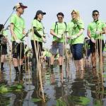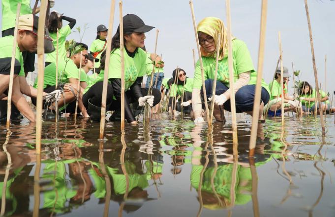 Head of Corporate Public Relations Department PT Indofood Sukses Makmur Tbk Nurulita Novi Arlaida (kanan) bersama karyawan/ti lainnyan dalam kegiatan aksi menanam pohon bakau di Pesisir Merunda, Jakarta Utara, Sabtu (4/8).Dalam rangka menyambut hari Mangrove se-dunia, PT Indofood Sukses Makmur Tbk menggelar aksi penanaman 2000 batang pohon mangrove di pesisir Merunda, Jakarta Utara.Acara bertajuk “Bakau untuk Jakarta ” yang digagas Indofood bekerjasama dengan Yayasan Restorasi Mangrove Indonesia (IMARF) ini juga melibatkan karyawan Indofood untuk peduli lingkungan dan berkontribusi secara nyata dengan membeli, menanam serta meningkatkan pemahaman pentingnya tanaman bakau untuk kelangsungan ekosistem sepanjang pesisir pantai. AKTUAL/Eko S Hilman