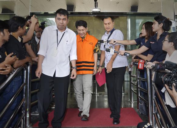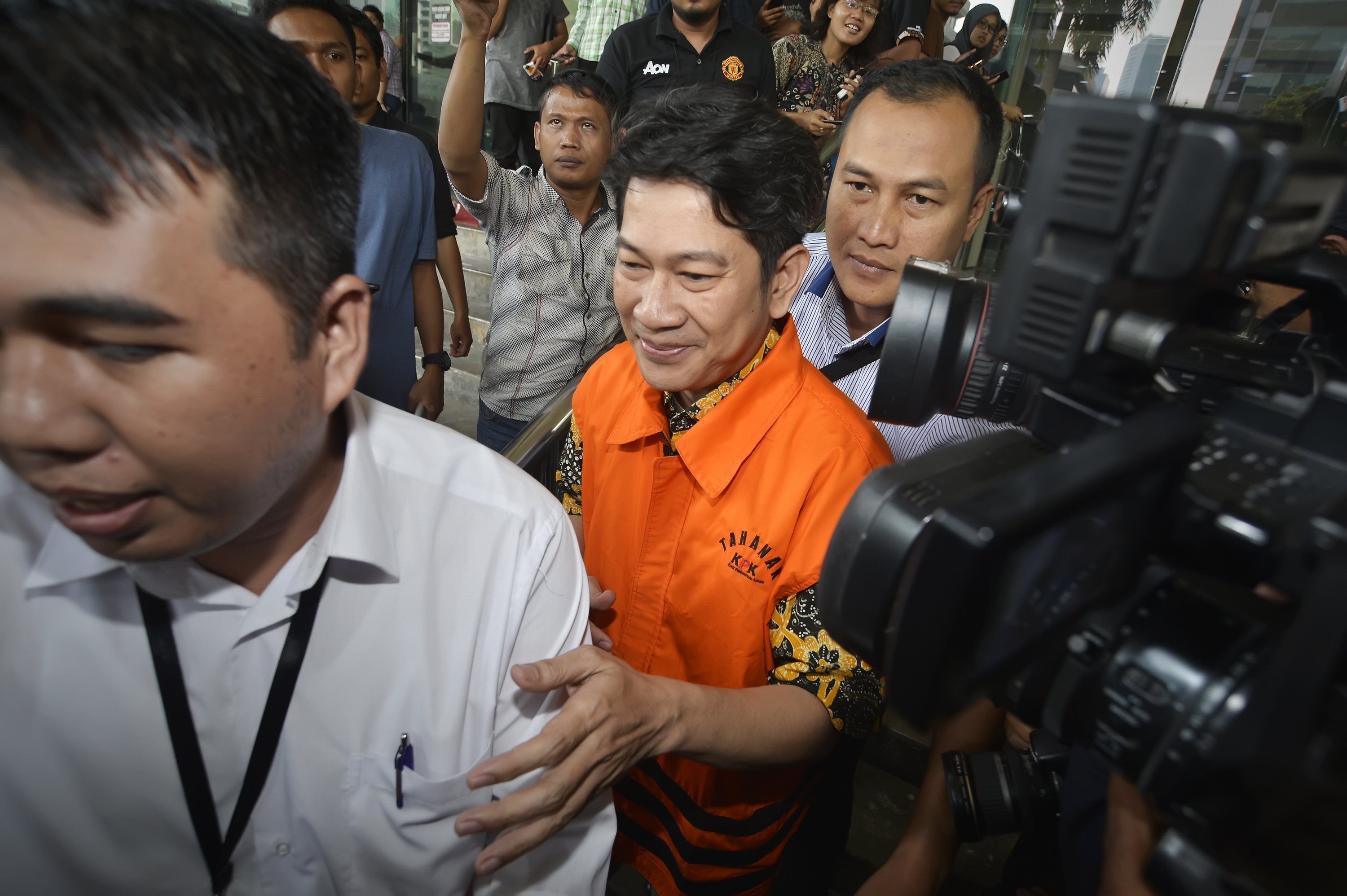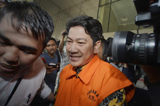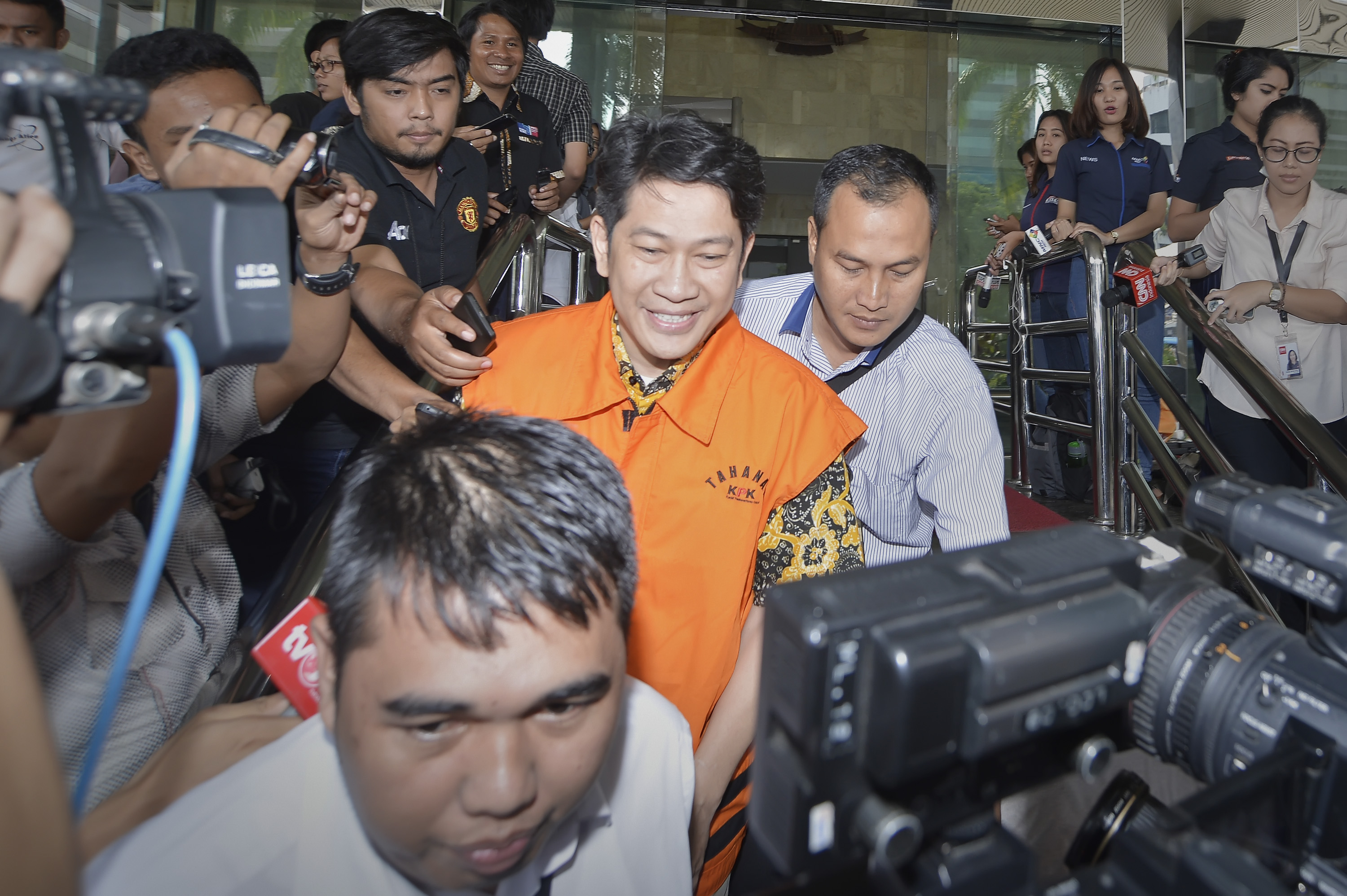 Personal Assistant PT Agung Podomoro Land (APLN) Trinanda Prihantoro (tengah) dikawal petugas usai pemeriksaan oleh penyidik KPK terkait kasus dugaan pemberian hadiah terkait pembahasan Raperda mengenai rencana tata ruang kawasan strategis Pantai Utara, di Jakarta, Senin (18/4). Trinanda yang merupakan perantara suap tersebut diperiksa sebagai saksi dengan tersangka Ketua Komisi D DPRD DKI Mohammad Sanusi. ANTARA FOTO/Yudhi Mahatma/ama/16