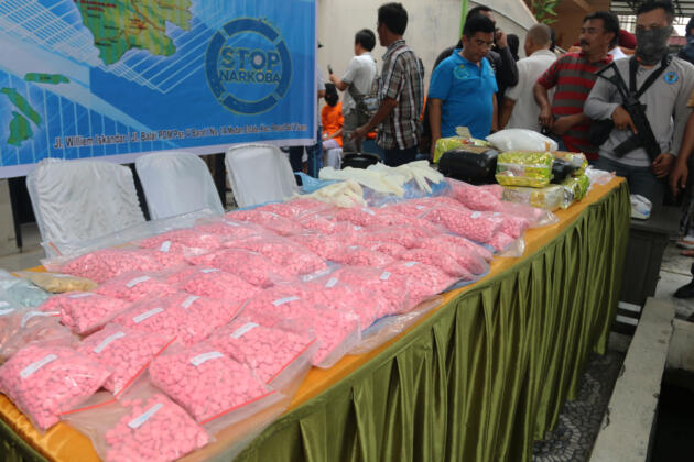 Petugas Badan Narkotika Nasional (BNN) berjaga di dekat barang bukti narkoba saat gelar kasus di Medan, Sumatra Utara, Senin (11/4). BNN menangkap lima orang tersangka kepemilikan narkoba jaringan internasional dengan barang bukti, 21,425 kg sabu-sabu, 44.849 pil ekstasi, dan 6.000 butir pil happy five yang dikendalikan oleh salah seorang narapidana. ANTARA FOTO/Irsan Mulyadi/kye/16
