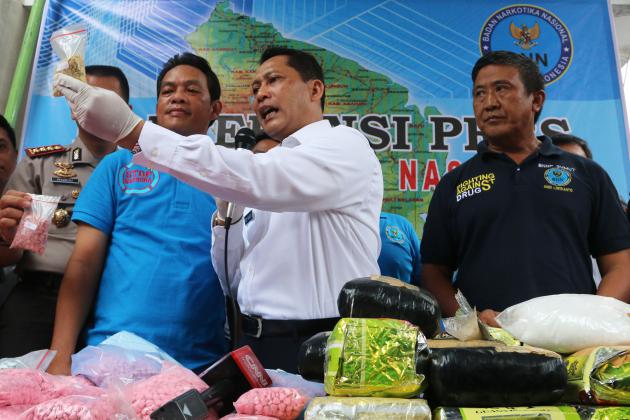 Kepala Badan Narkotika Nasional (BNN) Komjen Pol Budi Waseso (kedua kanan) didampingi Deputi Pemberantasan BNN Irjen Pol Arman Depari (kedua kiri), dan Kepala BNN Provinsi Sumut Brigjen Pol Andi Loedianto (kanan) menunjukan barang bukti narkoba saat gelar kasus di Medan, Sumatra Utara, Senin (11/4). BNN menangkap lima orang tersangka kepemilikan narkoba jaringan internasional dengan barang bukti, 21,425 kg sabu-sabu, 44.849 pil ekstasi, dan 6.000 butir pil happy five yang dikendalikan oleh salah seorang narapidana. ANTARA FOTO/Irsan Mulyadi/kye/16