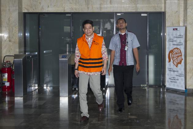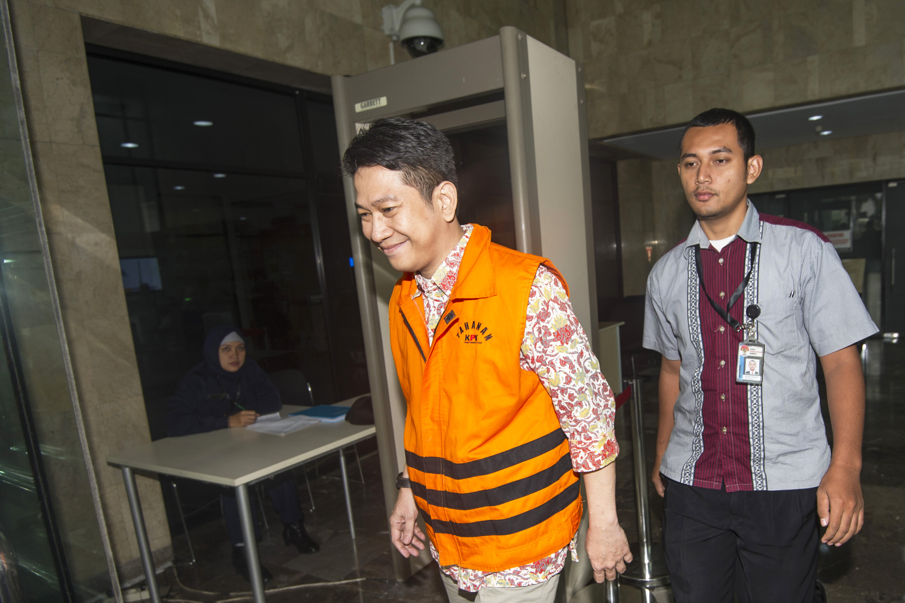 Karyawan PT Agung Podomoro Land (APLN) Trinanda Prihantoro (tengah) keluar dari Gedung KPK usai menjalani pemeriksaan di Jakarta, Senin (16/5). Trinanda diperiksa sebagai tersangka atas terkait kasus dugaan suap di DPRD DKI Jakarta dalam pembahasan Raperda Rencana Tata Ruang Kawasan Strategis Pantai Jakarta Utara dan Raperda Zonasi Wilayah Pesisir dan Pulau-Pulau Kecil Provinsi DKI Jakarta tahun 2015-2035. ANTARA FOTO/Sigid Kurniawan/foc/16.