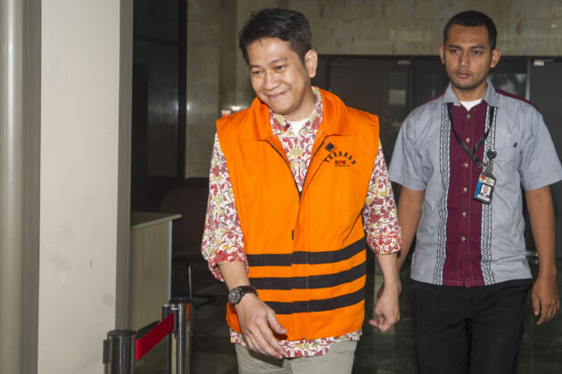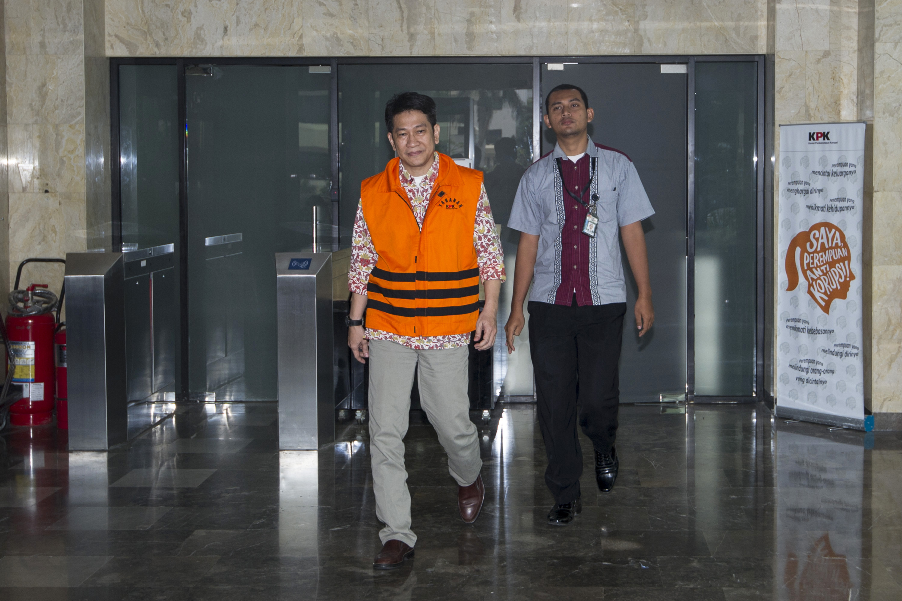 Karyawan PT Agung Podomoro Land (APLN) Trinanda Prihantoro (kiri) keluar dari Gedung KPK usai menjalani pemeriksaan di Jakarta, Senin (16/5). Trinanda diperiksa sebagai tersangka atas terkait kasus dugaan suap di DPRD DKI Jakarta dalam pembahasan Raperda Rencana Tata Ruang Kawasan Strategis Pantai Jakarta Utara dan Raperda Zonasi Wilayah Pesisir dan Pulau-Pulau Kecil Provinsi DKI Jakarta tahun 2015-2035. ANTARA FOTO/Sigid Kurniawan/foc/16.