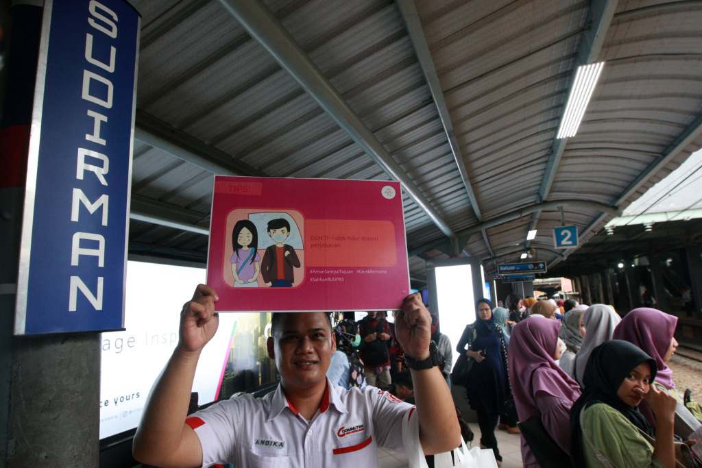 Petugas PT Kereta Commuter Indonesia (KCI) melakukan kampanye dengan membagikan lembaran himbauan saat kampanye di Stasiun Sudirman, Jakarta Pusat, Selasa (12/3/2019). PT KCI memperingati hari Perempuan melalui kampanye mencegah pelecehan seksual di transportasi publik. AKTUAL/Tino Oktaviano