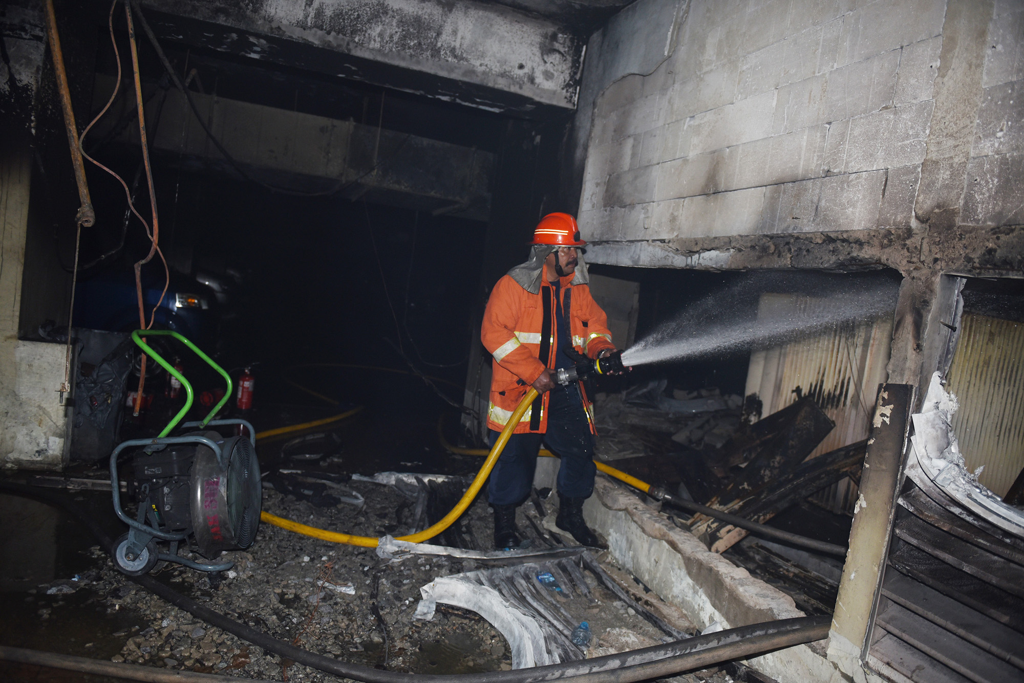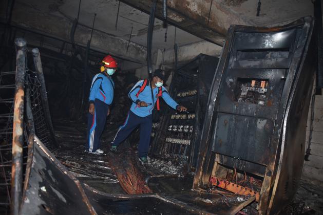 Petugas pemadam kebakaran memeriksa bagian basement Gedung Direktorat Pajak yang terbakar di Jakarta, Jumat (31/7). Pemadam kebakaran mengerahkan 22 mobil damkar untuk memadamkan kebakaran yang terjadi di basement Gedung Direktorat Pajak. ANTARA FOTO/Hafidz Mubarak A./ed/ama/15