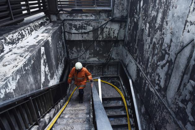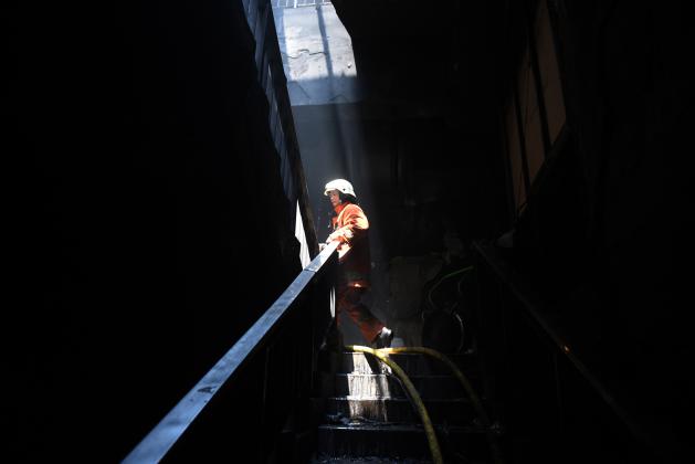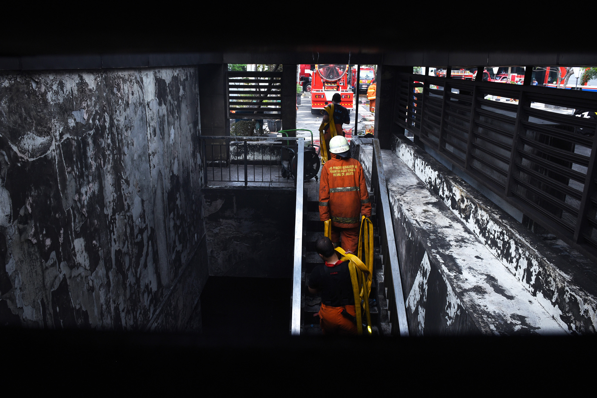 Petugas pemadam kebakaran berjalan keluar usai memadamkan api di basement Gedung Direktorat Pajak, Jakarta, Jumat (31/7). Pemadam kebakaran mengerahkan 22 mobil damkar untuk memadamkan kebakaran yang terjadi di basement Gedung Direktorat Pajak. ANTARA FOTO/Hafidz Mubarak A./ed/ama/15
