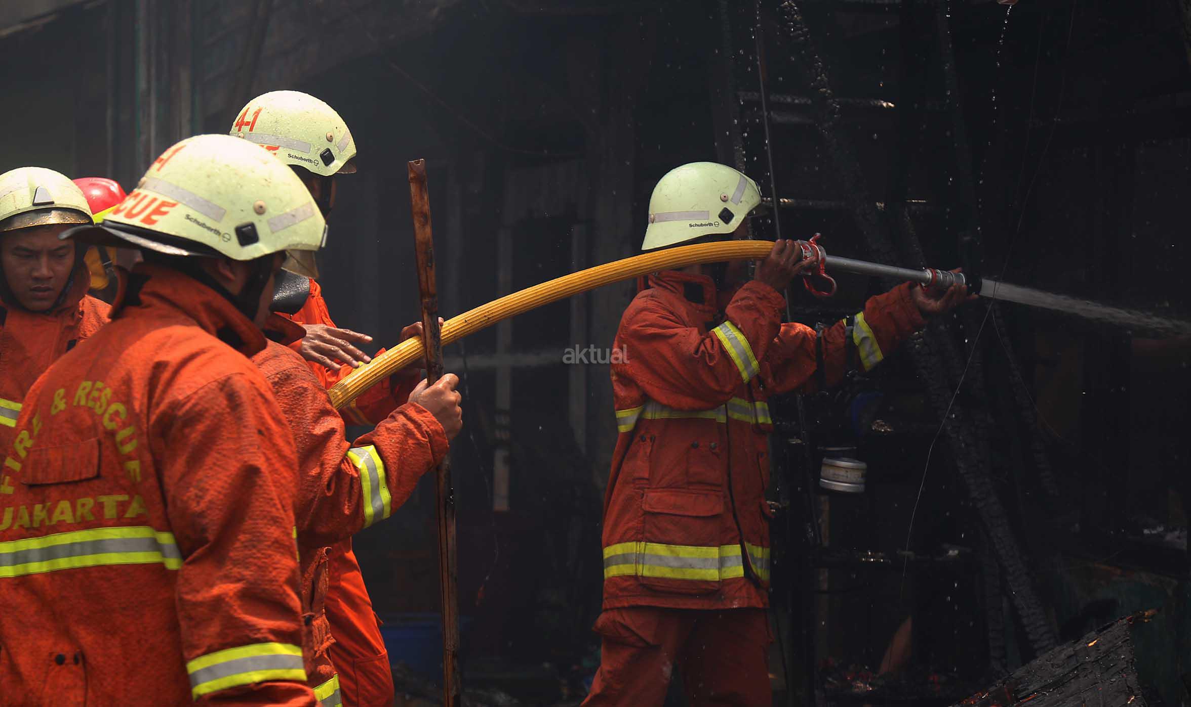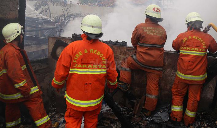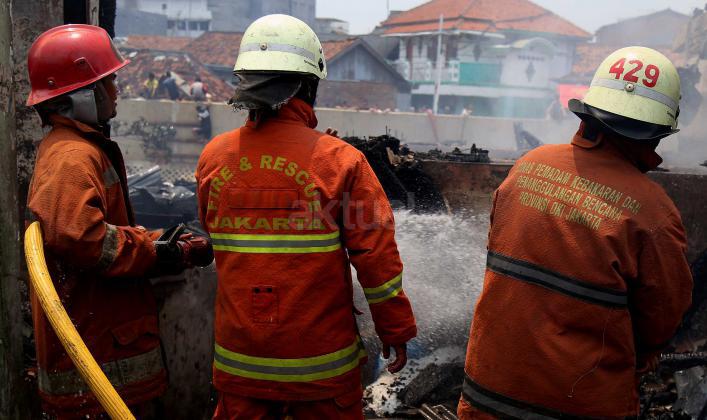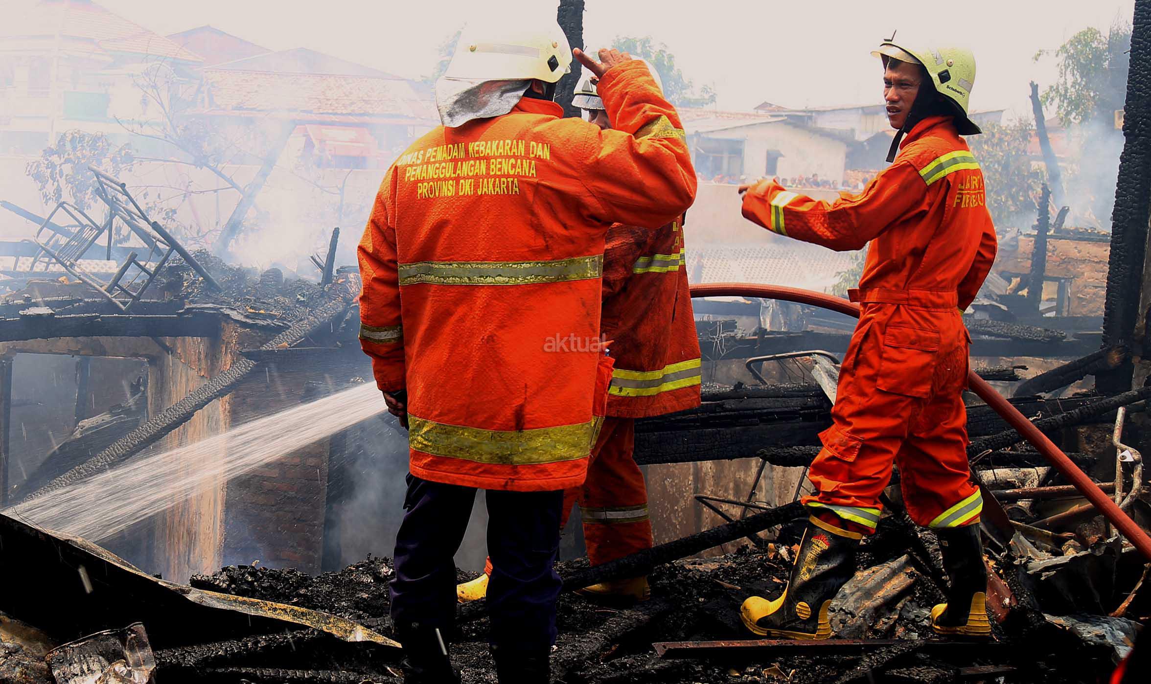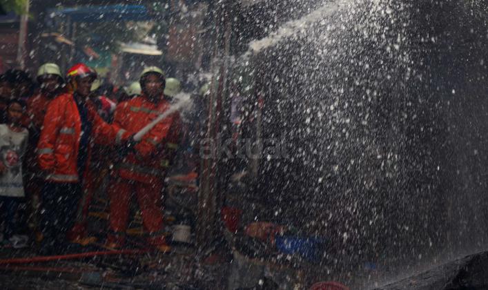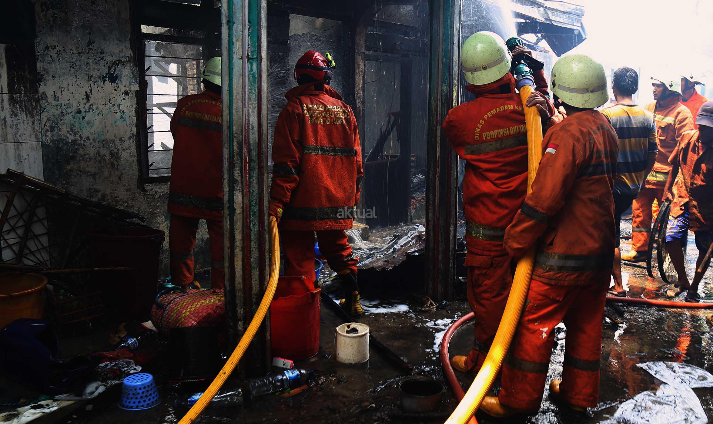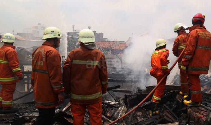 Petugas pemadam kebakaran melakukan pendinginan titik api yang membakar pemukiman pada penduduk di Kelurahan Bukit Duri, Jakarta Selatan, Selasa (23/2/2016). Dugaan, kebakaran yang melanda kawasan tersebut disebabkan konsleting listrik dari salah satu rumah warga dan sedikitnya 42 mobil pemadam sudah dikerahkan untuk memadamkan kobaran api.