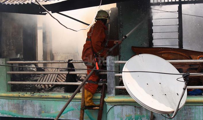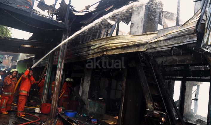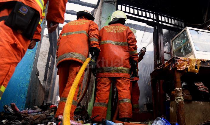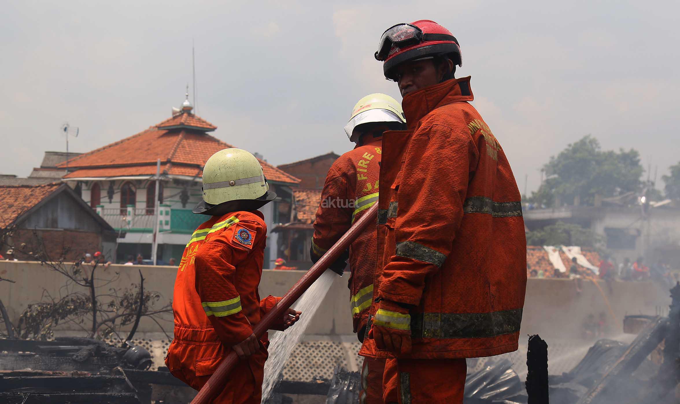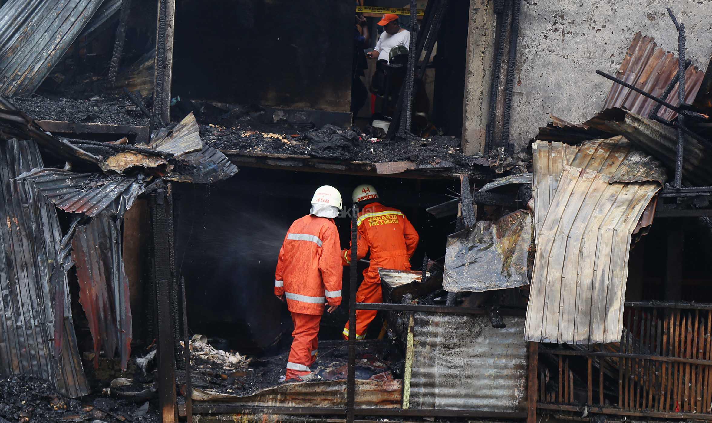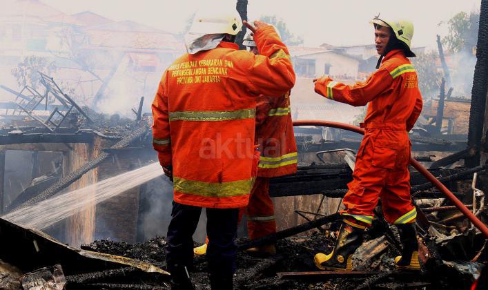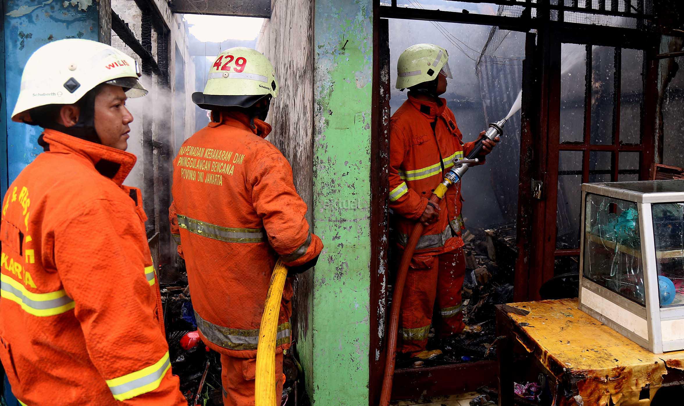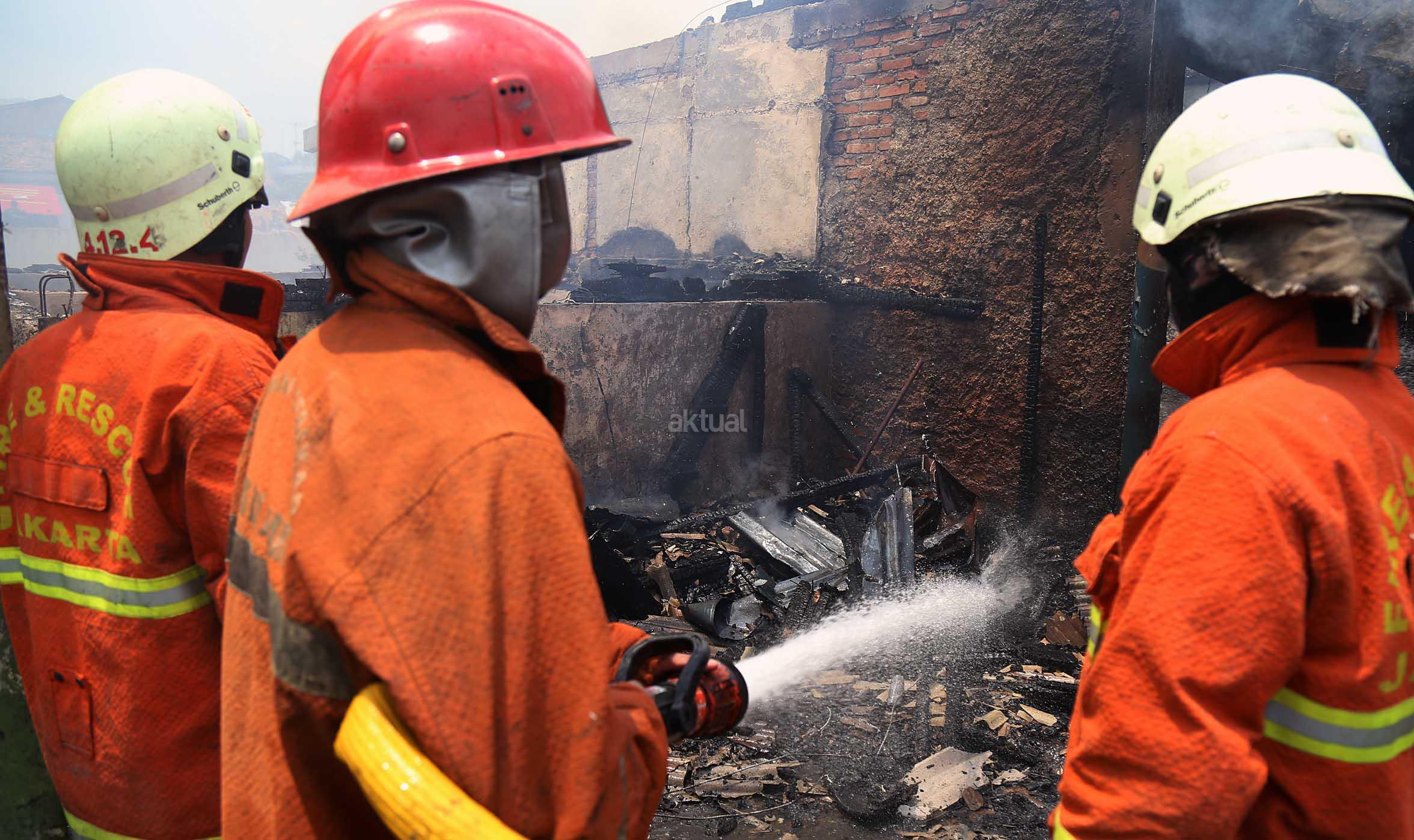 Petugas pemadam kebakaran melakukan pendinginan titik api yang membakar pemukiman pada penduduk di Kelurahan Bukit Duri, Jakarta Selatan, Selasa (23/2/2016). Dugaan, kebakaran yang melanda kawasan tersebut disebabkan konsleting listrik dari salah satu rumah warga dan sedikitnya 42 mobil pemadam sudah dikerahkan untuk memadamkan kobaran api.