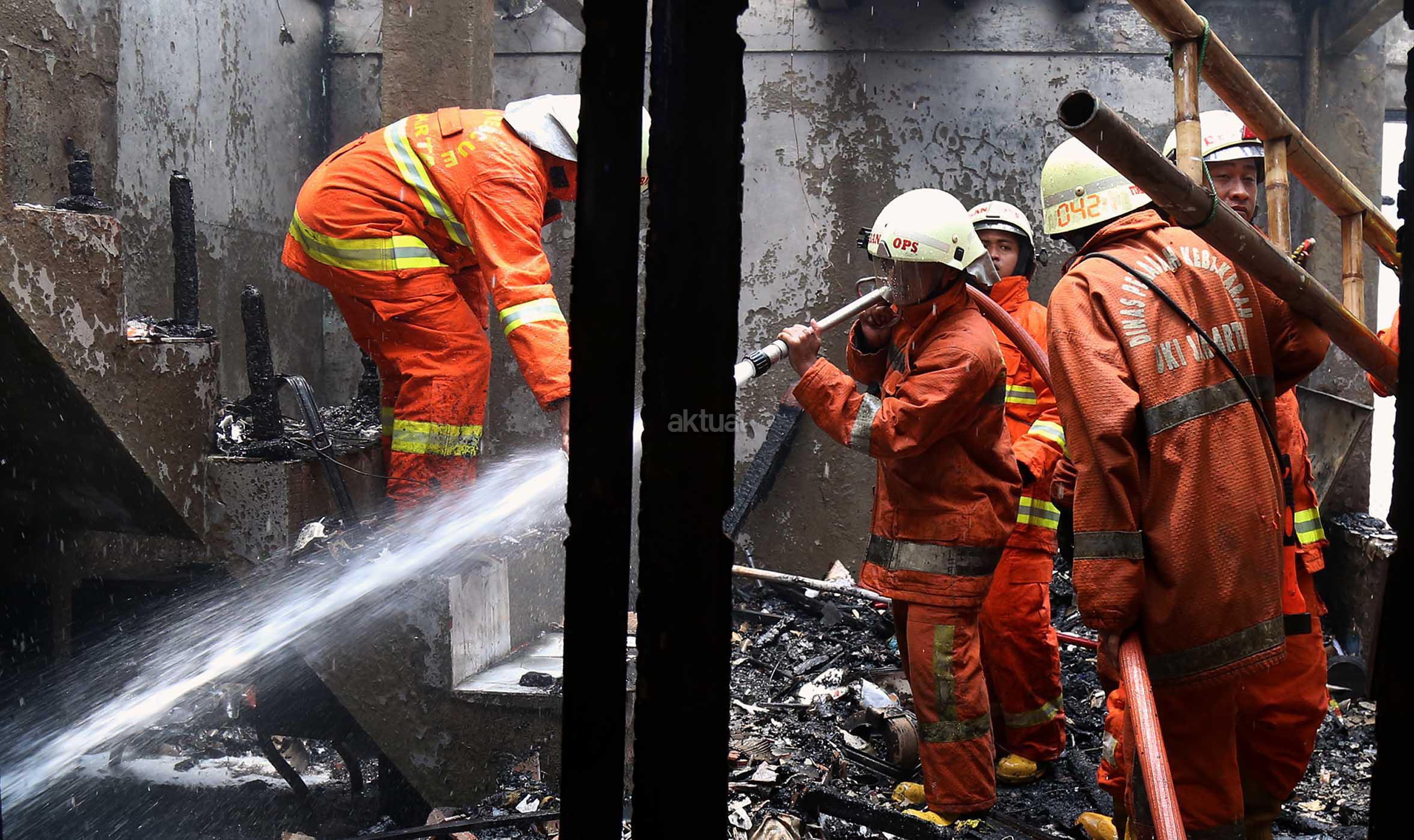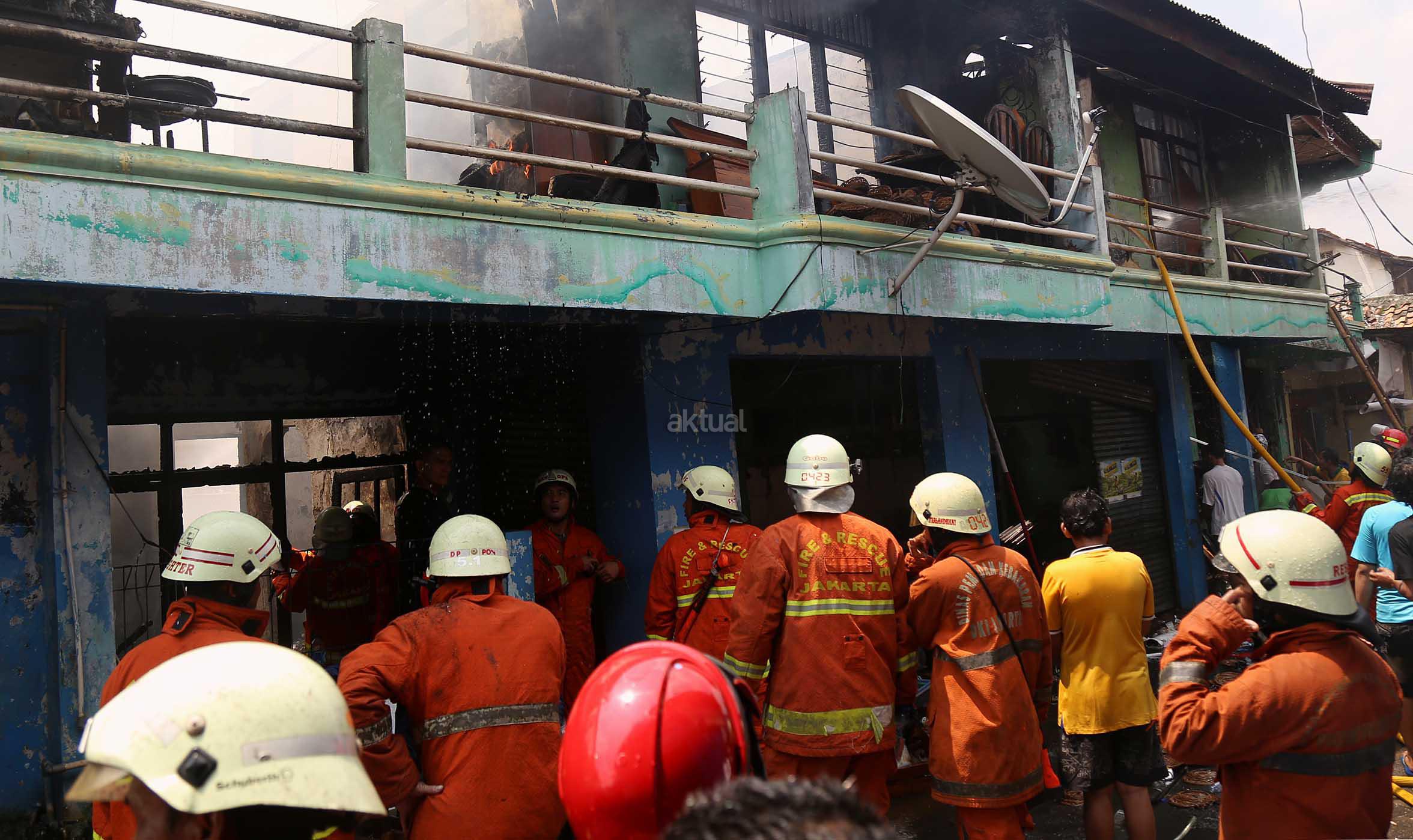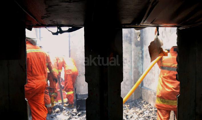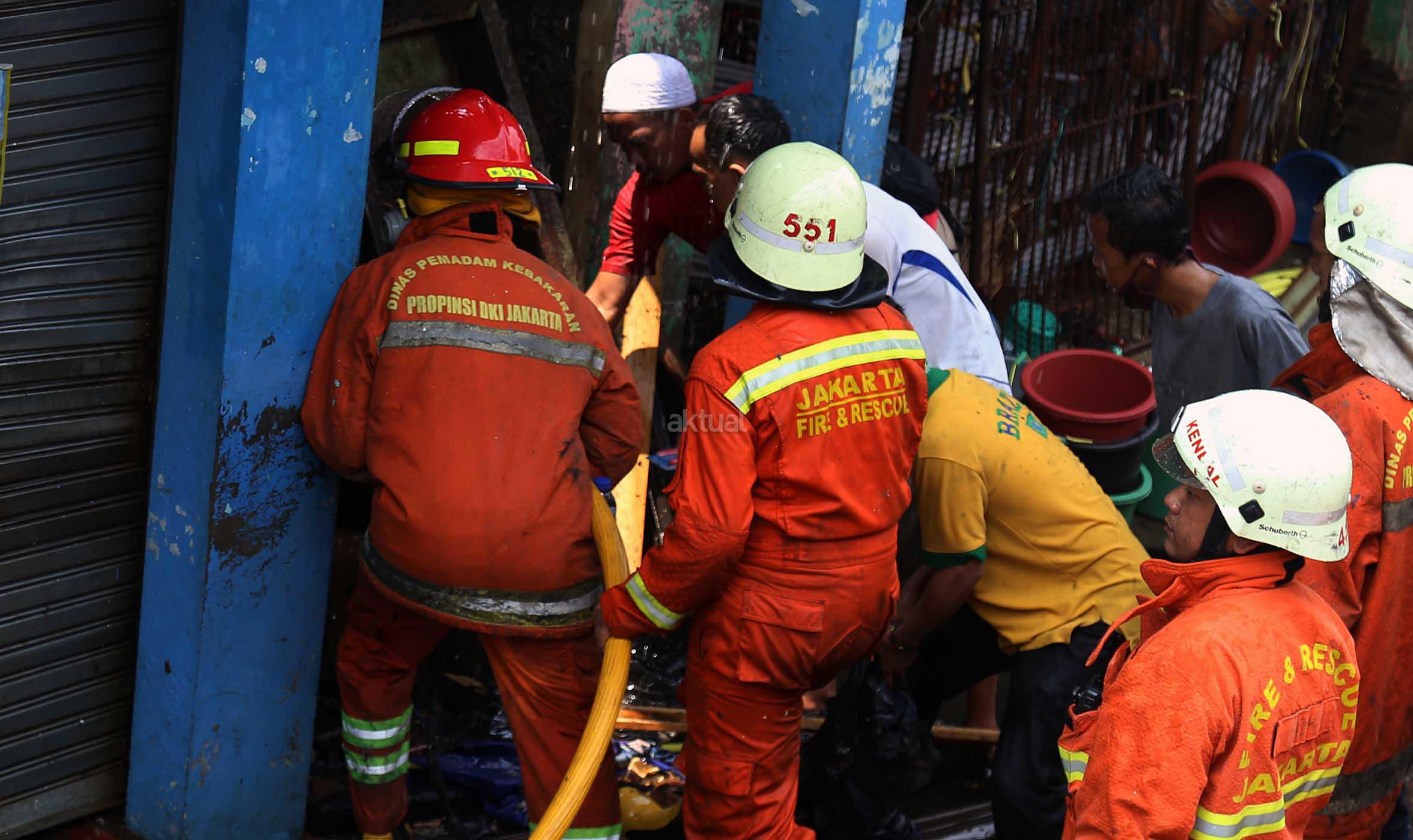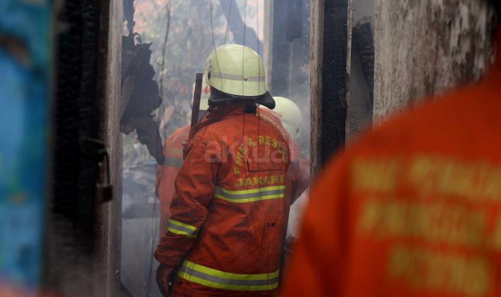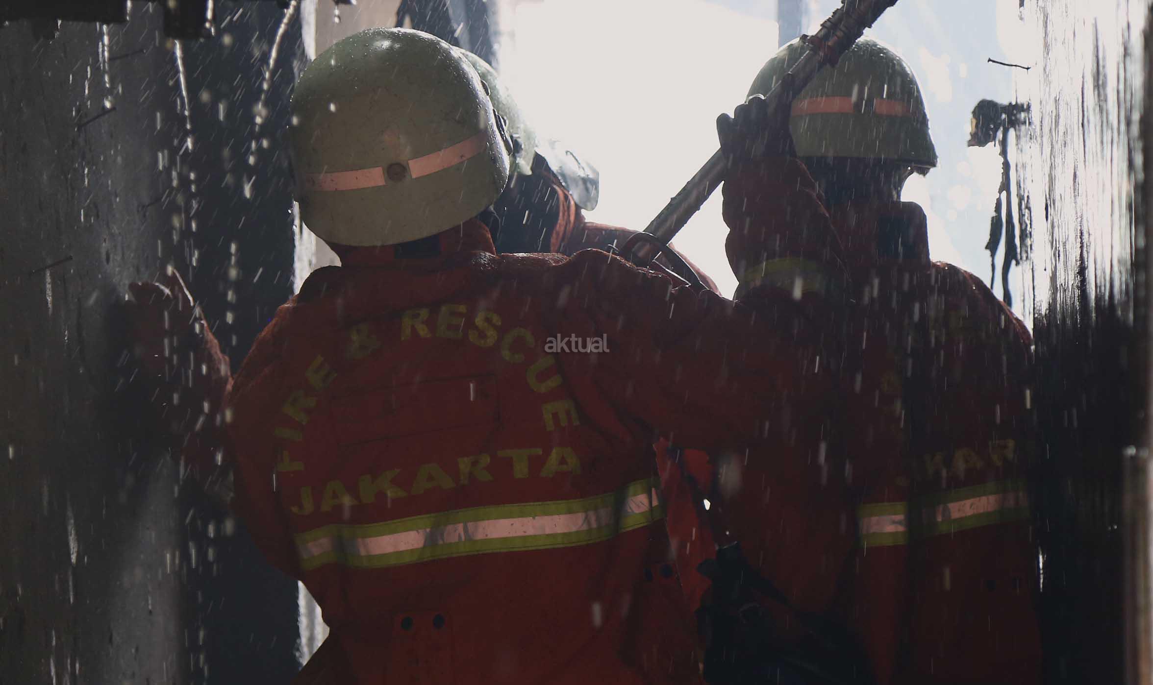 Petugas pemadam kebakaran melakukan pendinginan titik api yang membakar pemukiman pada penduduk di Kelurahan Bukit Duri, Jakarta Selatan, Selasa (23/2/2016). Dugaan, kebakaran yang melanda kawasan tersebut disebabkan konsleting listrik dari salah satu rumah warga dan sedikitnya 42 mobil pemadam sudah dikerahkan untuk memadamkan kobaran api.