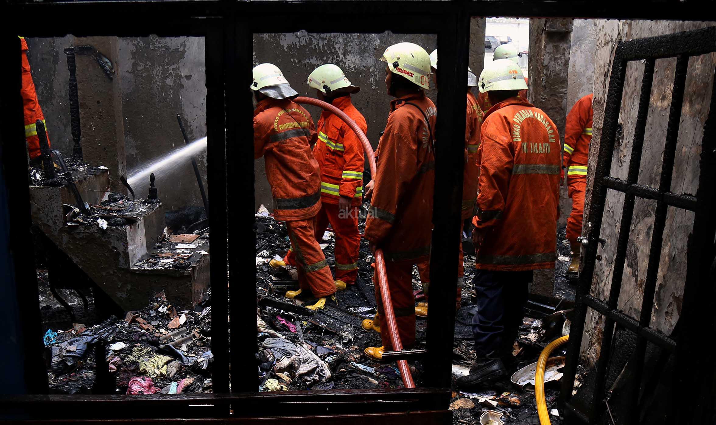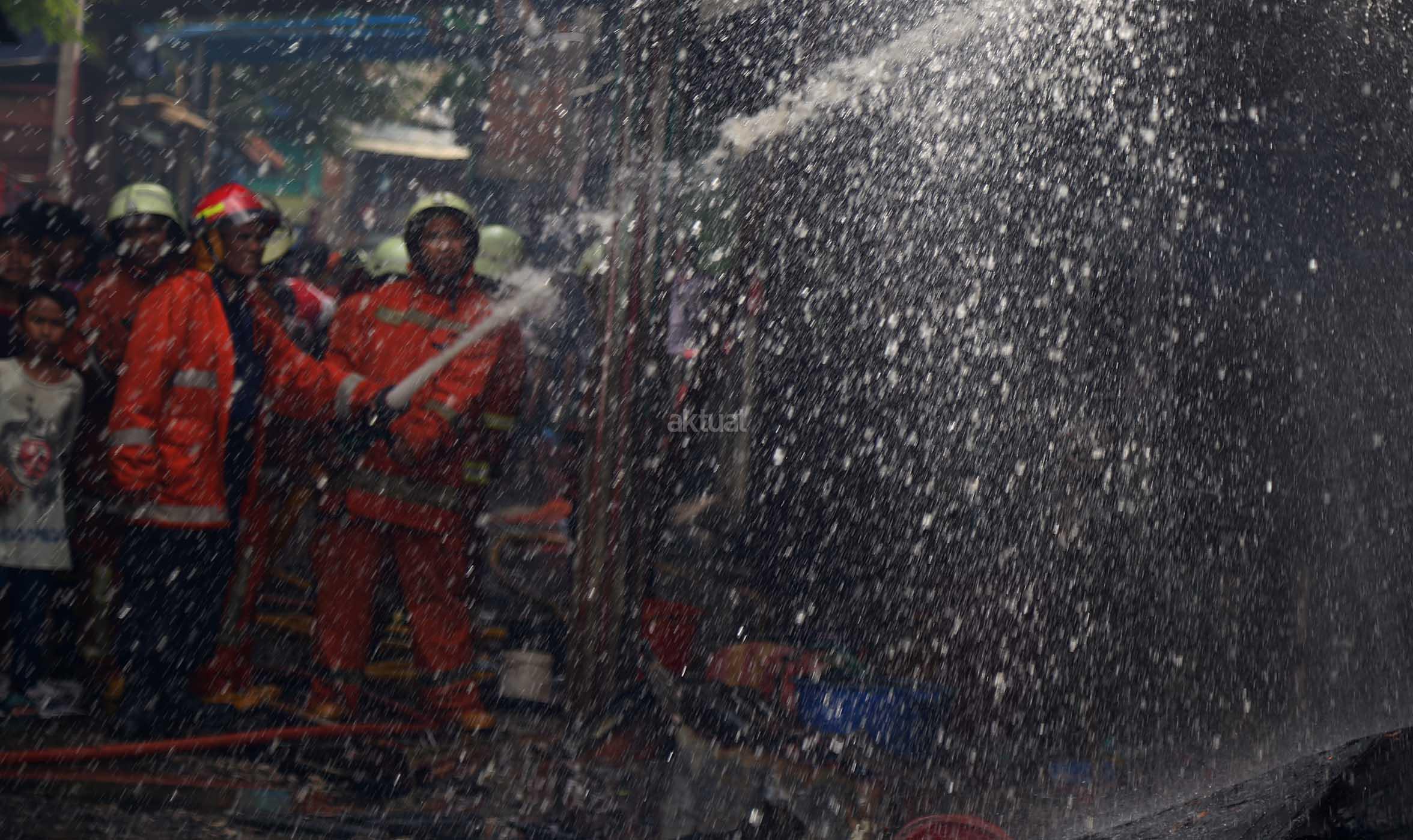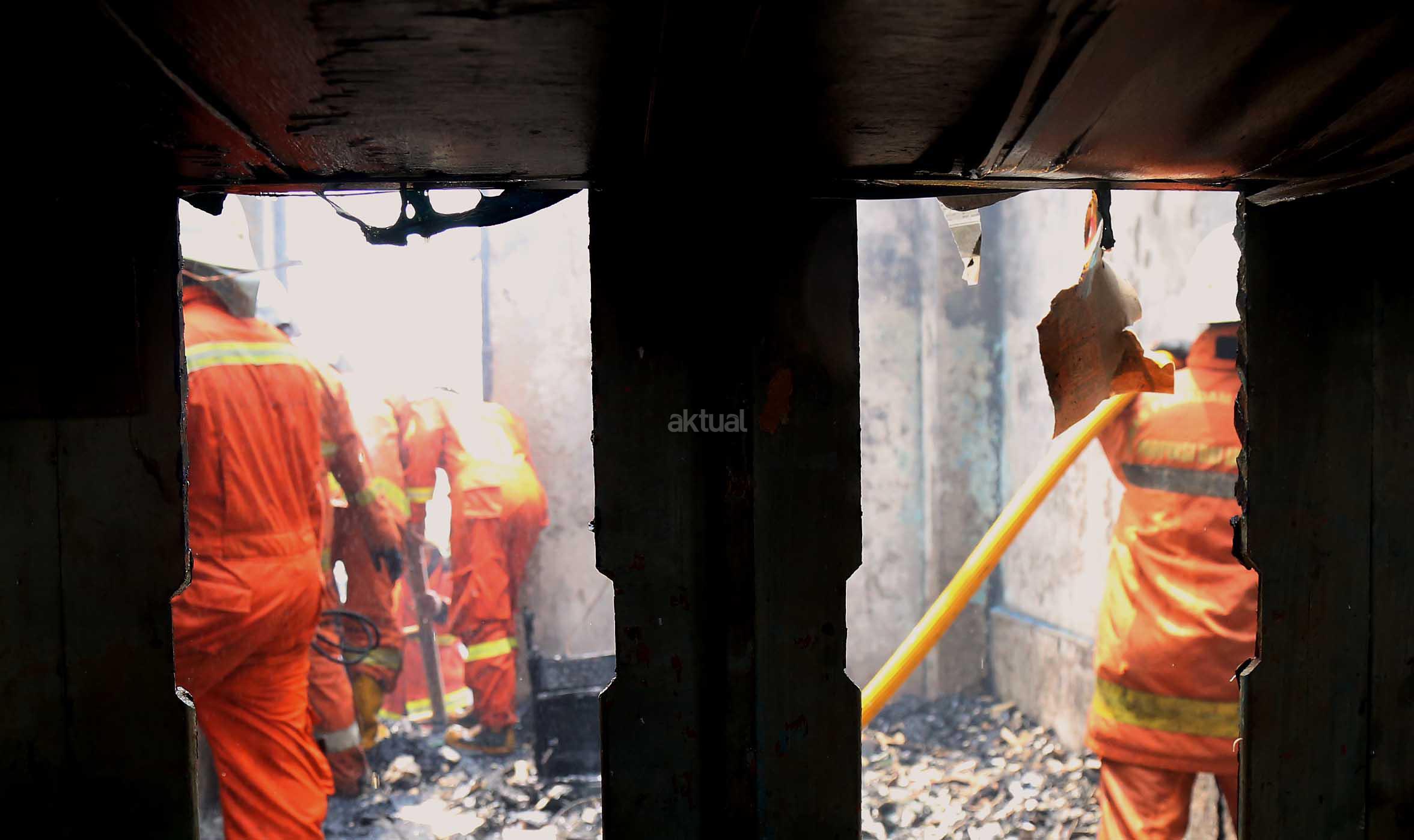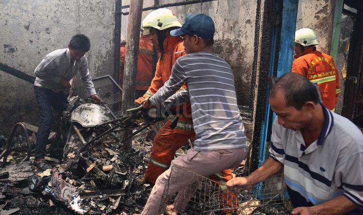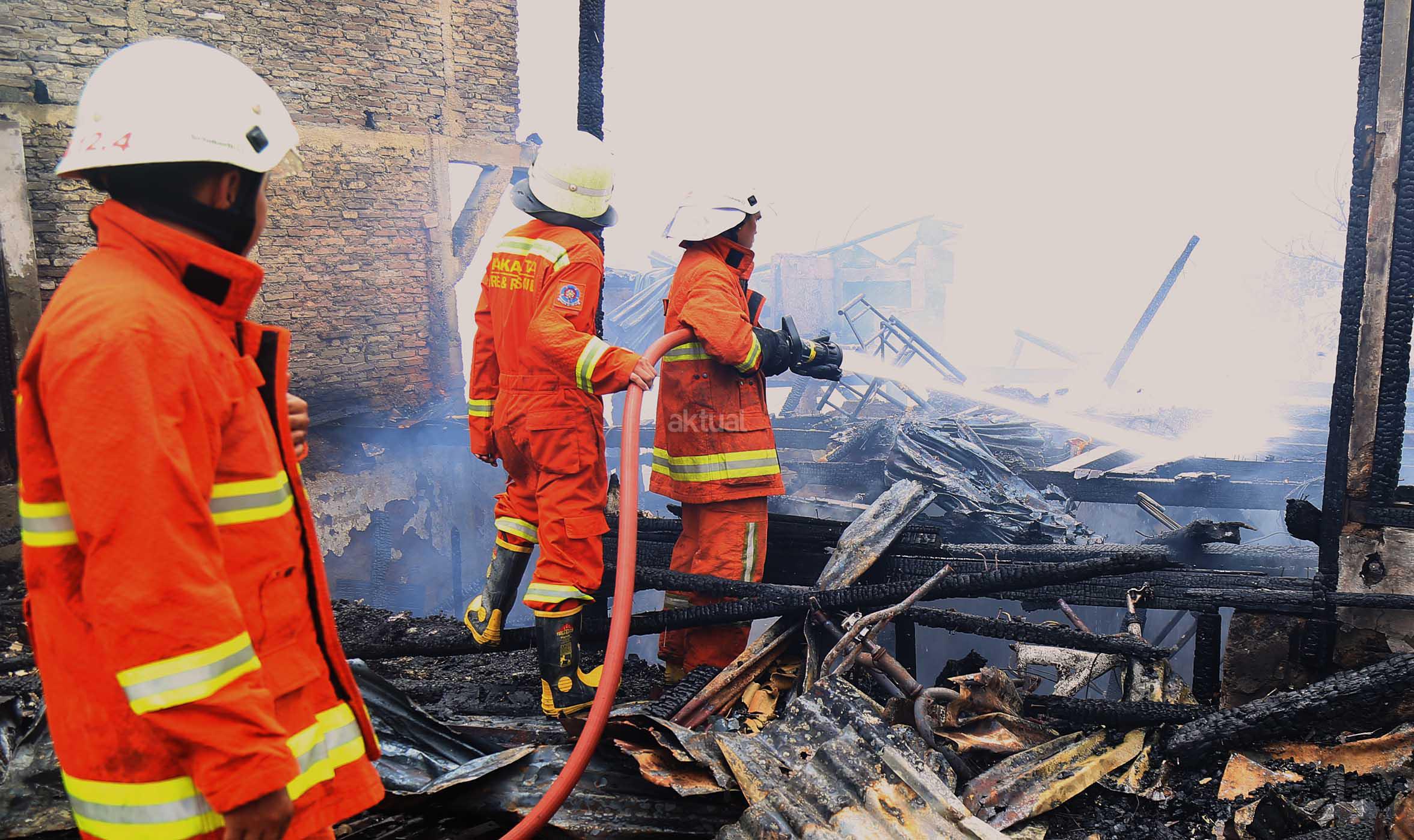 Petugas pemadam kebakaran melakukan pendinginan titik api yang membakar pemukiman pada penduduk di Kelurahan Bukit Duri, Jakarta Selatan, Selasa (23/2/2016). Dugaan, kebakaran yang melanda kawasan tersebut disebabkan konsleting listrik dari salah satu rumah warga dan sedikitnya 42 mobil pemadam sudah dikerahkan untuk memadamkan kobaran api.