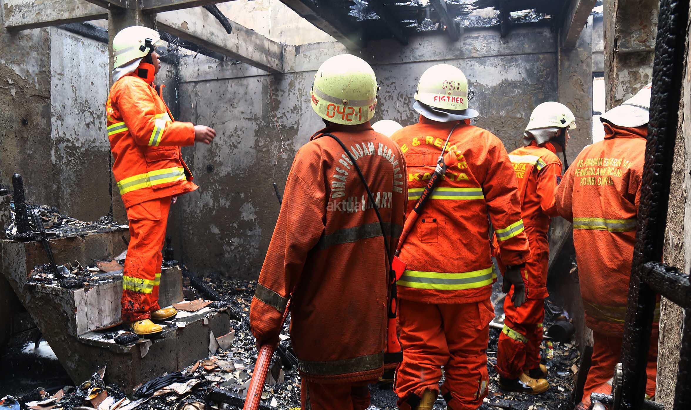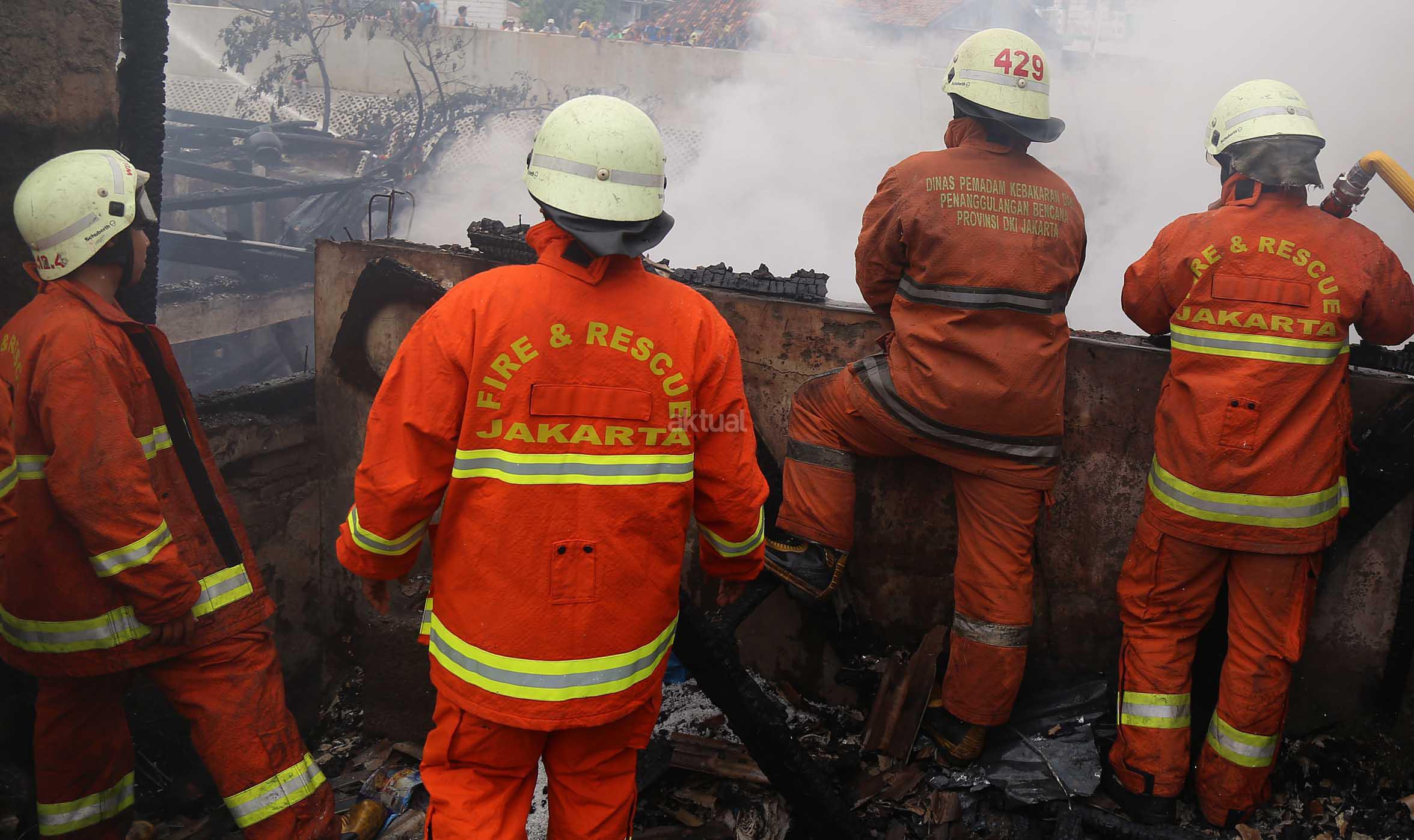 Tim pemadam kebakaran saat melakukan pendinginan titik api yang membakar pemukiman pada penduduk di Kelurahan Bukit Duri, Jakarta Selatan, Selasa (23/2/2016). Dugaan, kebakaran yang melanda kawasan tersebut disebabkan konsleting listrik dari salah satu rumah warga dan sedikitnya 42 mobil pemadam sudah dikerahkan untuk memadamkan kobaran api.