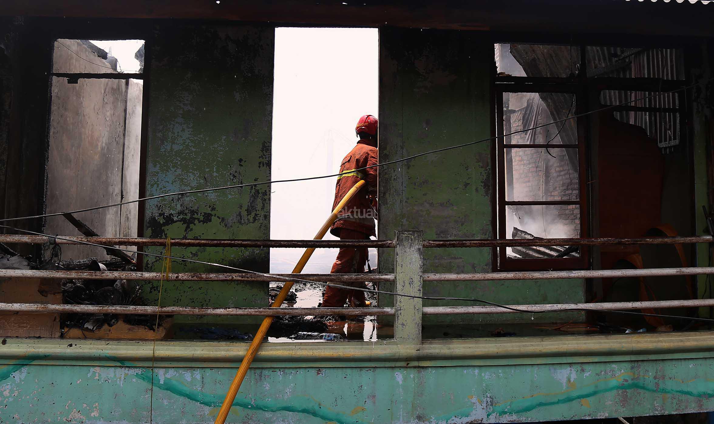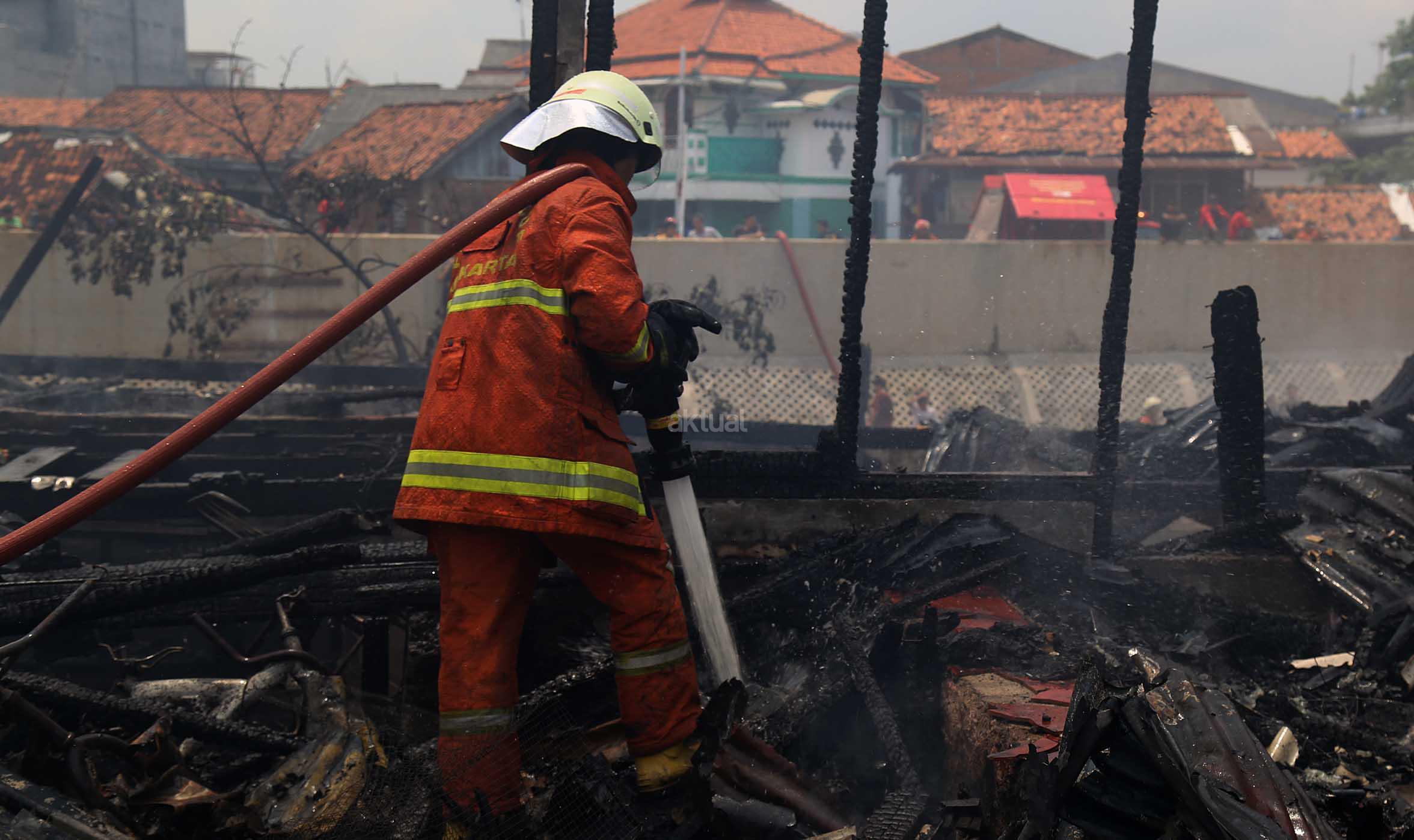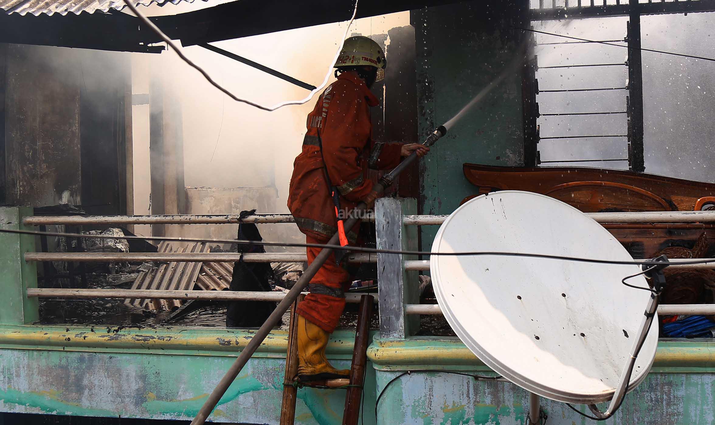 Seorang petugas pemadam kebakaran melakukan pendinginan titik api yang membakar pemukiman pada penduduk di Kelurahan Bukit Duri, Jakarta Selatan, Selasa (23/2/2016). Dugaan, kebakaran yang melanda kawasan tersebut disebabkan konsleting listrik dari salah satu rumah warga dan sedikitnya 42 mobil pemadam sudah dikerahkan untuk memadamkan kobaran api.
