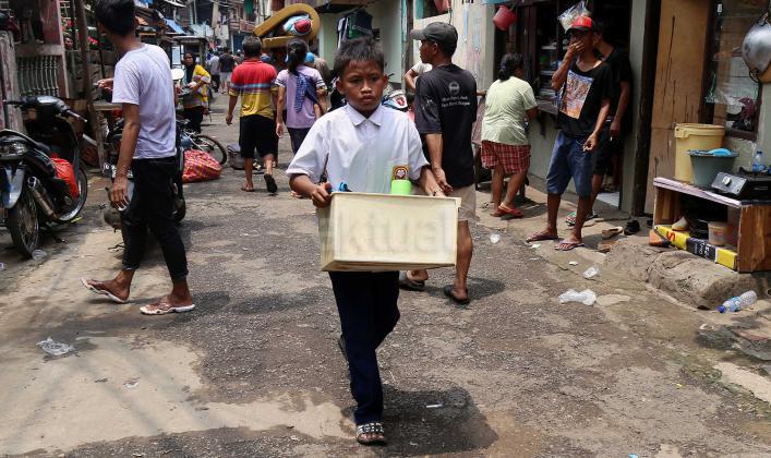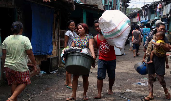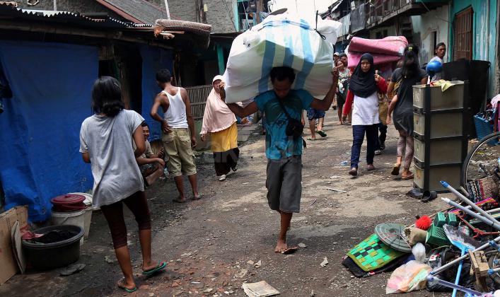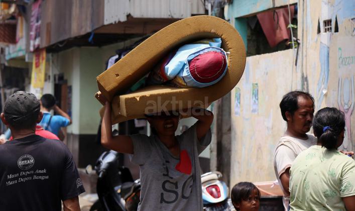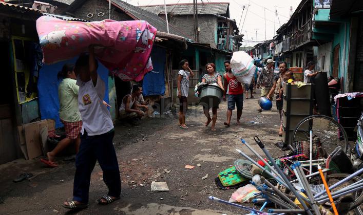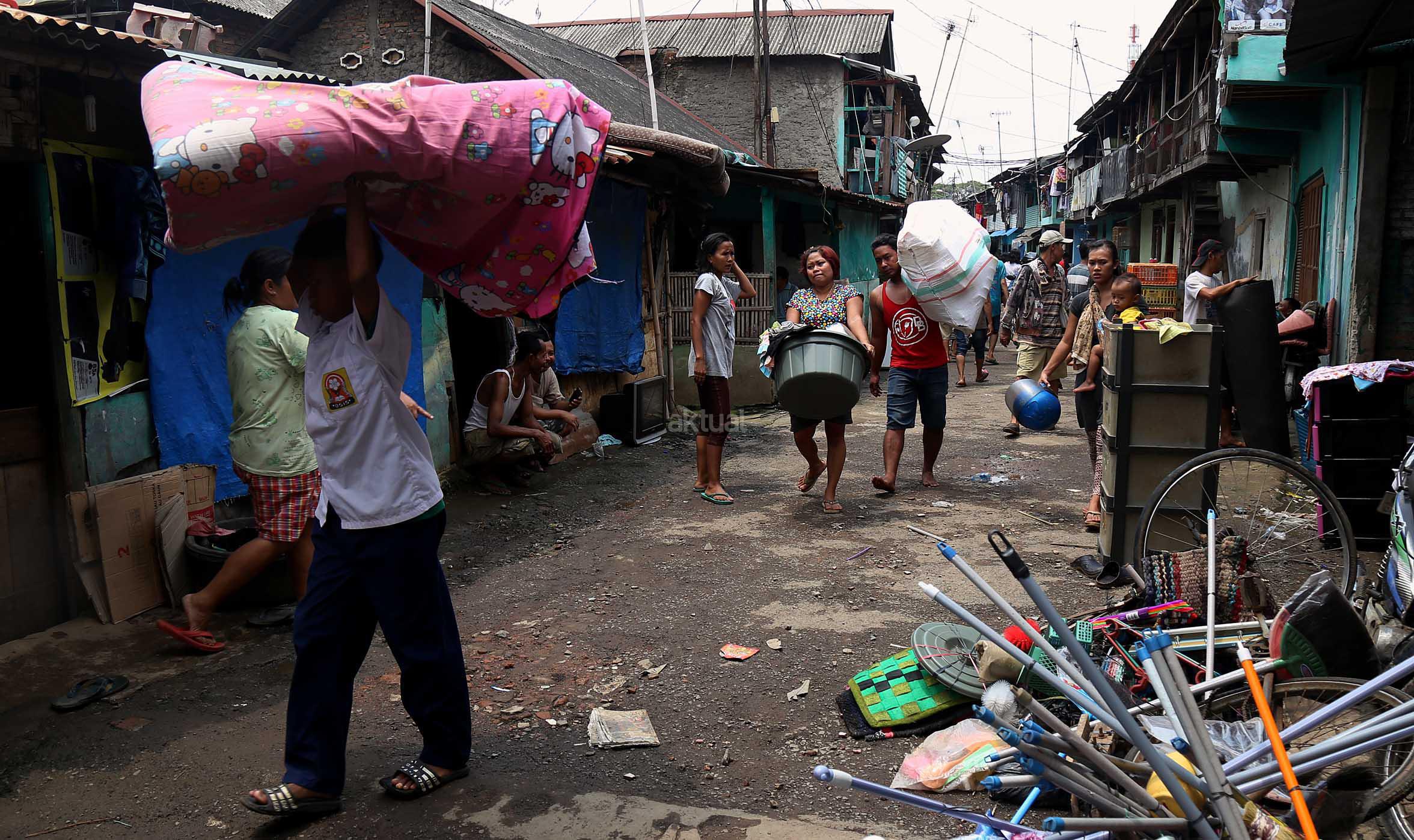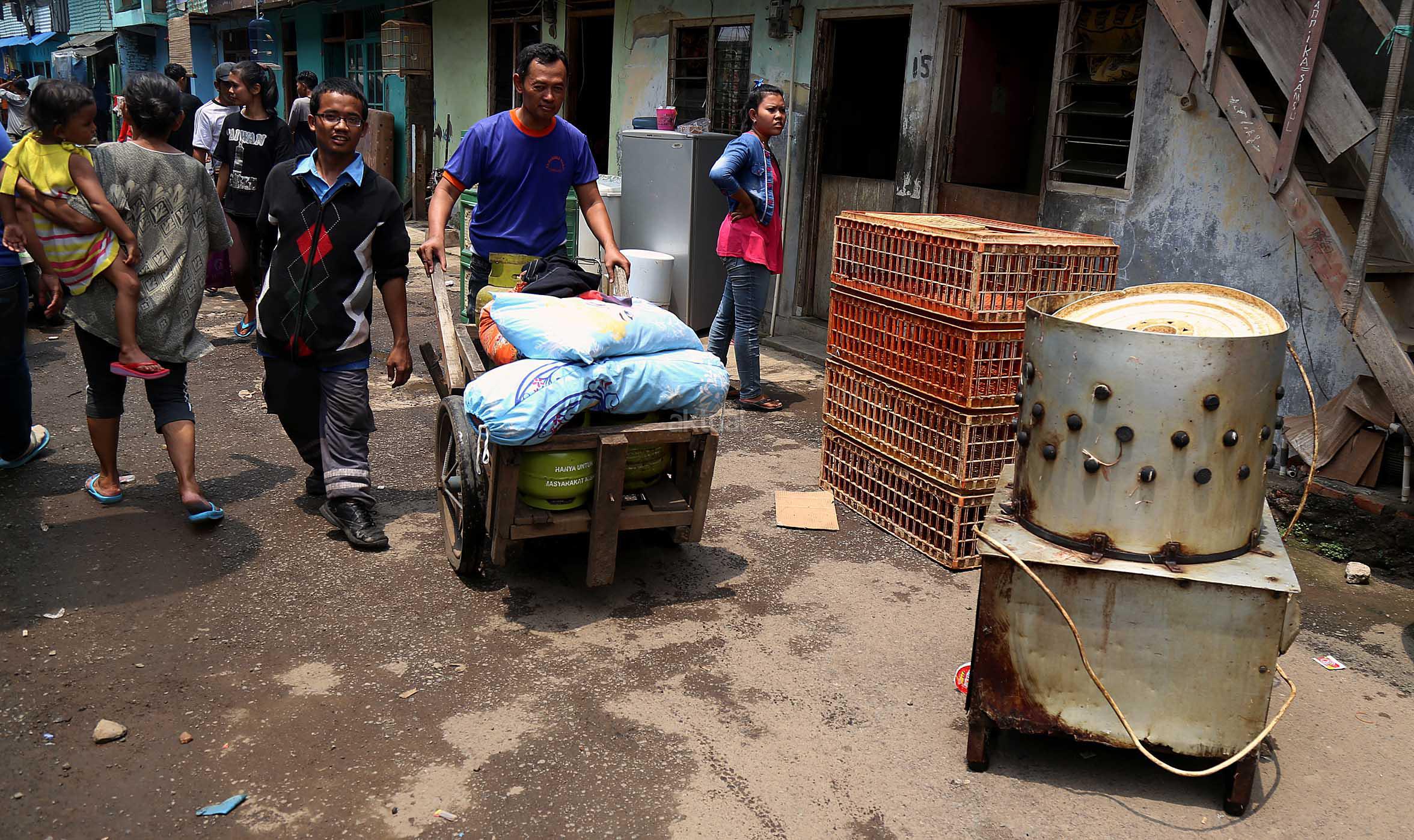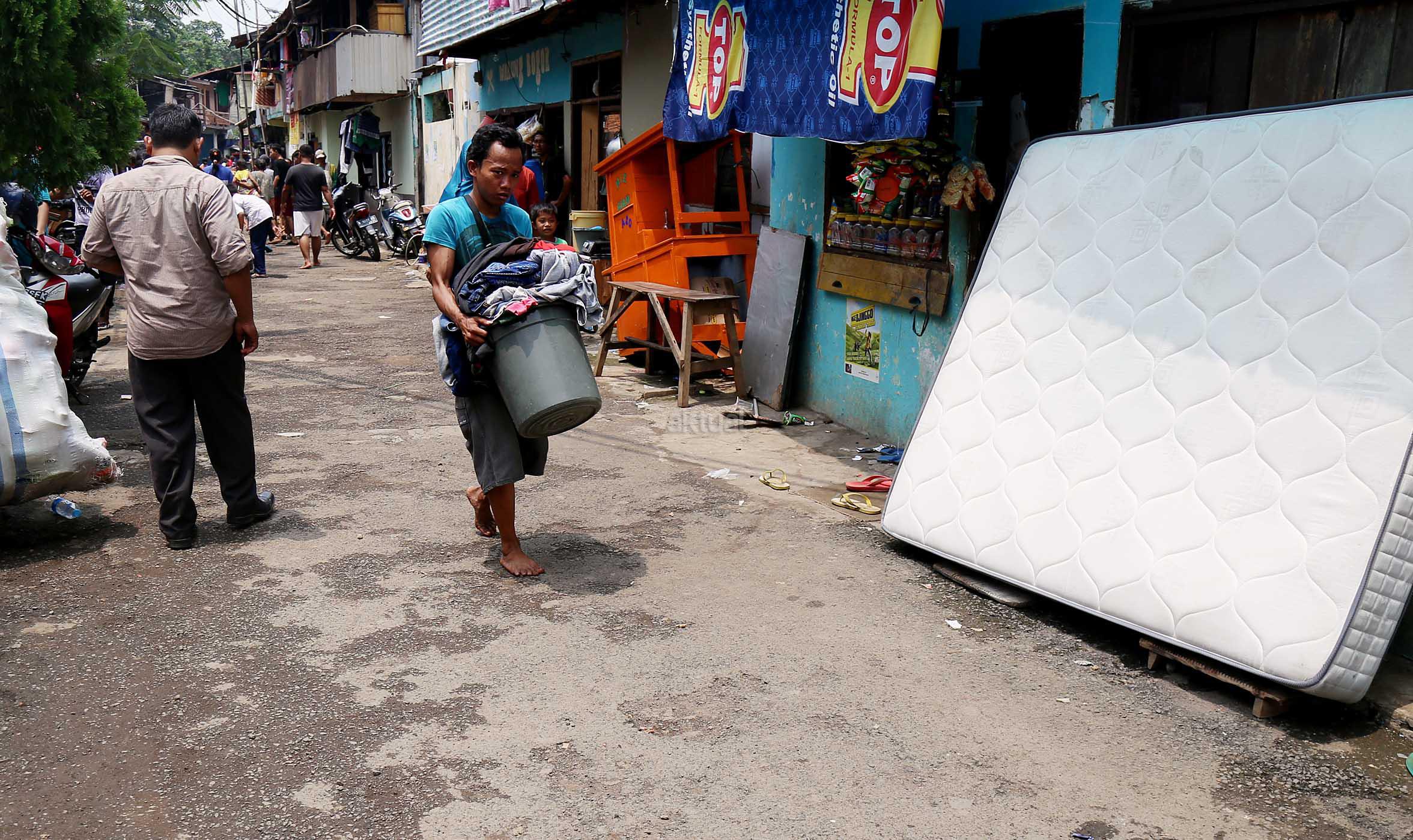 Para warga berusaha menyelamatkan barang-barangnya dari si jago yang membakar pemukiman padat penduduk di Kelurahan Bukit Duri, Jakarta Selatan, Selasa (23/2/2016). Dugaan, kebakaran yang melanda kawasan tersebut disebabkan konsleting listrik dari salah satu rumah warga dan sedikitnya 42 mobil pemadam sudah dikerahkan untuk memadamkan kobaran api.