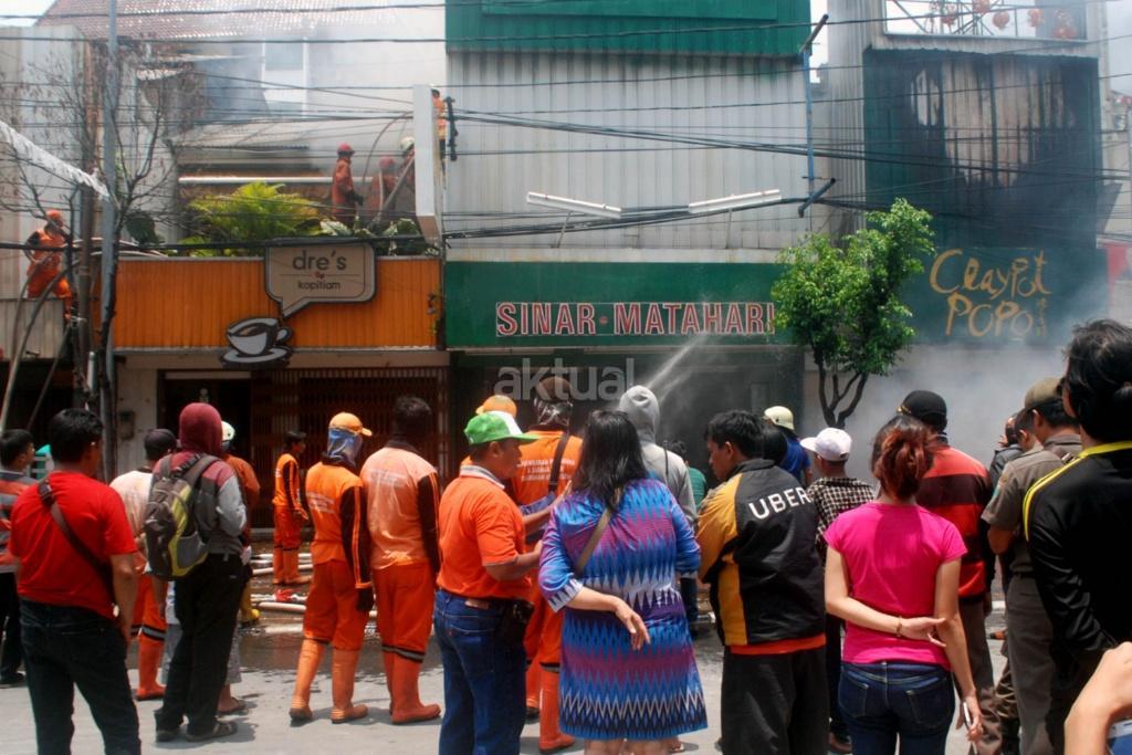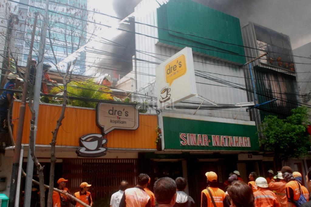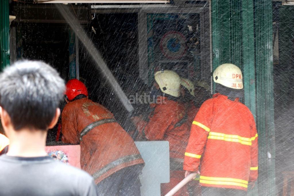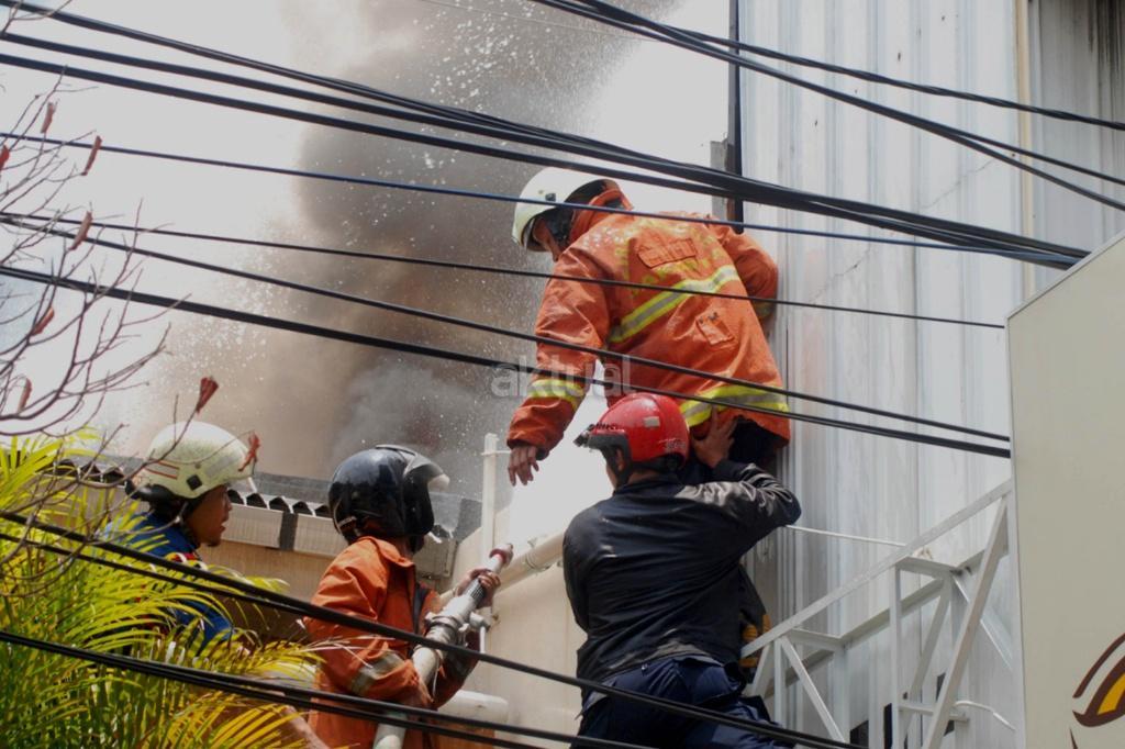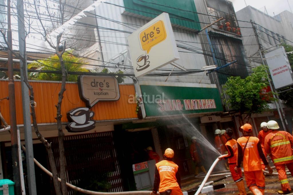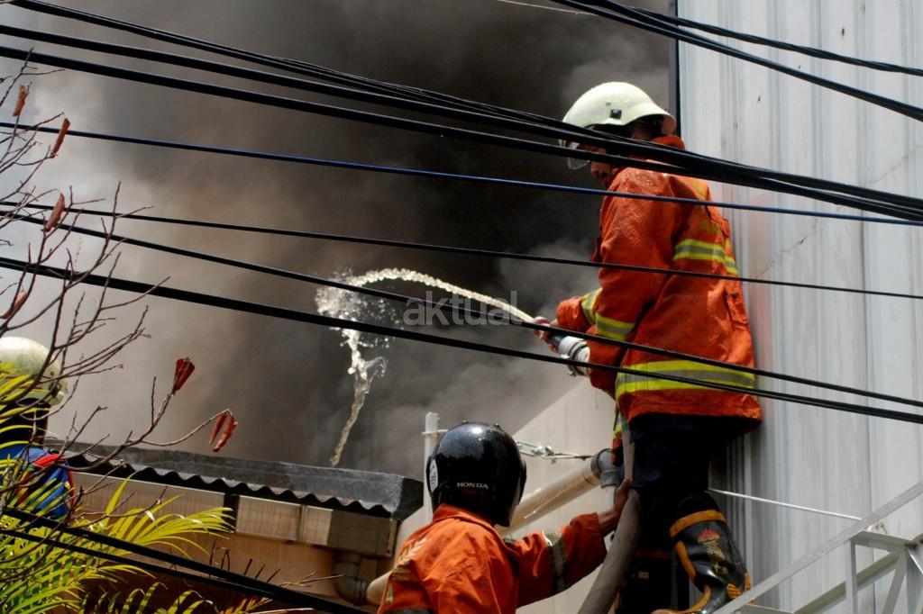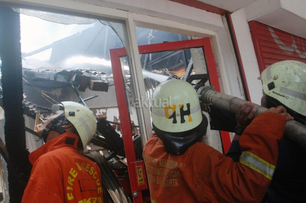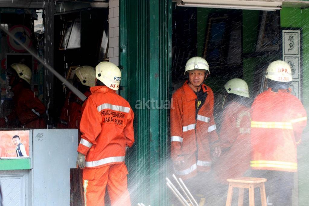 Petugas melakukan pemadaman api yang melahap sedikitnya lima unit ruko di kawasan Jalan Sabang, Kebon Sirih, Jakarta Pusat, Minggu (8/10/2017). Penyebab kejadian belum diketahui termasuk korban jiwa dan nilai kerugian. AKTUAL/Munzir