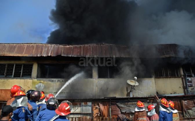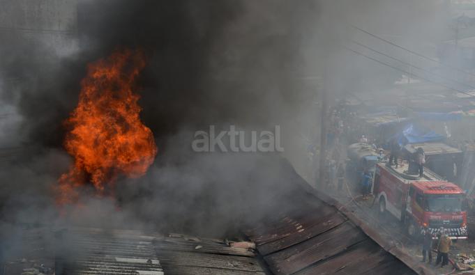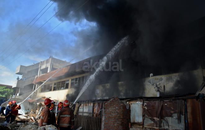 Petugas pemadam kebakaran berupaya memadamkan api yang membakar kompleks rumah toko di kawasan Pasar Kanjengan Semarang, Jateng, Sabtu (18/6). Penyebab kebakaran yang melanda belasan ruko tersebut diduga berasal dari hubungan pendek pendek listrik. ANTARA FOTO/R. Rekotomo/ama/16.