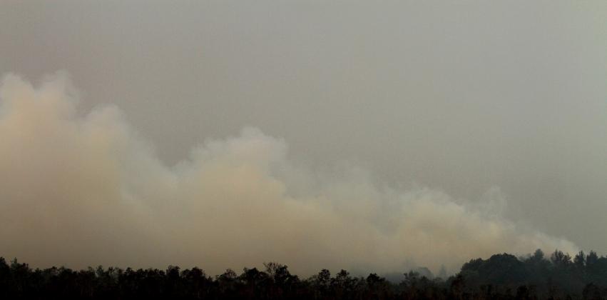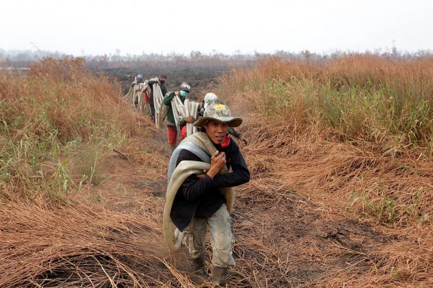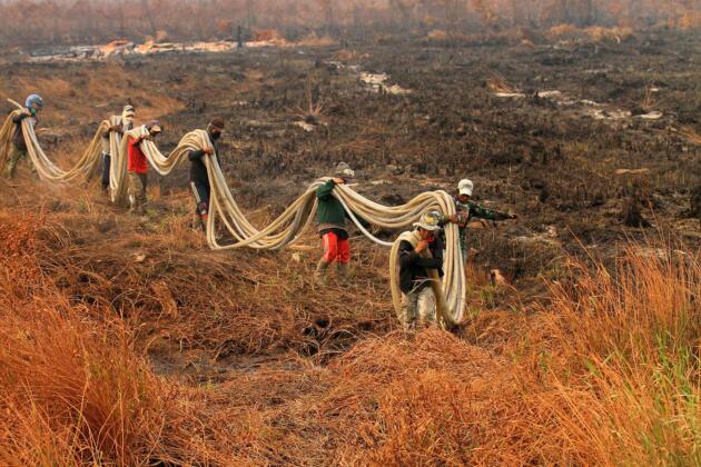 Sejumlah pekerja mengangkat selang seusai memadamkan kebakaran lahan di Desa Pulo Geronggang, Ogan Komering Ilir (OKI), Sumatera Selatan, Jumat (11/9). Sebanyak 276 titik api di Kabupaten OKI terpantau oleh satelit AQUA/TERRA MODIS milik BMKG dan 588 titik api di Provinsi Sumatera Selatan. ANTARA FOTO/Nova Wahyudi/foc/15