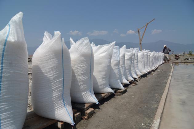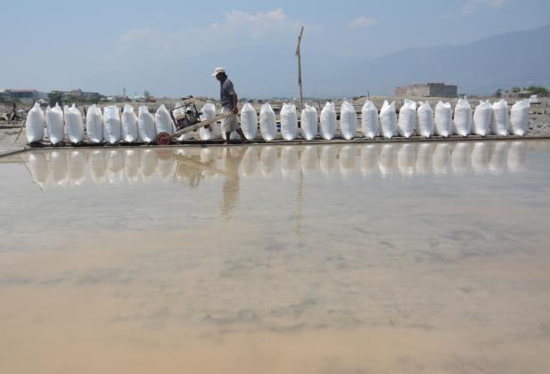 Petani mendorong gerobak di dekat garam yang baru dipanen di Palu, Sulawesi Tengah, Selasa (6/10). Kementerian Perindustrian menyebutkan, kebutuhan garam untuk industri meningkat setiap tahun sedikitnya sebesar 50.000 dan karena itu pihakya belum bisa menutup keran impor untuk memenuhi kebutuhan industri tersebut. ANTARA FOTO/Basri Marzuki/pd/15