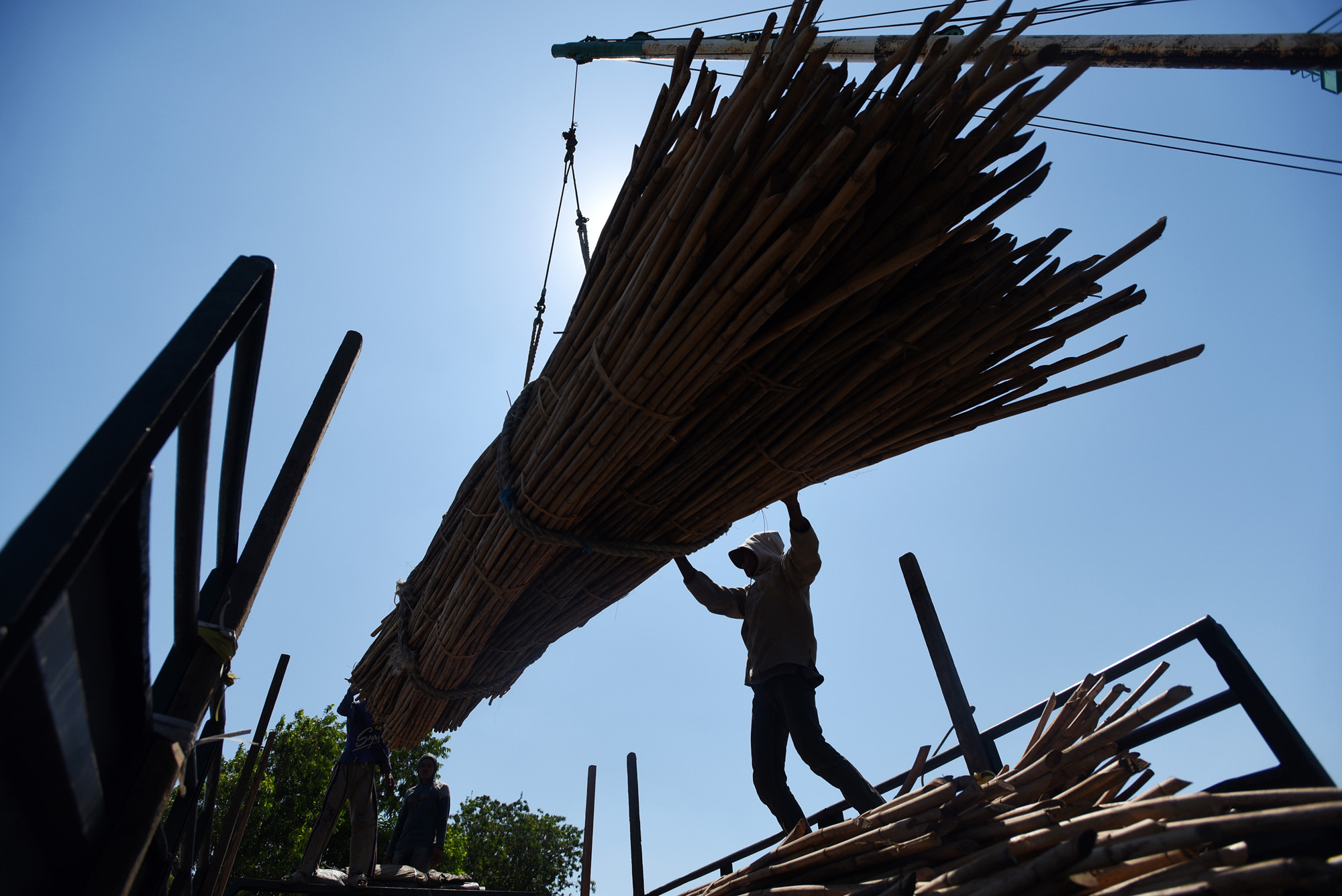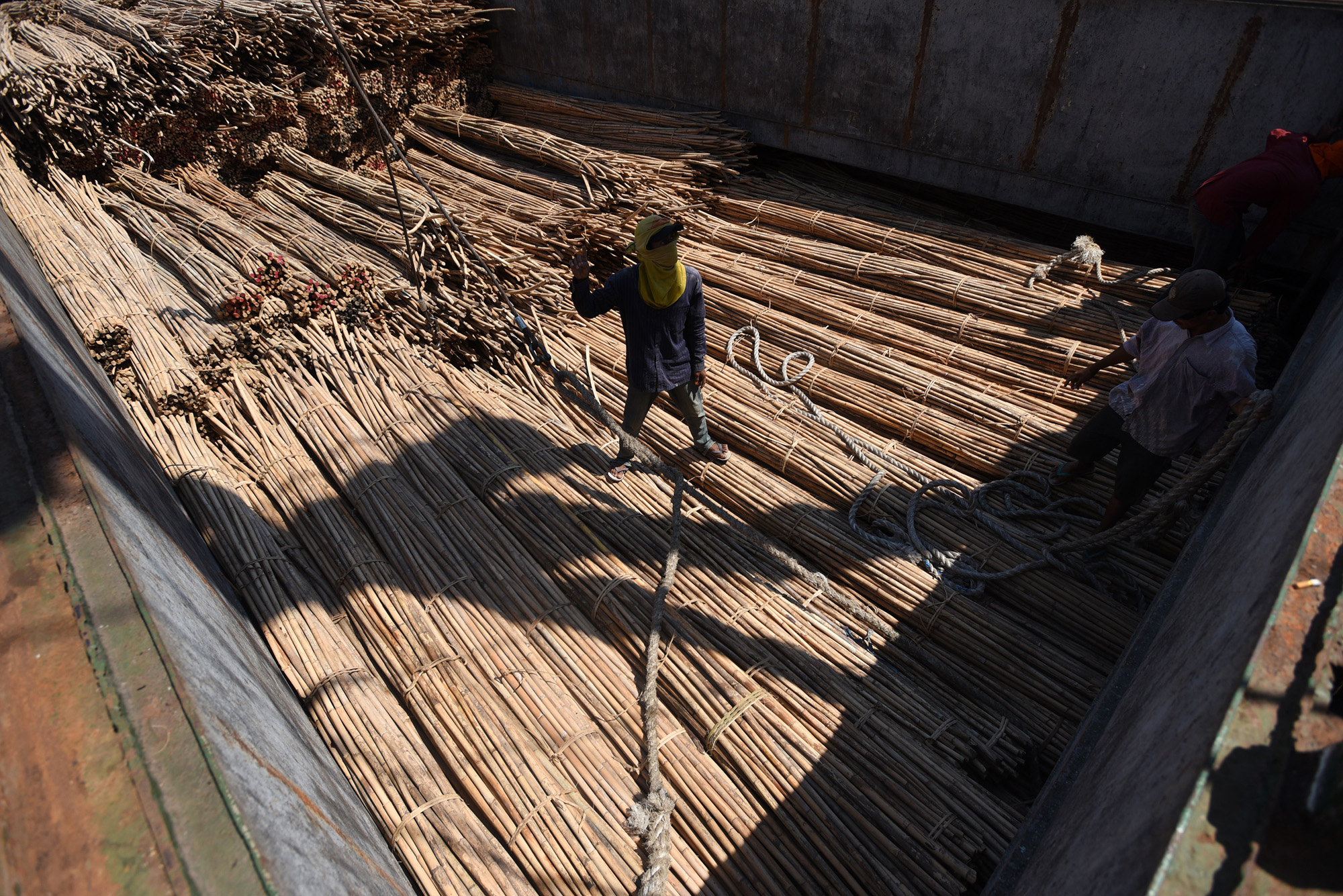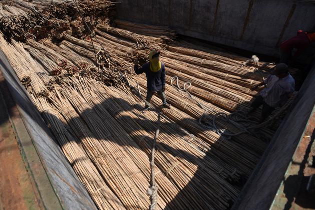 Pekerja menurunkan rotan dari lumbung kapal ke truk di Pelabuhan Rakyak Kalimas, Surabaya, Jawa Timur, Senin (21/9). Rotan yang berasal dari Sulawesi Tenggara tersebut untuk memenuhi kebutuhan industri mebel di Jawa Timur. ANTARA FOTO/Zabur Karuru/foc/15.
