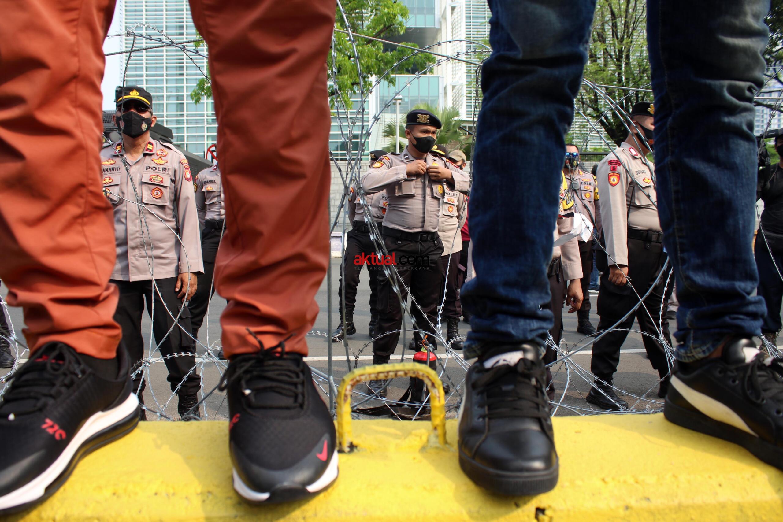 Aksi yang diikuti oleh ribuan demonstran di Kedutaan Besar Amerika Serikat, di Jl Medan Merdeka Selatan, Jakarta Pusat, Jumaat (21/5), juga mendapat pengawalan ketat dari sejumlah aparat kepolisian yang bertugas dilapangan. Unjuk rasa berjalan tertib, namun sejumlah ruas jalan harus mengalami blokade untuk menghindari antrian panjang kendaraan di Jl Medan Merdeka Selatan. (Foto: AKTUAL/WARNOTO)
