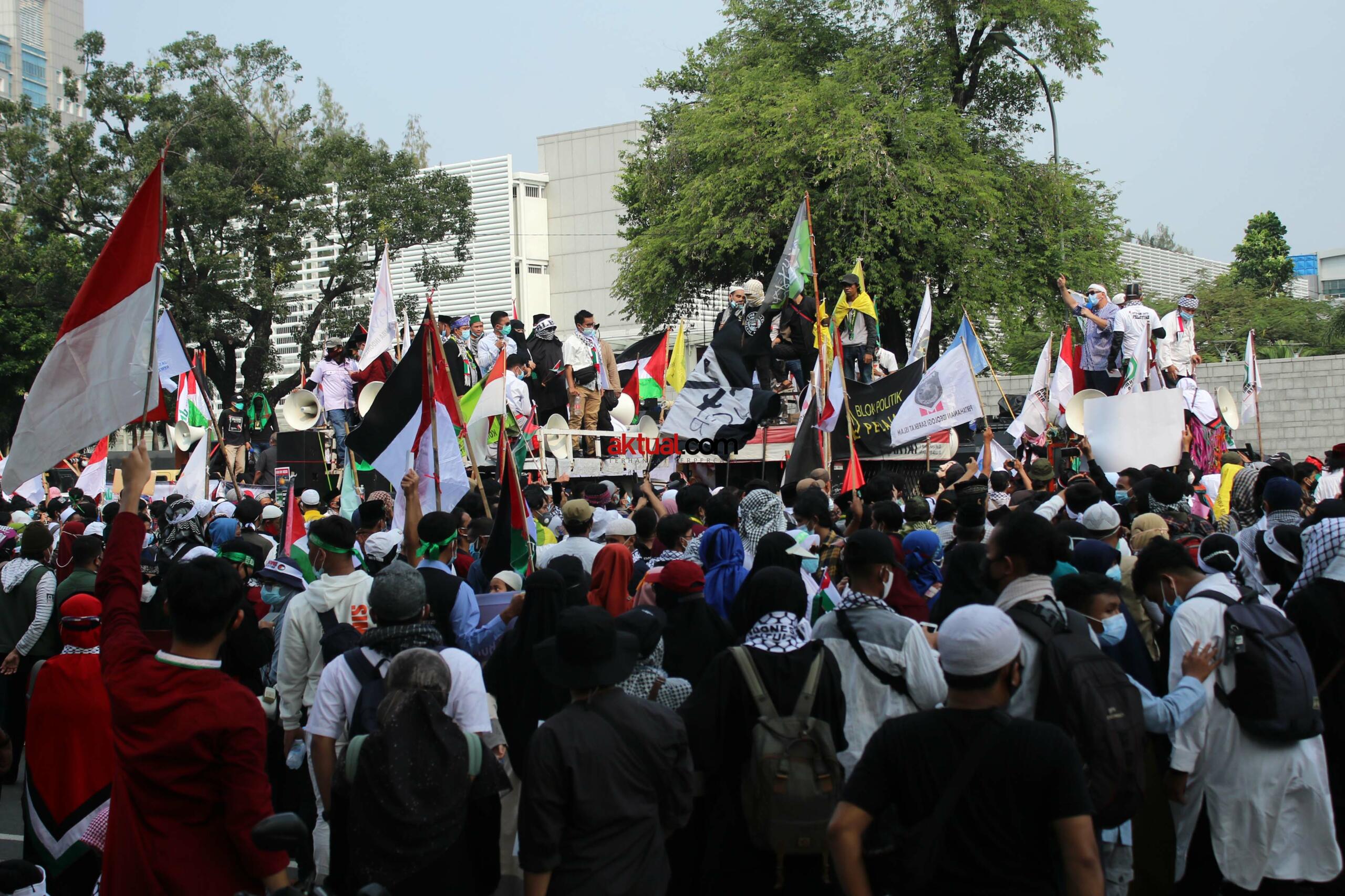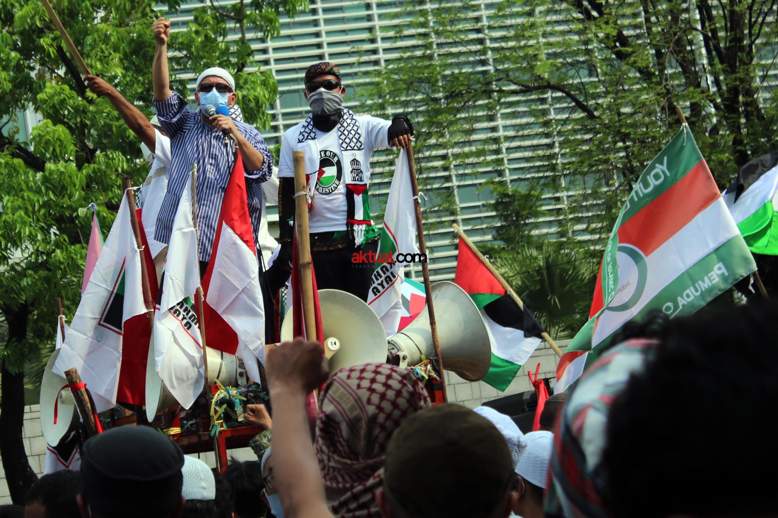 Orator dan massa aksi kecam dan mengutuk tindak kekerasan Zionis Israel, di Kedutaan Besar Amerika Serikat, di Jl Medan Merdeka Selatan, Jakarta Pusat, Jumaat (21/5).