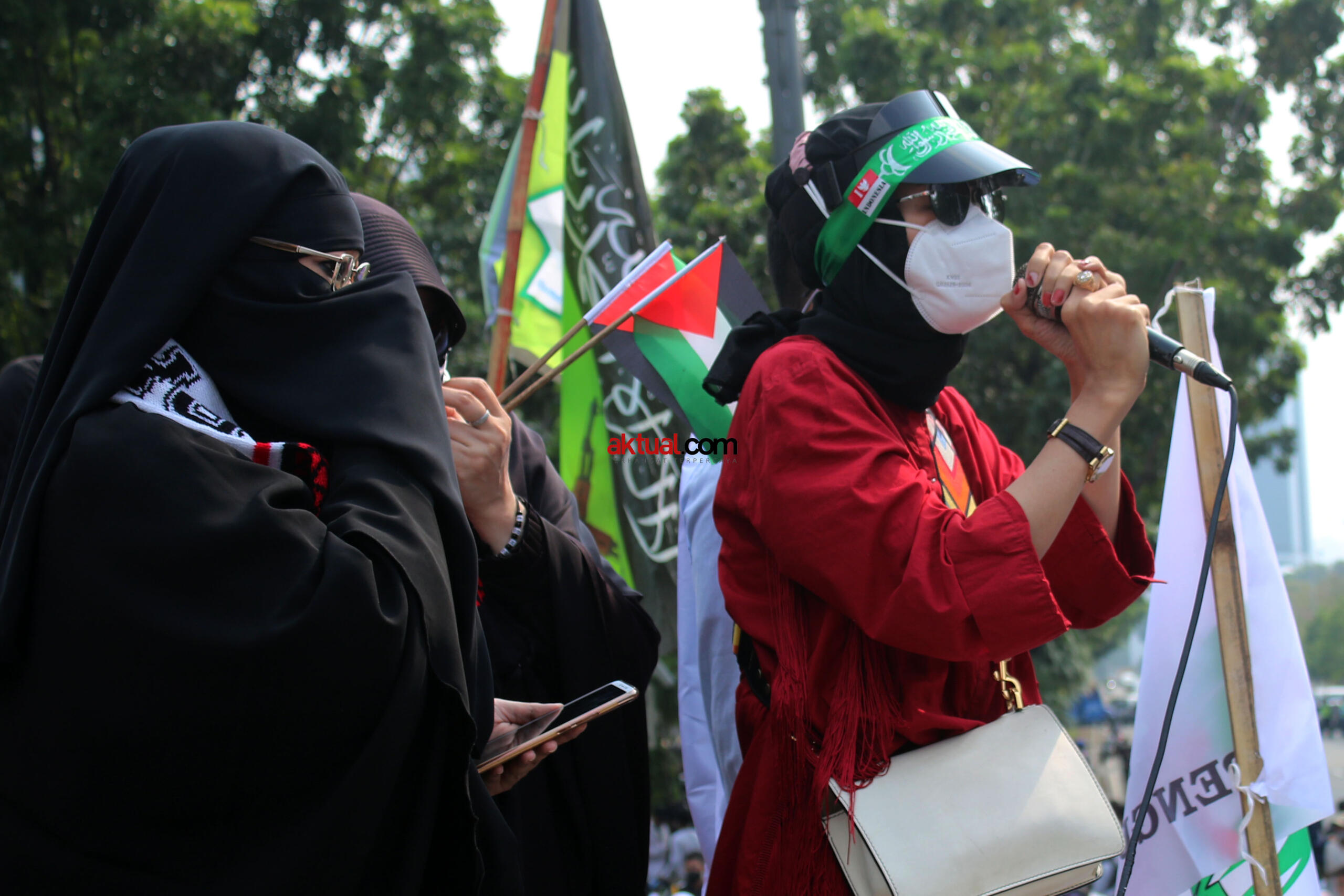 Orator wanita, berorasi diatas mobil komando, mengecam dan mengutuk aksi brutal tentara Zionis Israel terhadap rakyat Palestina, di Kedutaan Besar Amerika Serikat, di Jl Medan Merdeka Selatan, Jakarta Pusat, Jumaat (21/5).