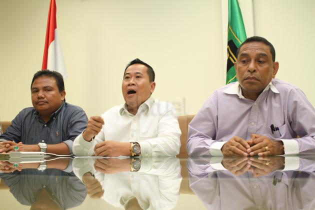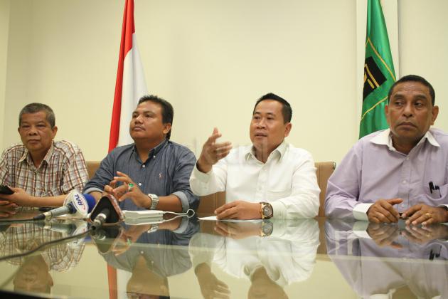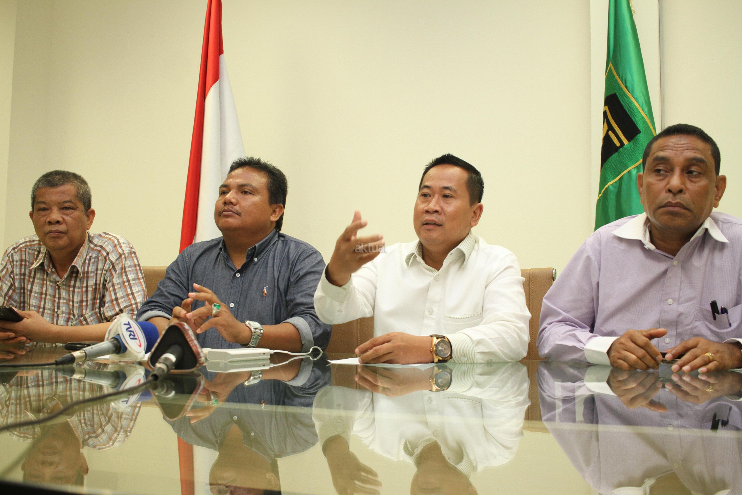 Wakil Sekjen PPP Sudarto (baju puti) didampingi Ketua DPP PPP Bidang Komunikasi dan Informasi PPP Achmad Ghazali (kedua kiri) memberikan keterangan pers menyikapi pernyataan Persaudaraan Muslimin Indonesia (Parmusi) yang ingin mengislahkan kedua kubu PPP di Kantor DPP PPP di Jakarta, Senin (21/3). Mereka mengecam sikap tersebut dan menilai Parmusi tidak berkompeten menanggapi islah PPP karena bukan bagian dari internal partai.