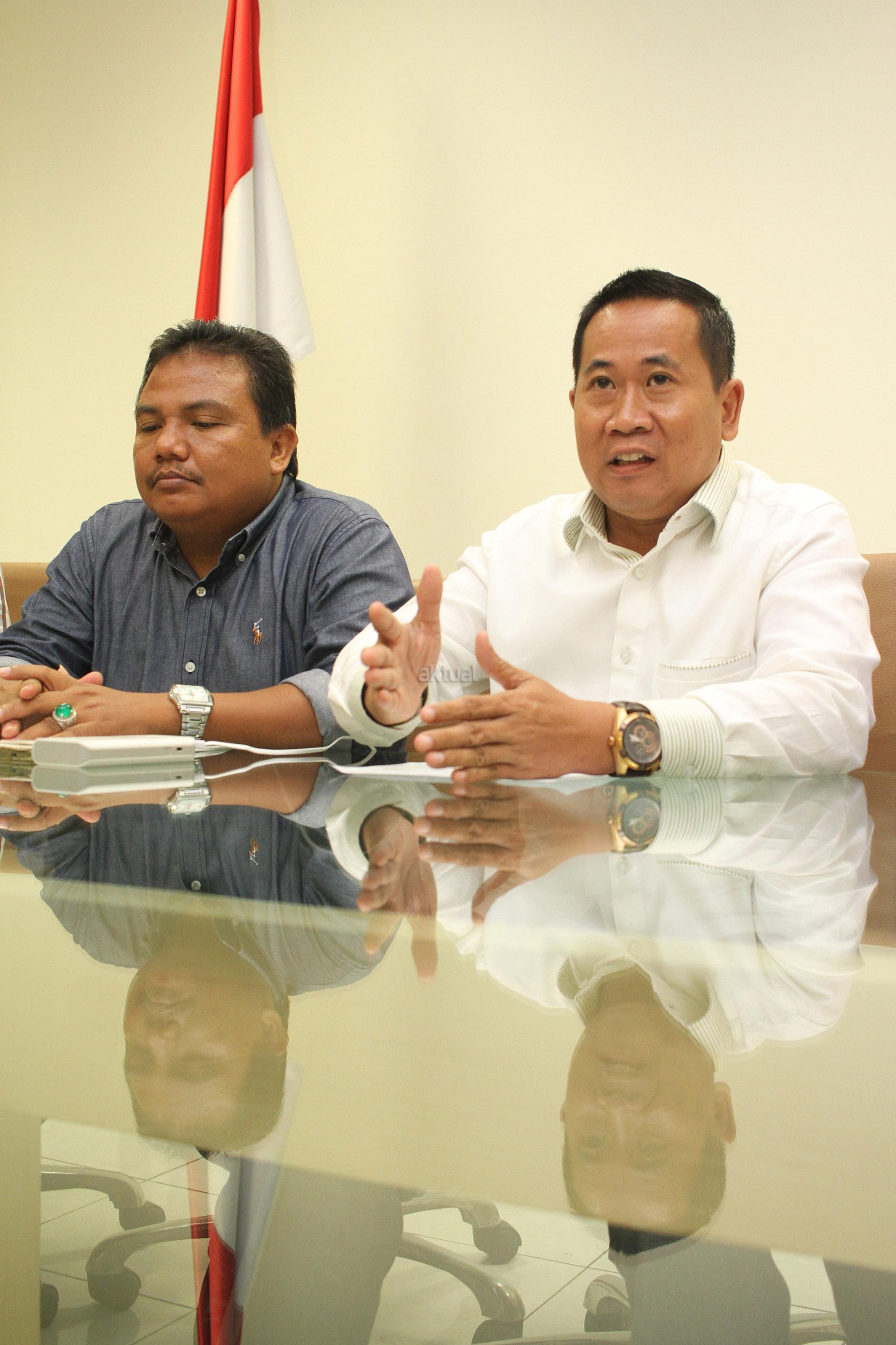 Wakil Sekjen PPP Sudarto (kanan) didampingi Ketua DPP PPP Bidang Komunikasi dan Informasi PPP Achmad Ghazali (kiri) memberikan keterangan pers menyikapi pernyataan Persaudaraan Muslimin Indonesia (Parmusi) yang ingin mengislahkan kedua kubu PPP di Kantor DPP PPP di Jakarta, Senin (21/3). Mereka mengecam sikap tersebut dan menilai Parmusi tidak berkompeten menanggapi islah PPP karena bukan bagian dari internal partai.