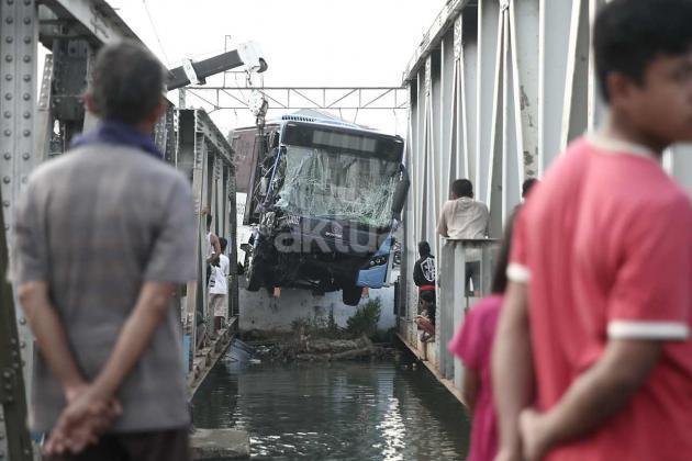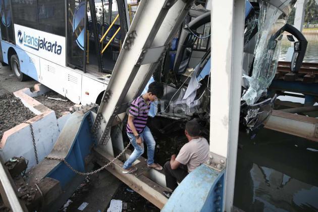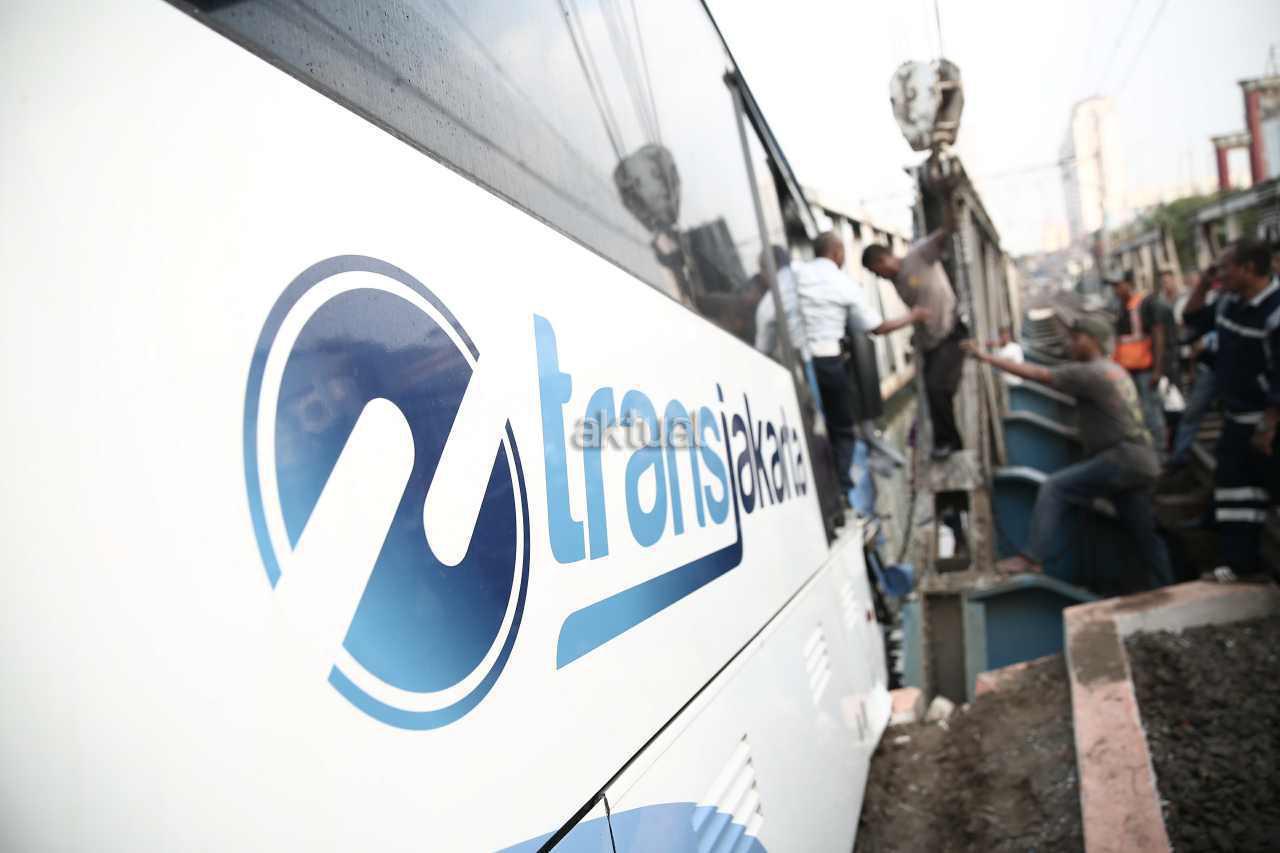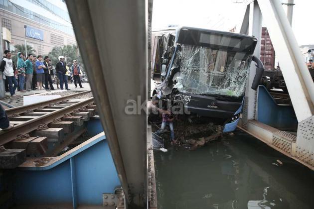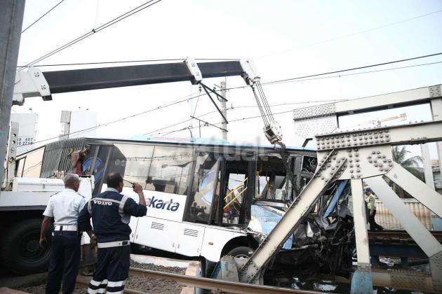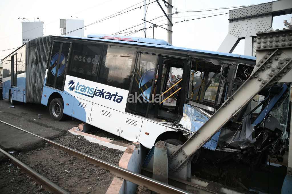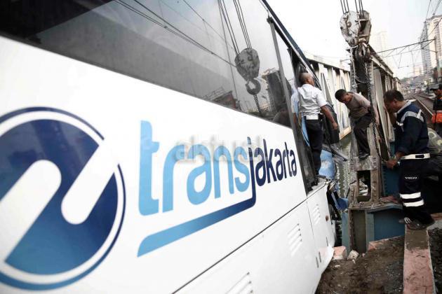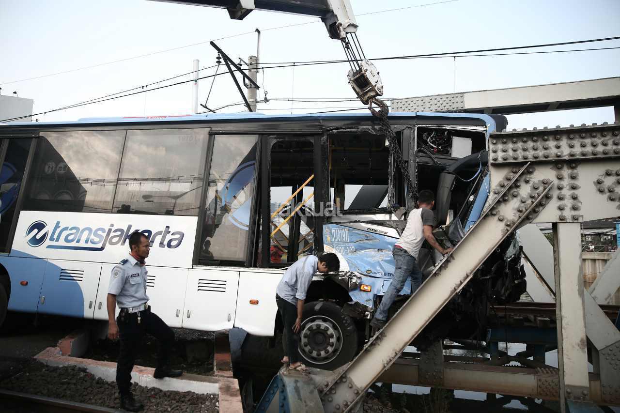 Petugas melakukan evakuasi bus Transjakarta gandeng yang mengalami kecelakaan di perlintasan kereta api Gunung Sahari, Jakarta, Kamis (19/5). Kecelakaan yang melibatkan bus Transjakarta dengan kereta api jarak jauh Senja Solo ini dikarenakan supir bus Transjakarta yang menerobos palang pintu perlintasan. AKTUAL/TINO OKTAVIANO