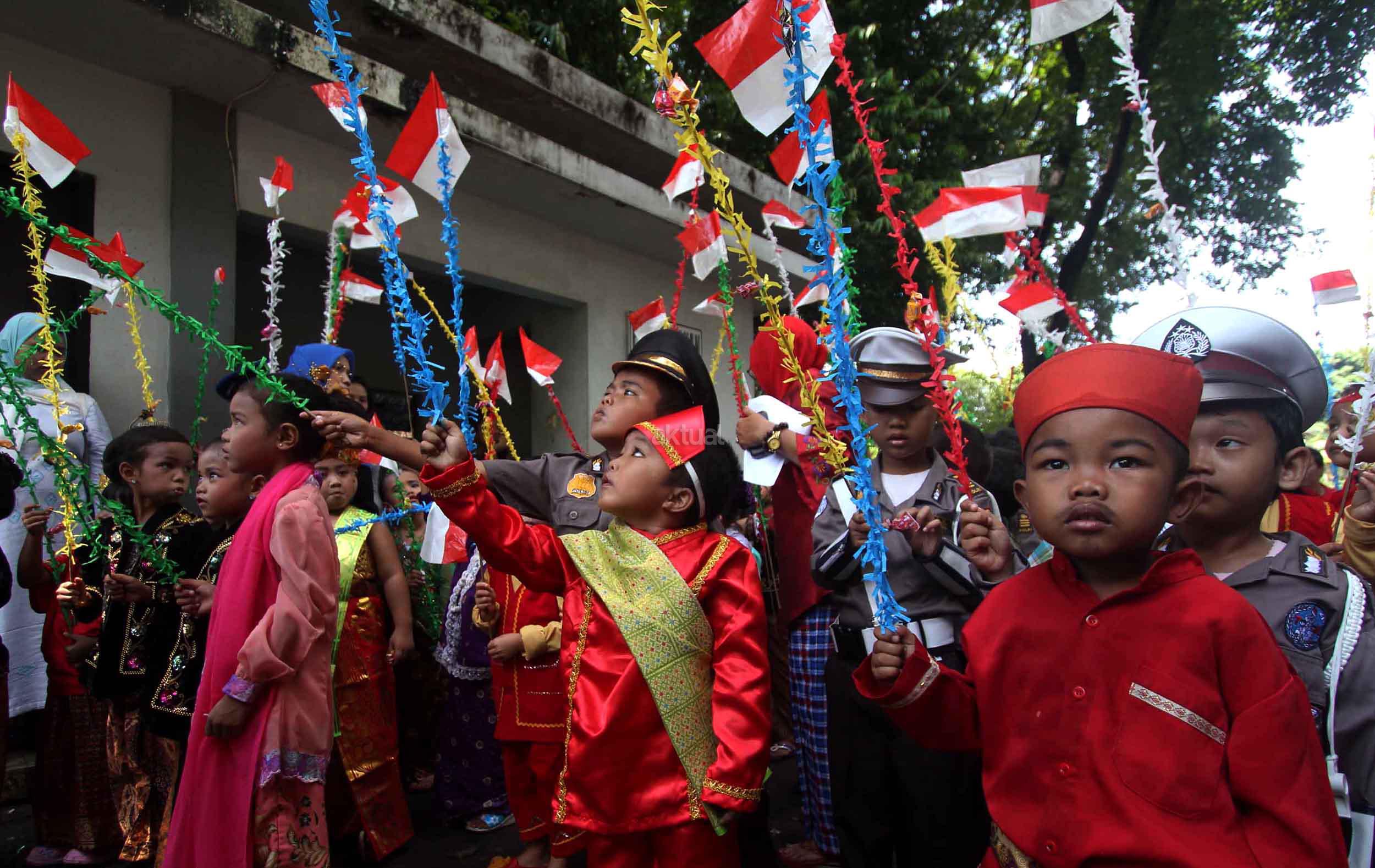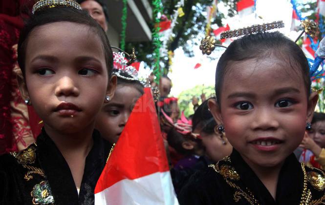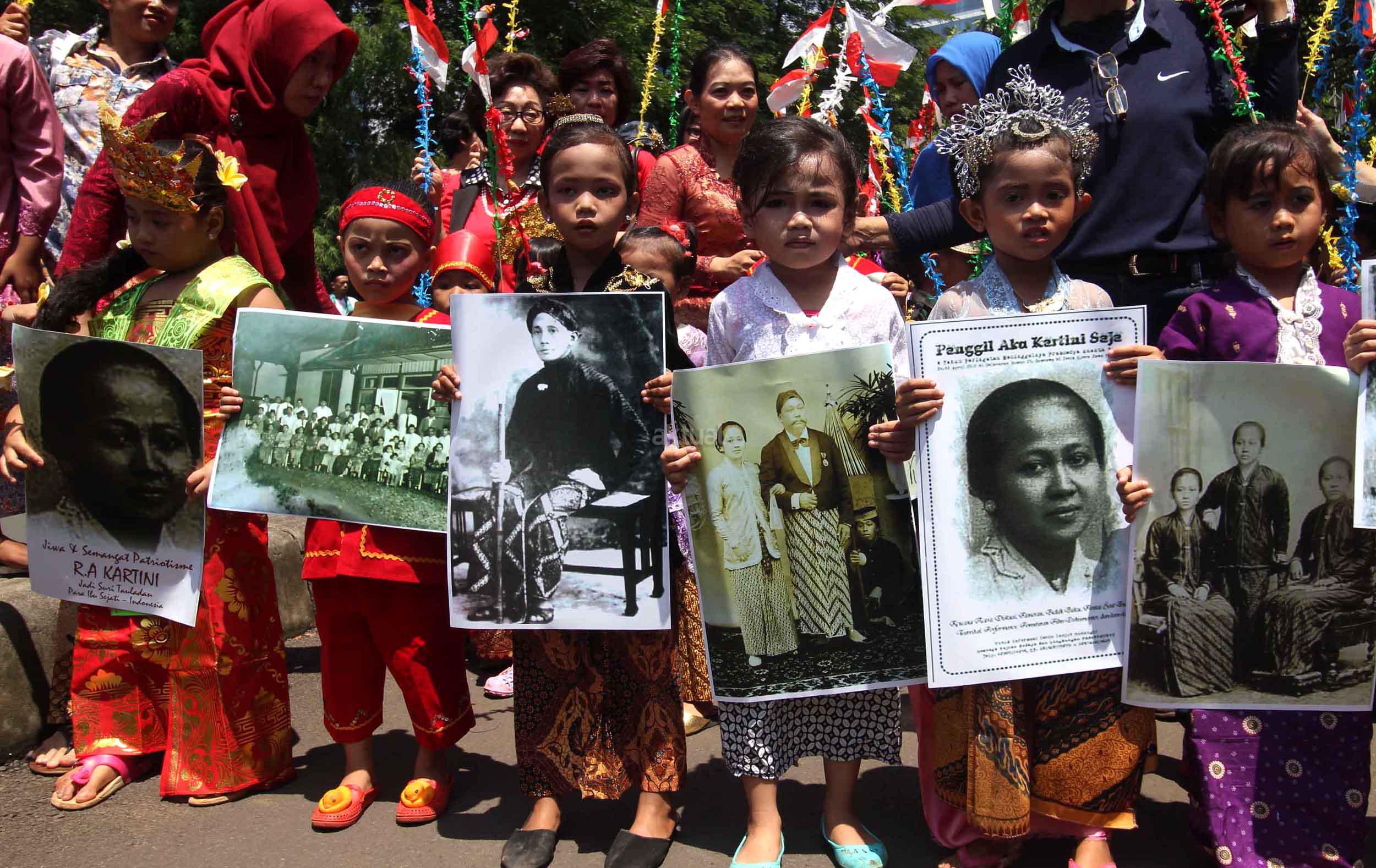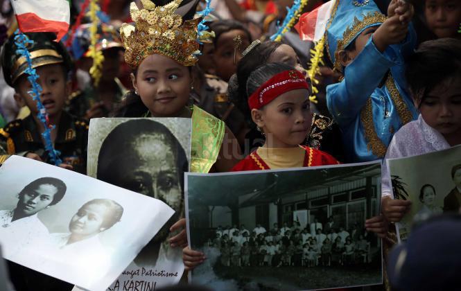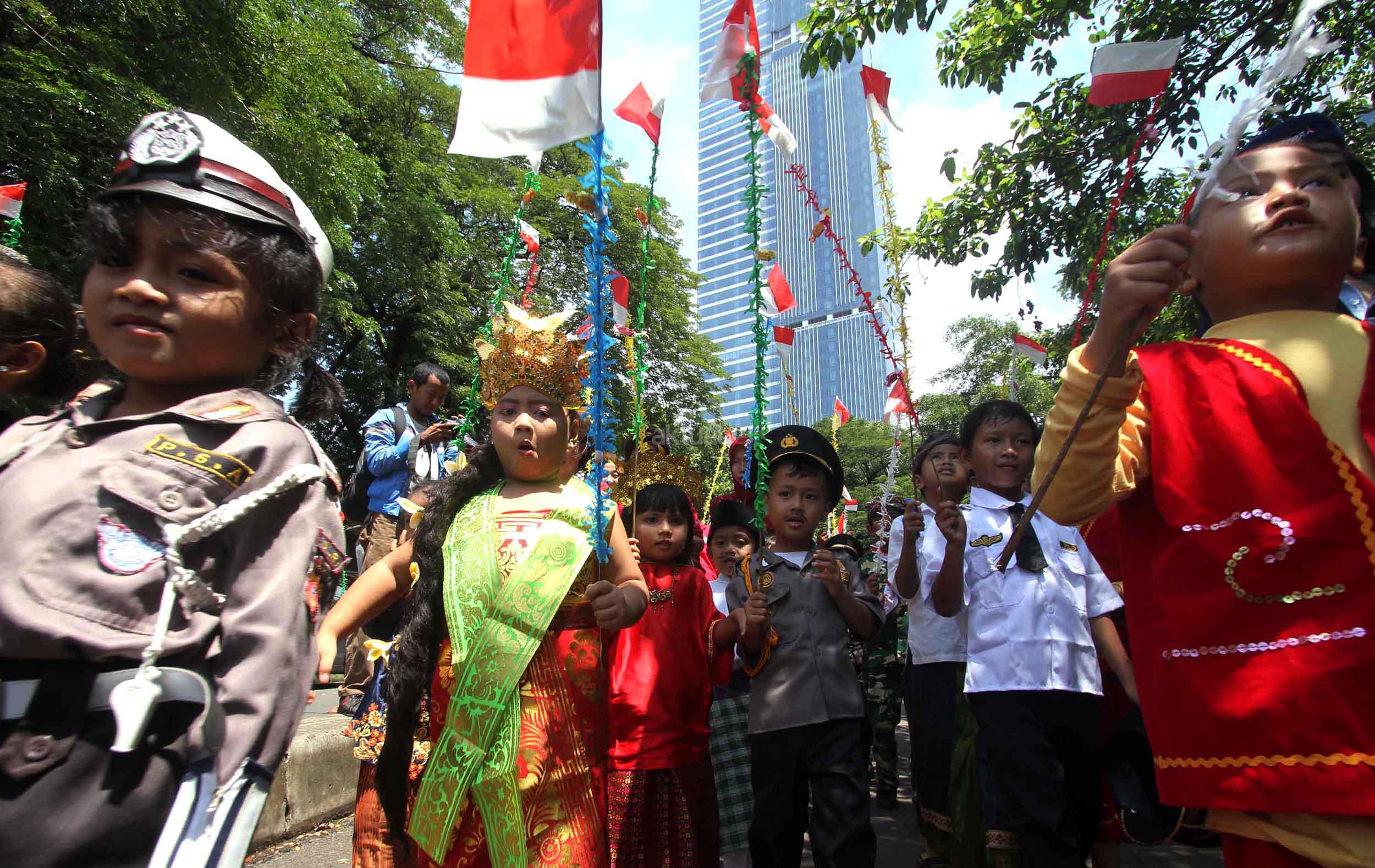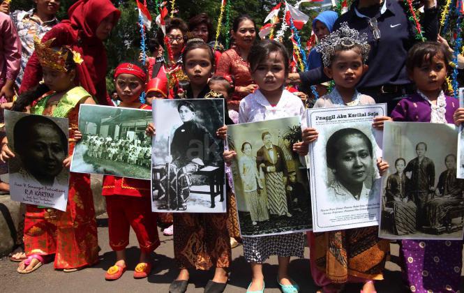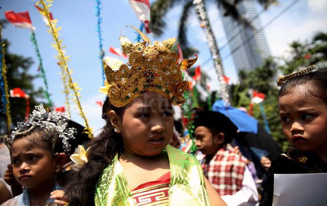 Murid-murid TK Sekolah Alternatif untuk Anak Jalanan (SAAJA) saat pawai sambil mengenakan pakaian adat di kawasan Kuningan, Jakarta, Kamis (21/4/2016). Pawai tersebut dilakukan dalam rangka merayakan Hari Kartini yang jatuh pada 21 April.